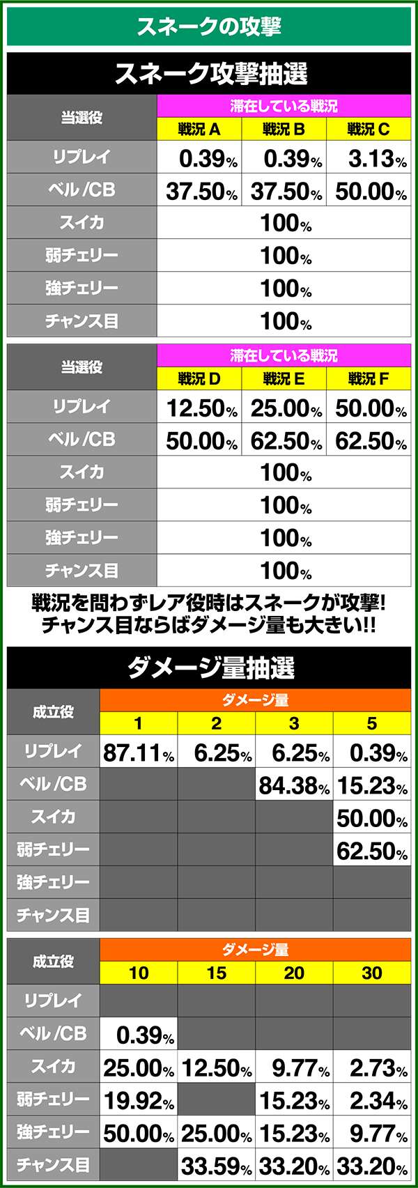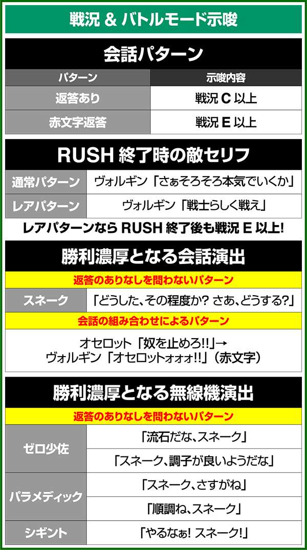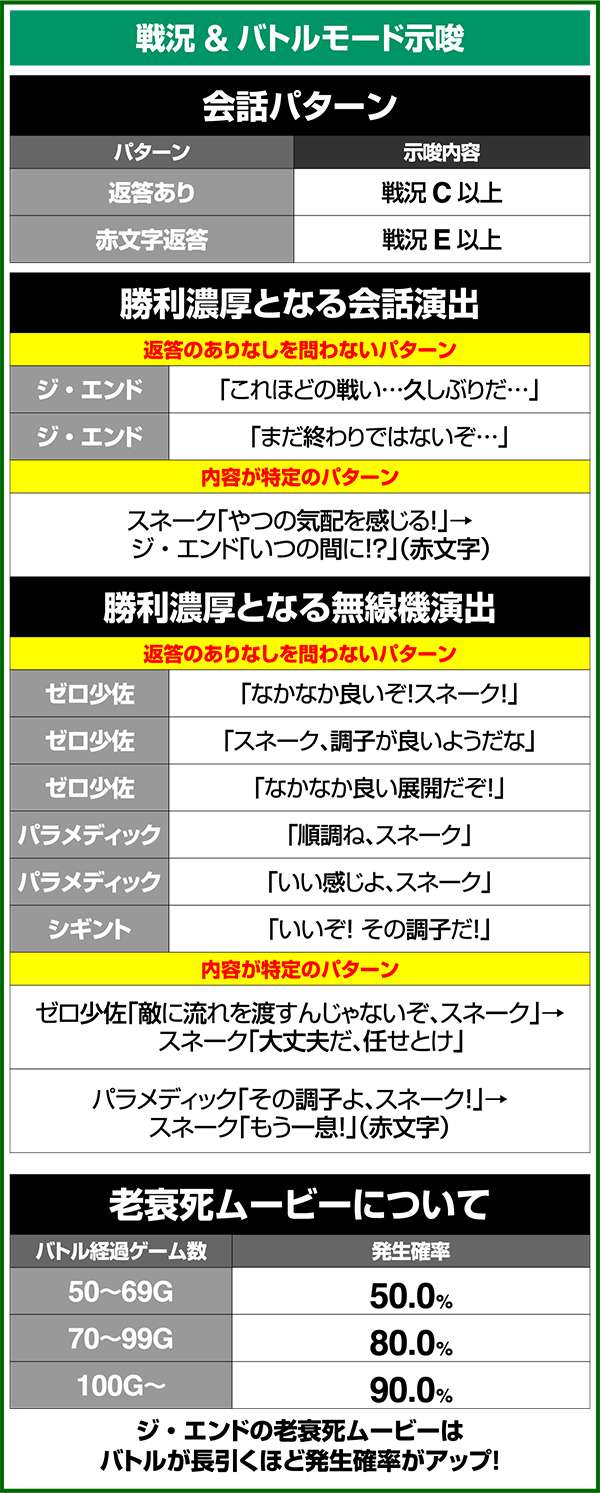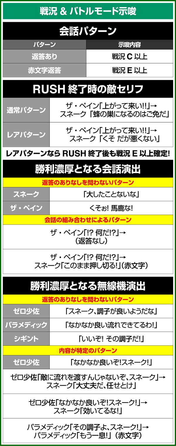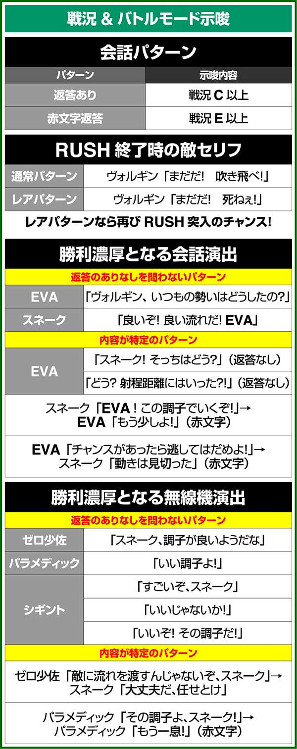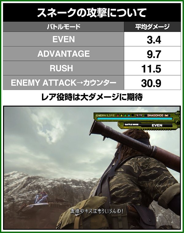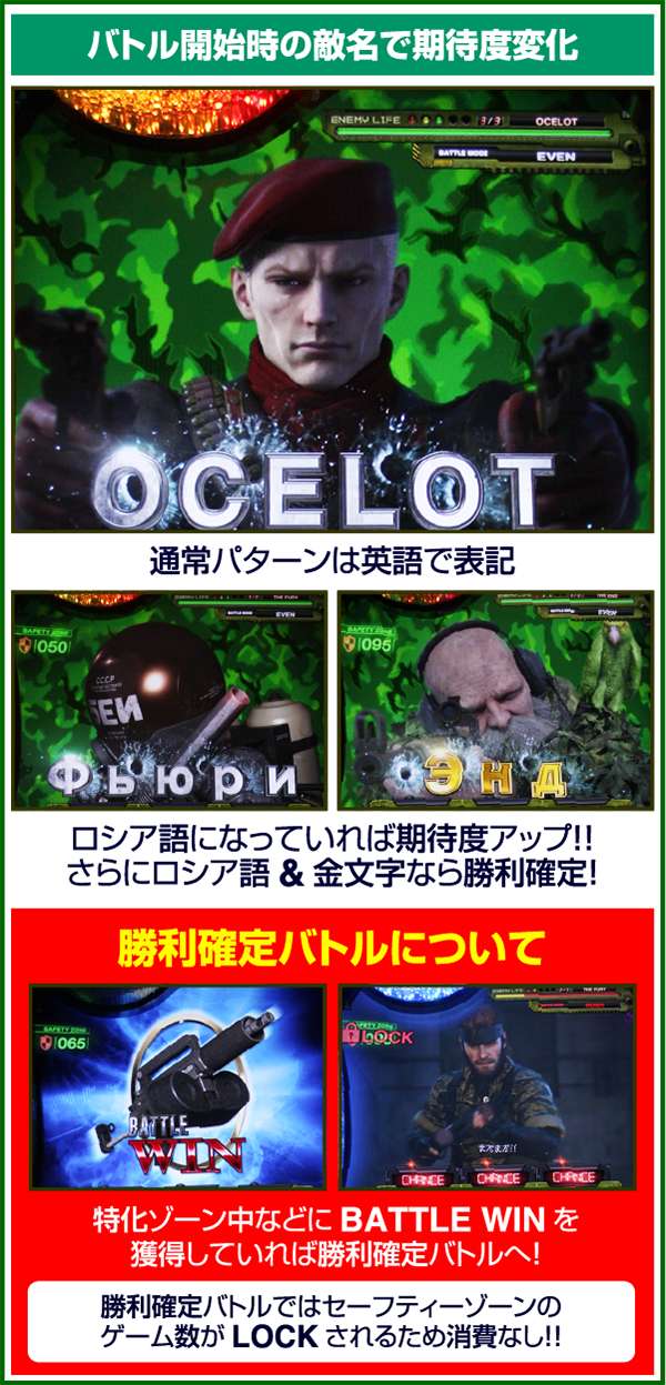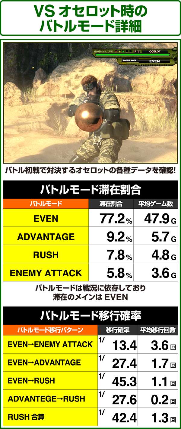 バトルには内部的な「有利」・「不利」という状態があり、まず対戦相手に依存した状況からスタート。以降はベルやレア役を引けば優位な状態に近づき、逆にリプレイが頻発すると不利な状態へ移行しやすくなる。成立役によって綱引きをしているイメージで、有利な状況であればスネークの攻撃機会が増え、リプレイでも敵にダメージを与えることがある。