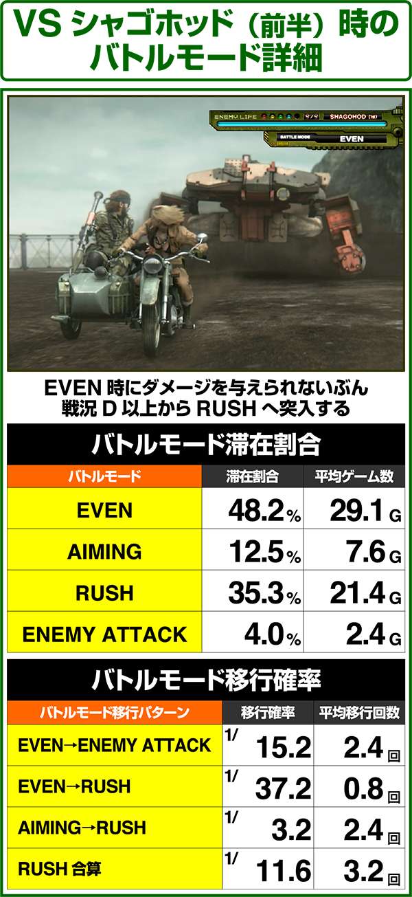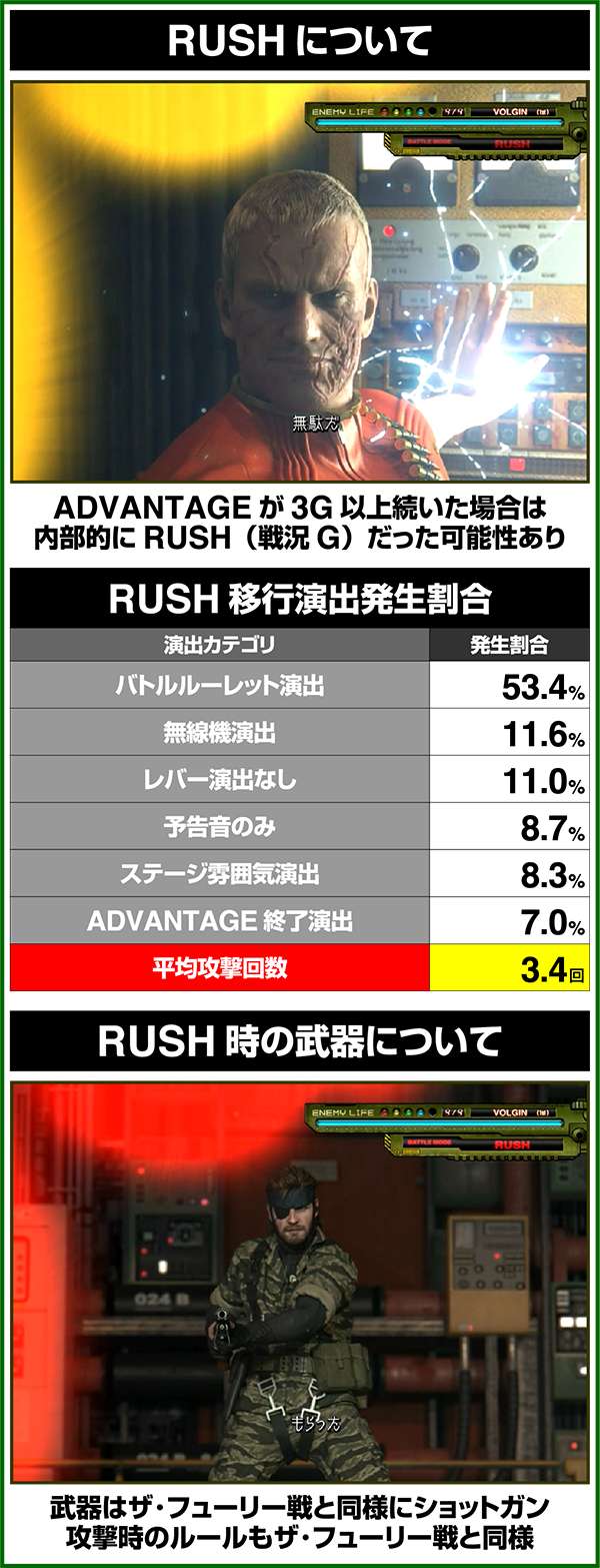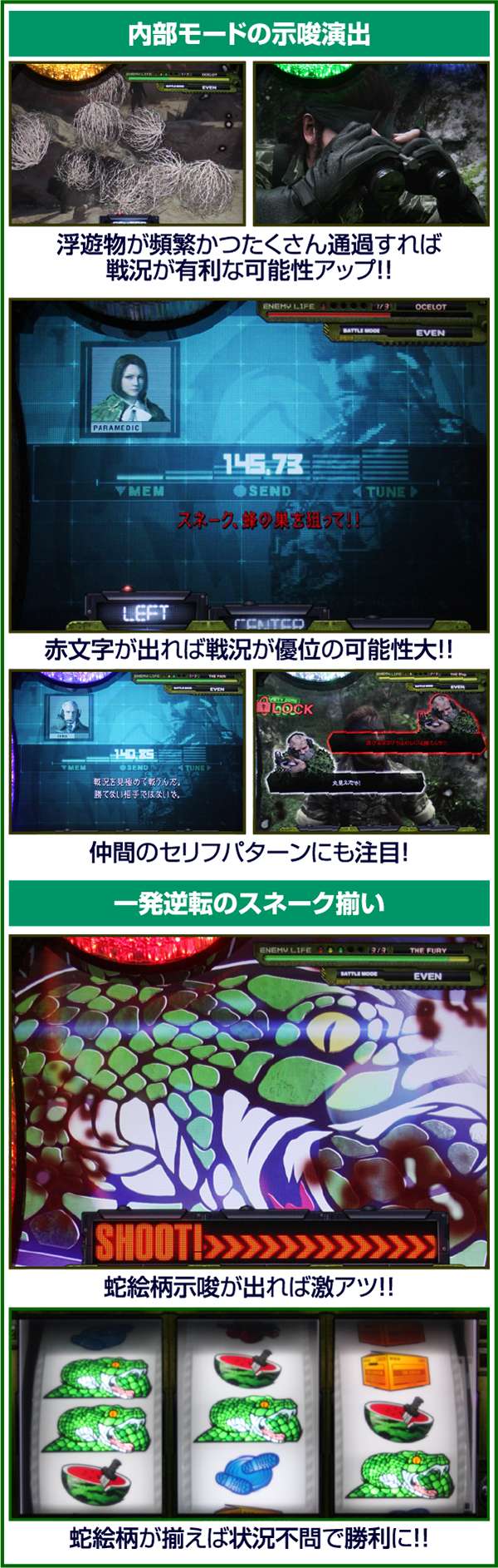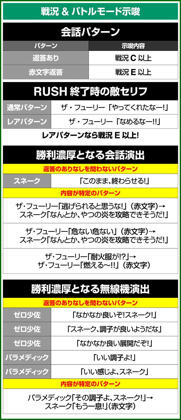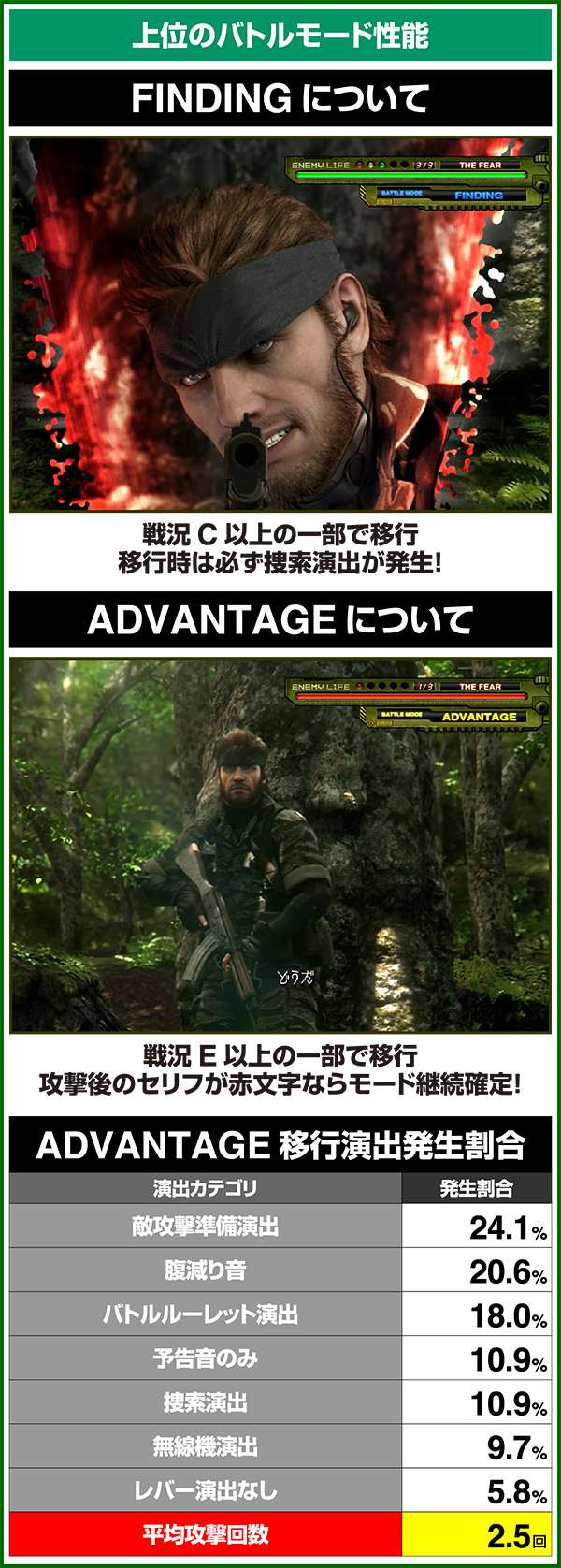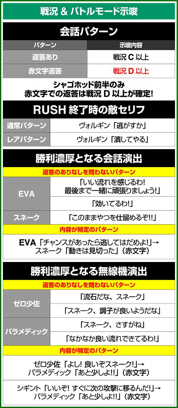 バトルには内部的な「有利」・「不利」という状態があり、まず対戦相手に依存した状況からスタート。以降はベルやレア役を引けば優位な状態に近づき、逆にリプレイが頻発すると不利な状態へ移行しやすくなる。成立役によって綱引きをしているイメージで、有利な状況であればスネークの攻撃機会が増え、リプレイでも敵にダメージを与えることがある。