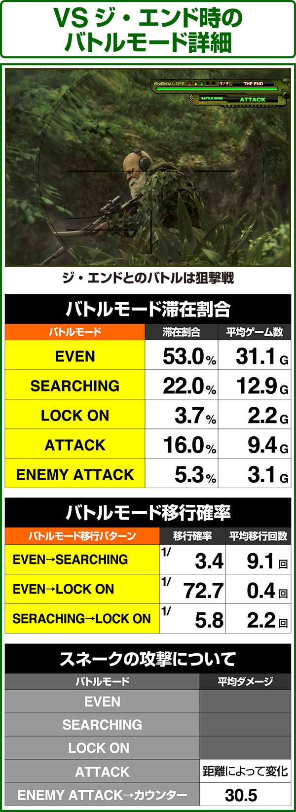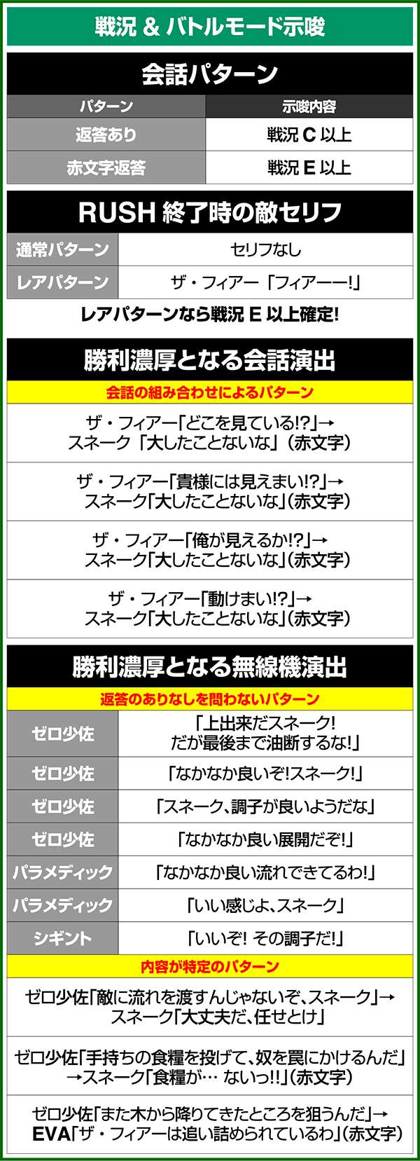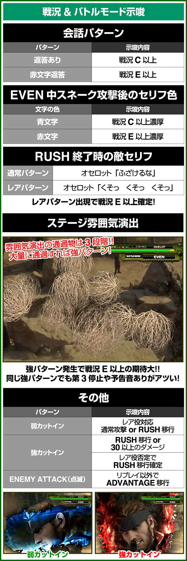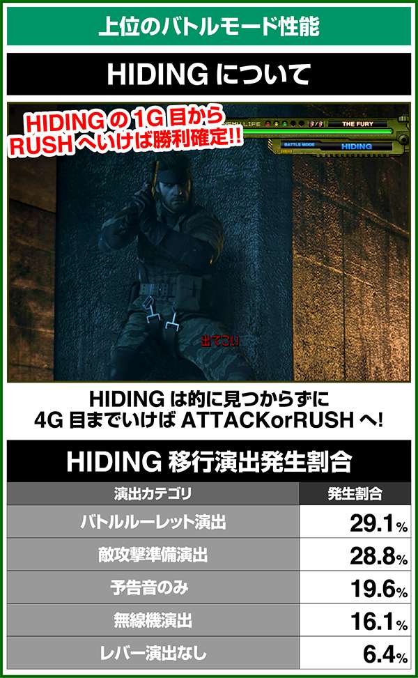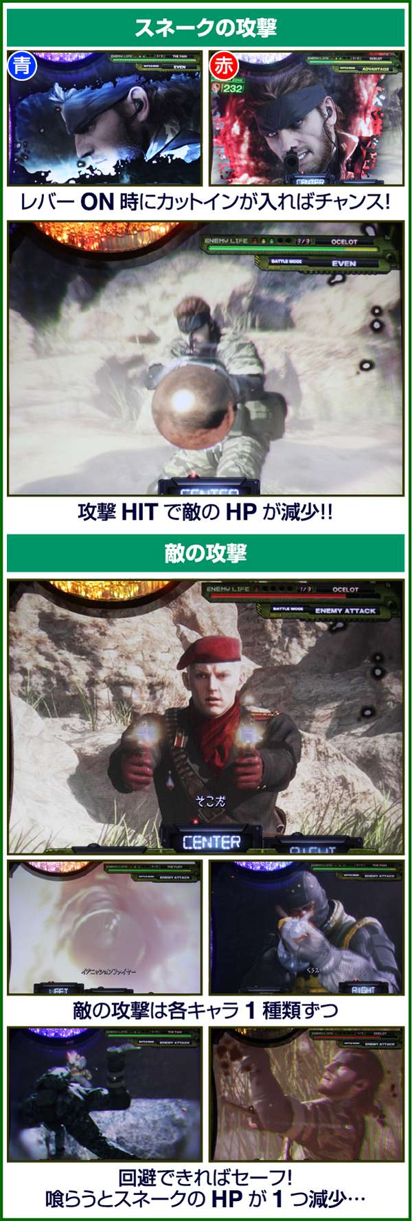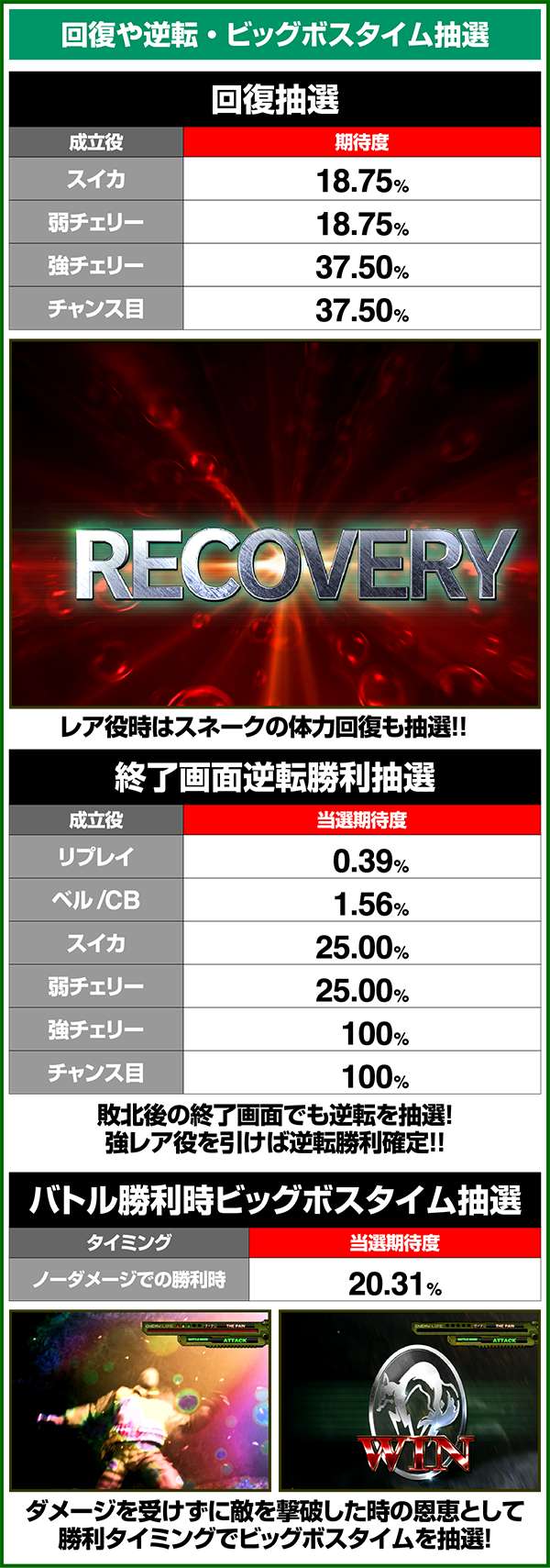 バトルには内部的な「有利」・「不利」という状態があり、まず対戦相手に依存した状況からスタート。以降はベルやレア役を引けば優位な状態に近づき、逆にリプレイが頻発すると不利な状態へ移行しやすくなる。成立役によって綱引きをしているイメージで、有利な状況であればスネークの攻撃機会が増え、リプレイでも敵にダメージを与えることがある。