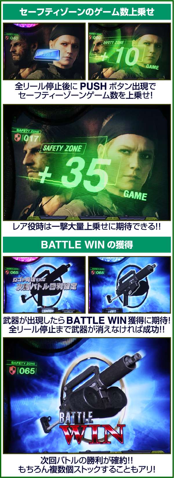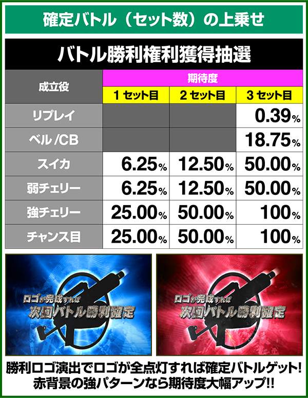 また、BATTLE WIN…いわゆるセット数上乗せも抽選されており、当選すれば次回バトルの勝利が確約。BATTLE WIN使用時のバトルはセーフティーゾーンの減算がストップするため、安心しつつバトル勝利を楽しむことができる。