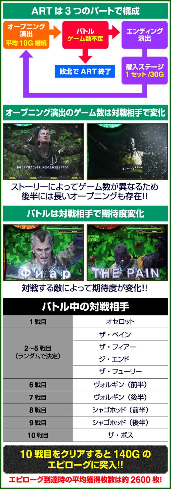 ART中は滞在している状態によって抽選内容が変化。オープニングでは小役によって内部的なダメージ抽選がおこなわれており、敵へのダメージがたまっていた場合はバトル開始後に放出される(スネーク攻撃時に放出)。