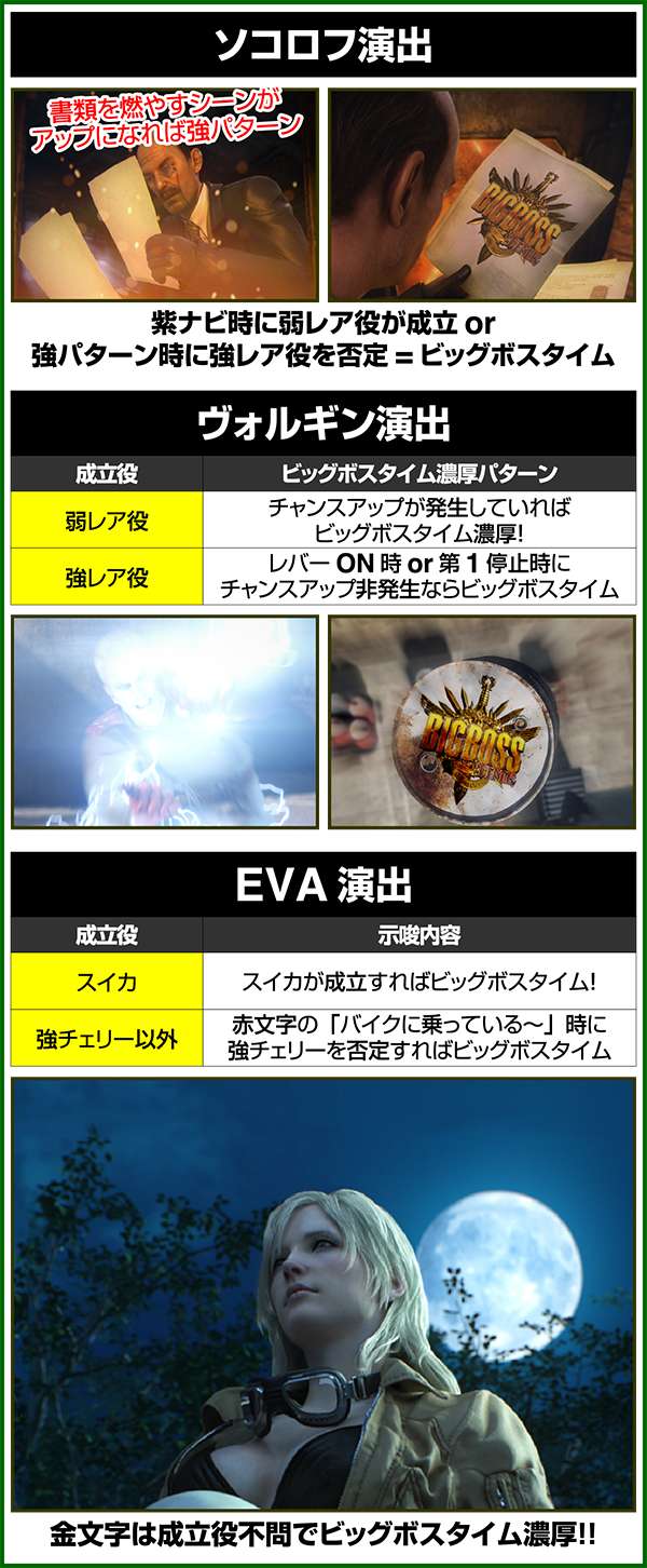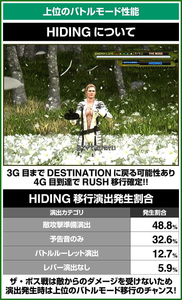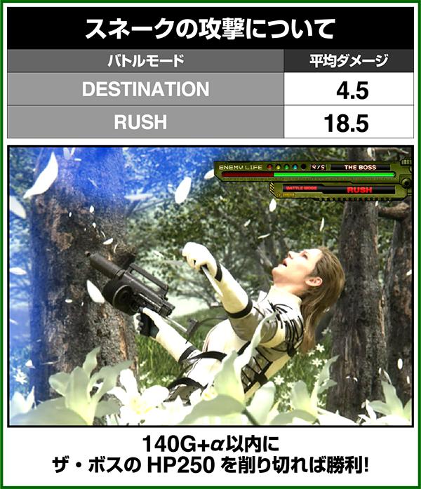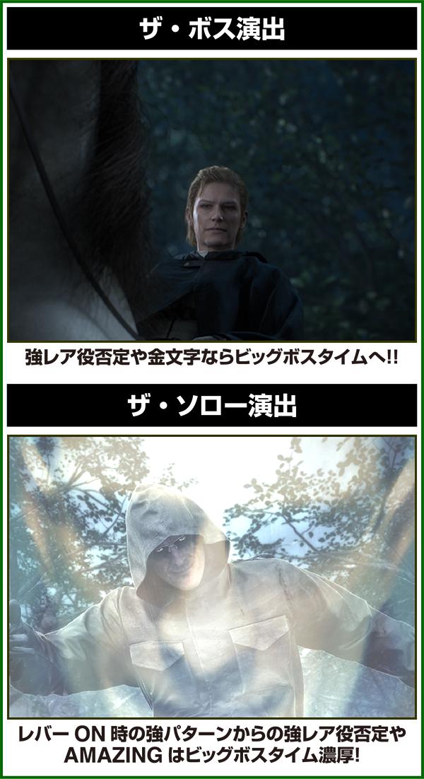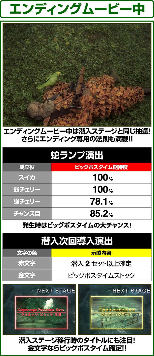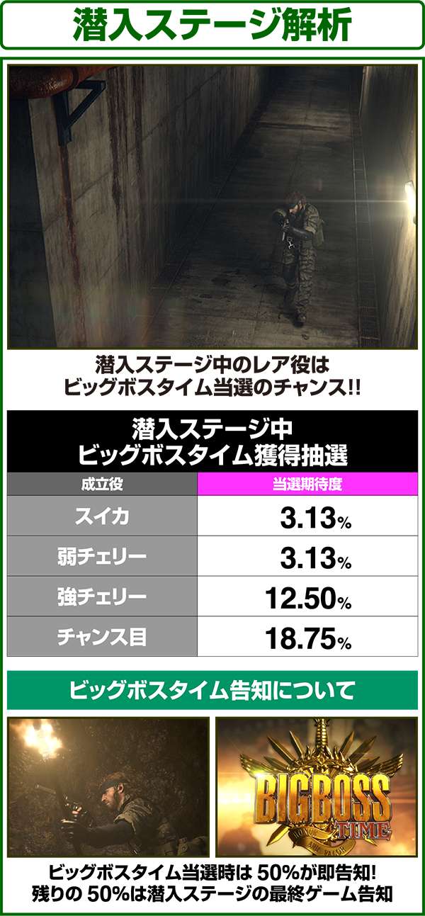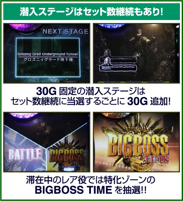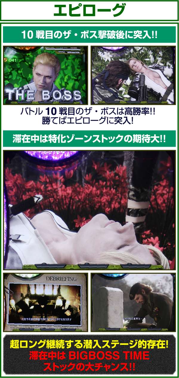 10戦目のザ・ボスを撃破すれば140Gのエピローグに突入。エピローグ中は潜入ステージと同じ抽選をおこなうため、出玉を得ることができるのはもちろんのこと、特化ゾーンのBIGBOSS TIMEストックにも期待できる。
