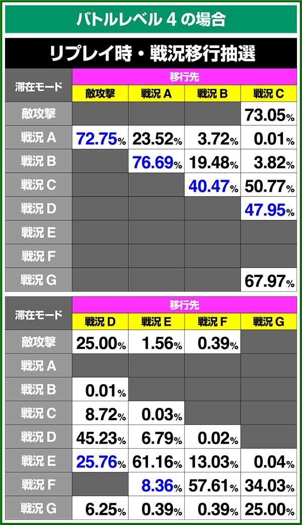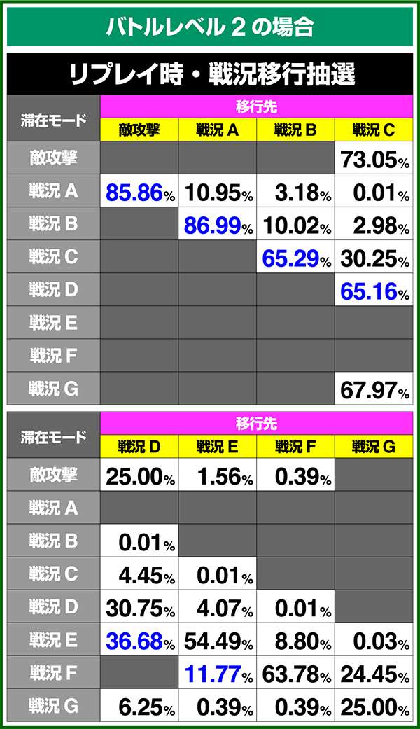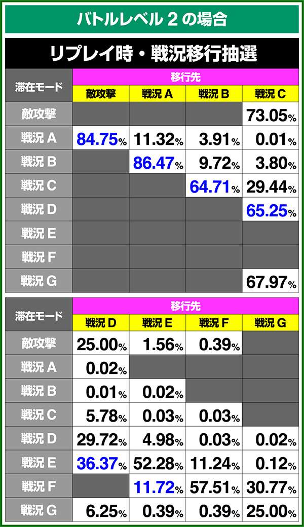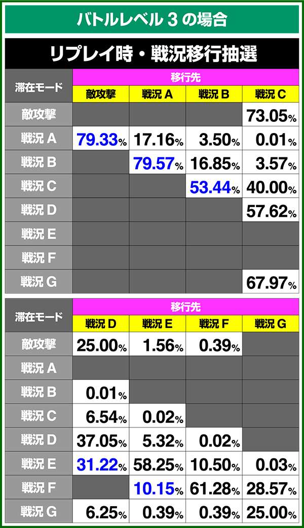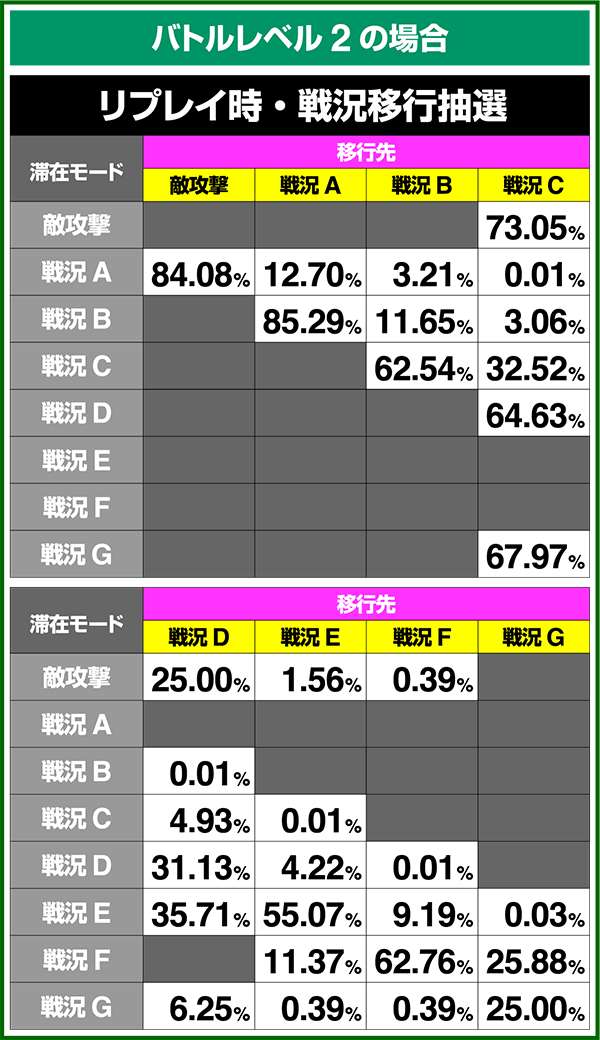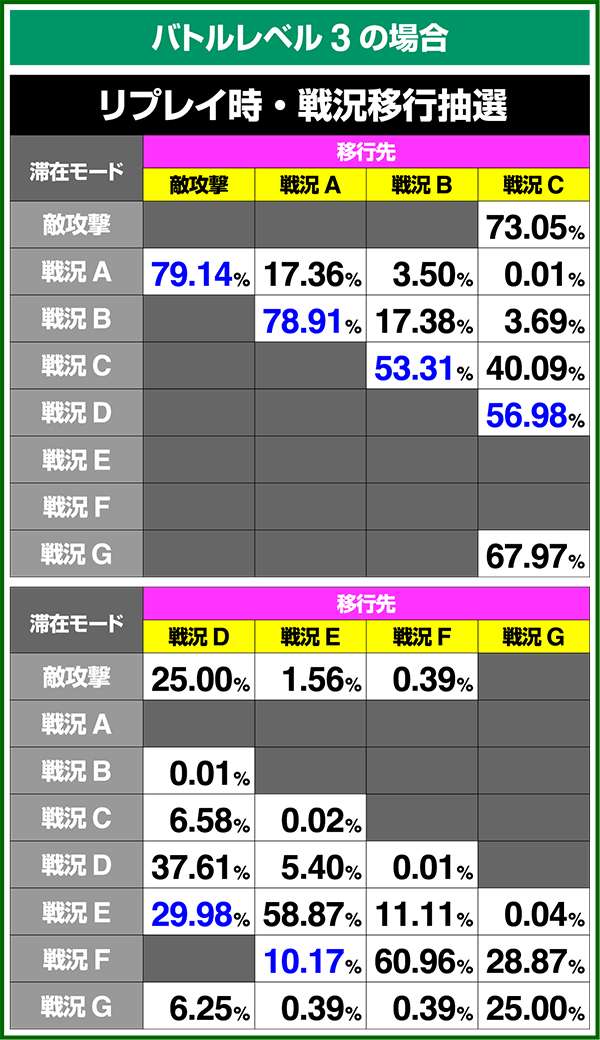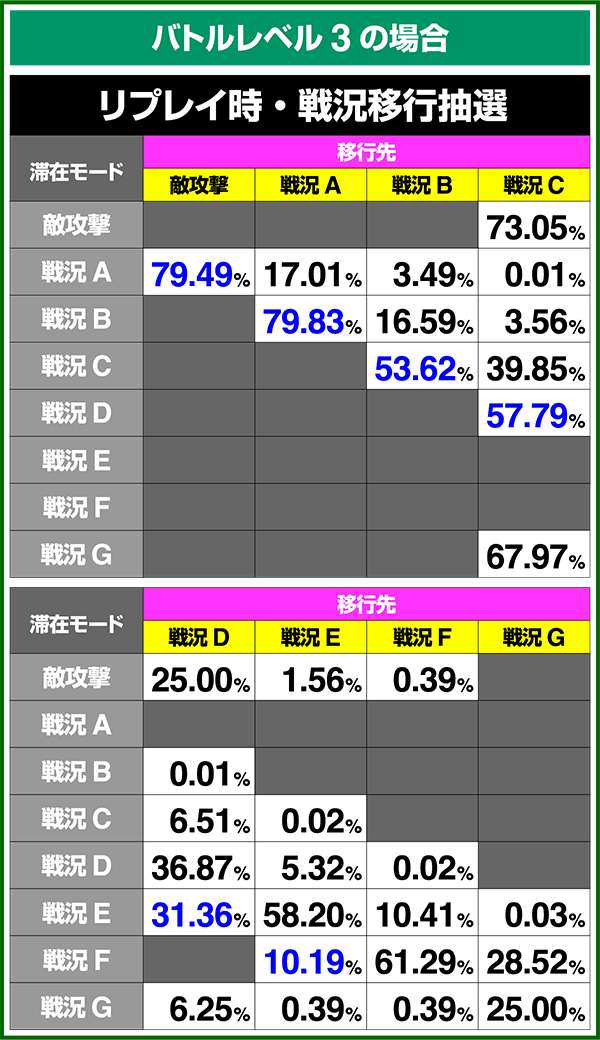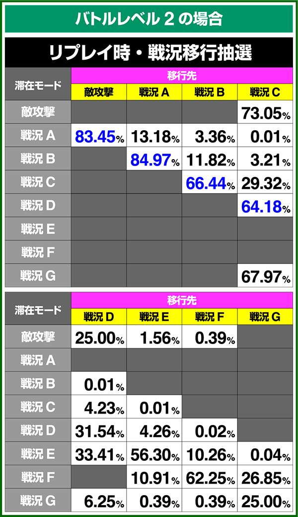 バトルモードは戦況に応じて移行するので、つねに一定の確率で抽選しているわけではないため期待度や確率の数値はあくまで平均値となる。