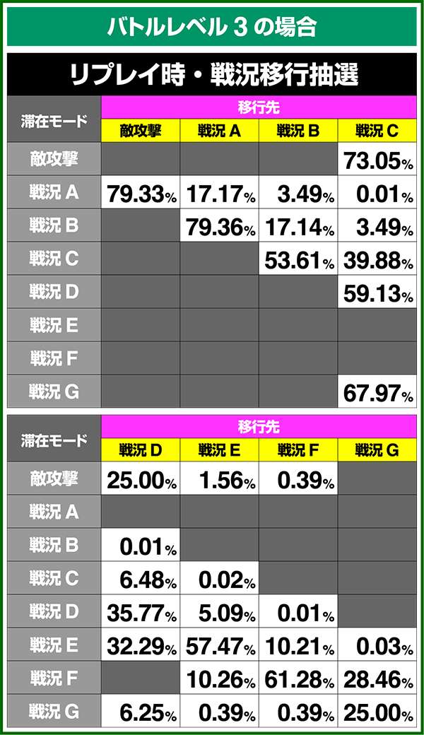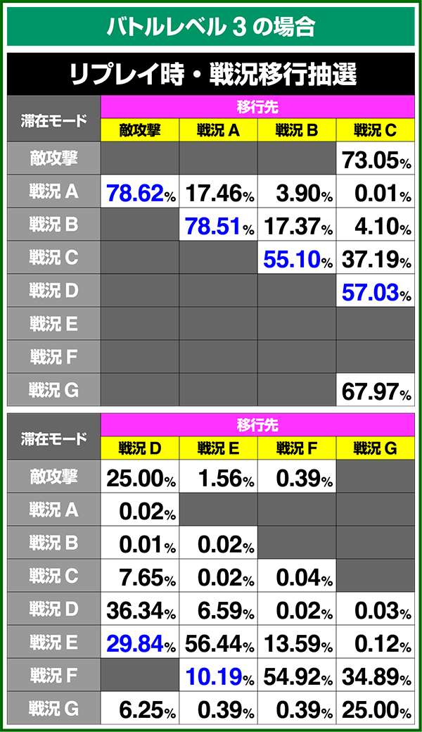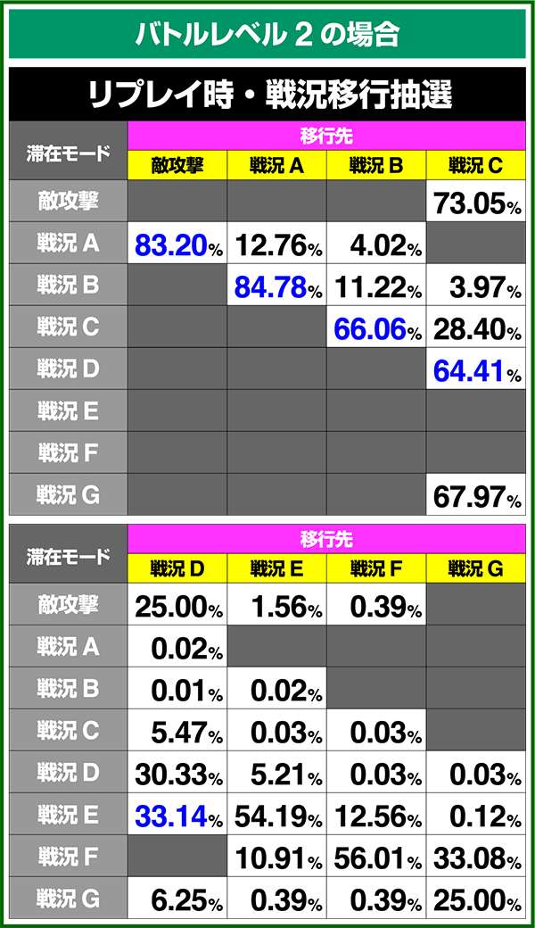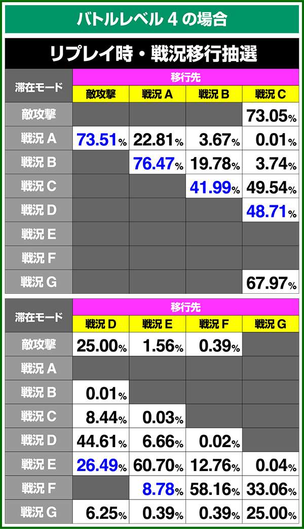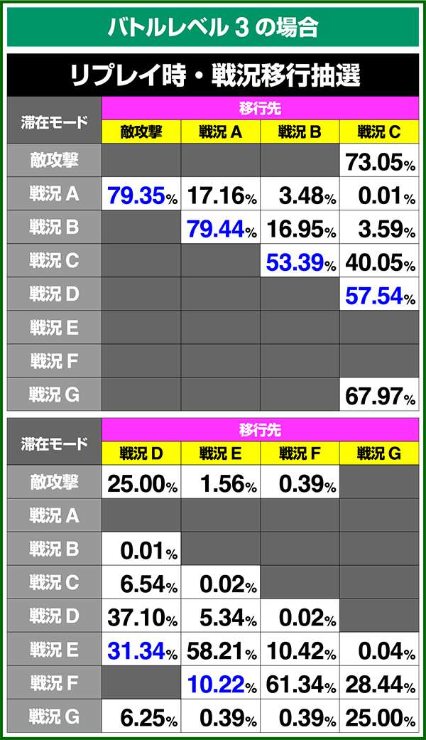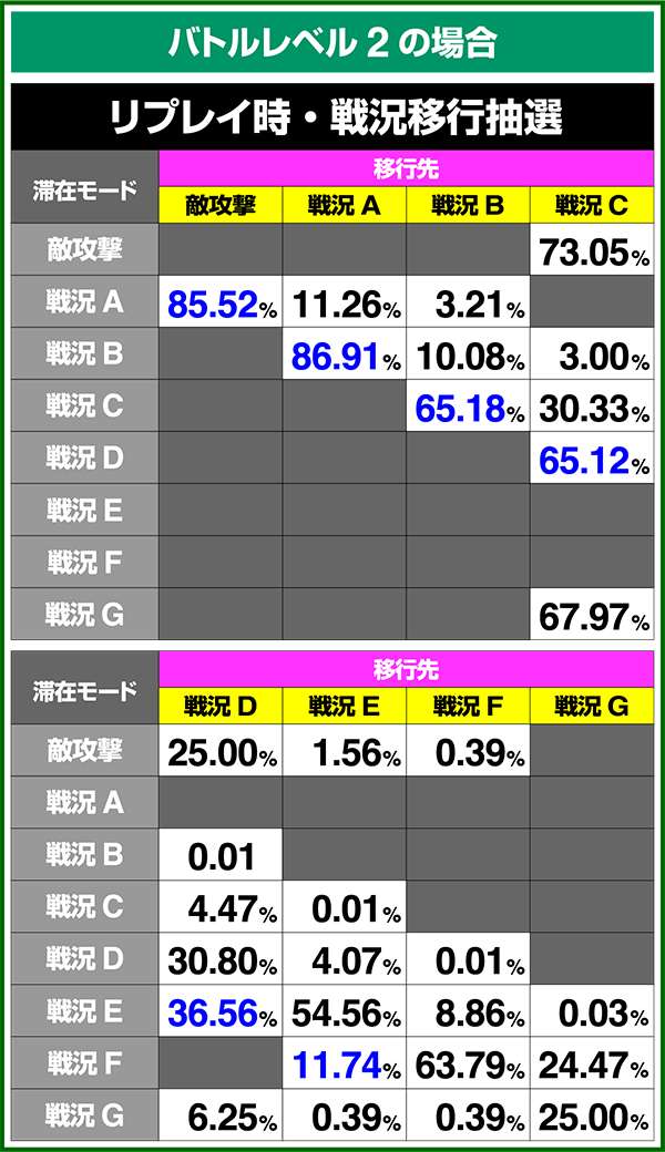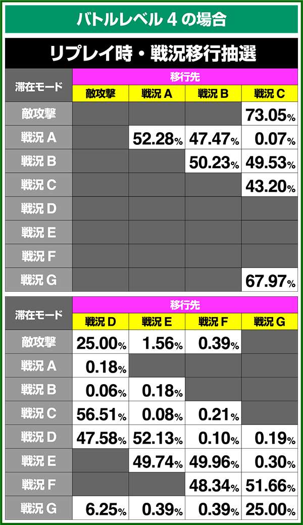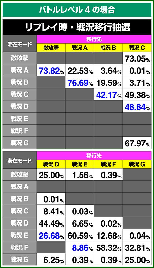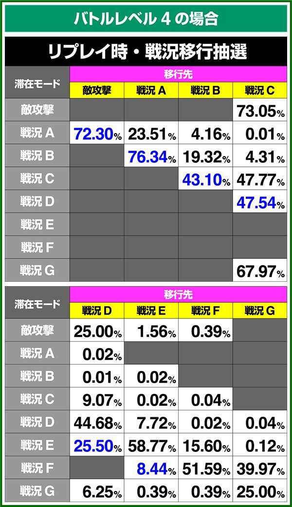 バトルモードは戦況に応じて移行するので、つねに一定の確率で抽選しているわけではないため期待度や確率の数値はあくまで平均値となる。