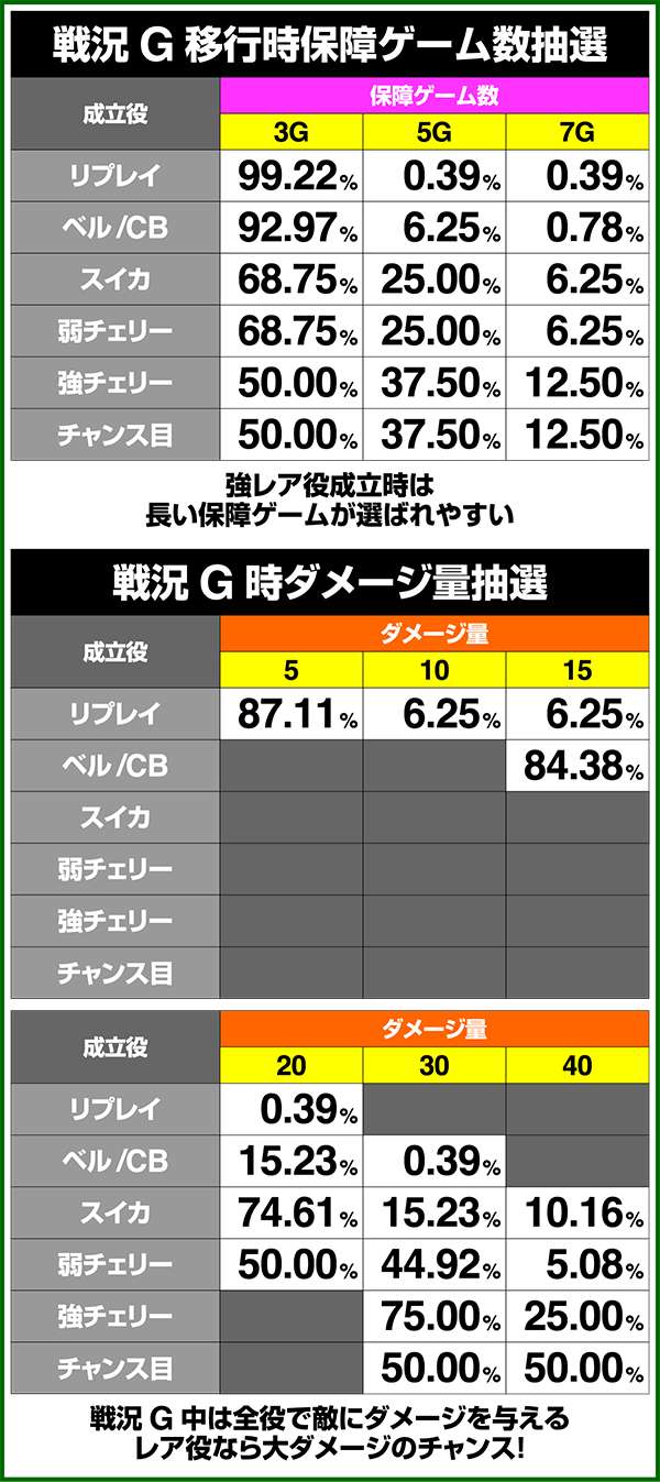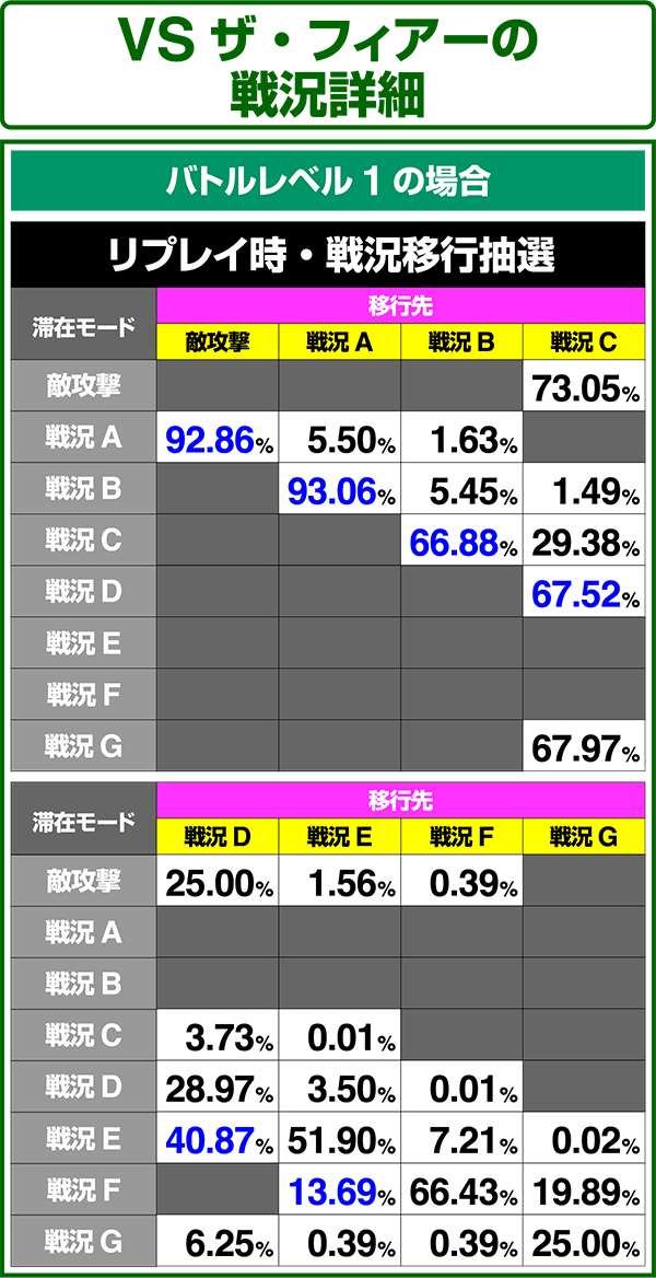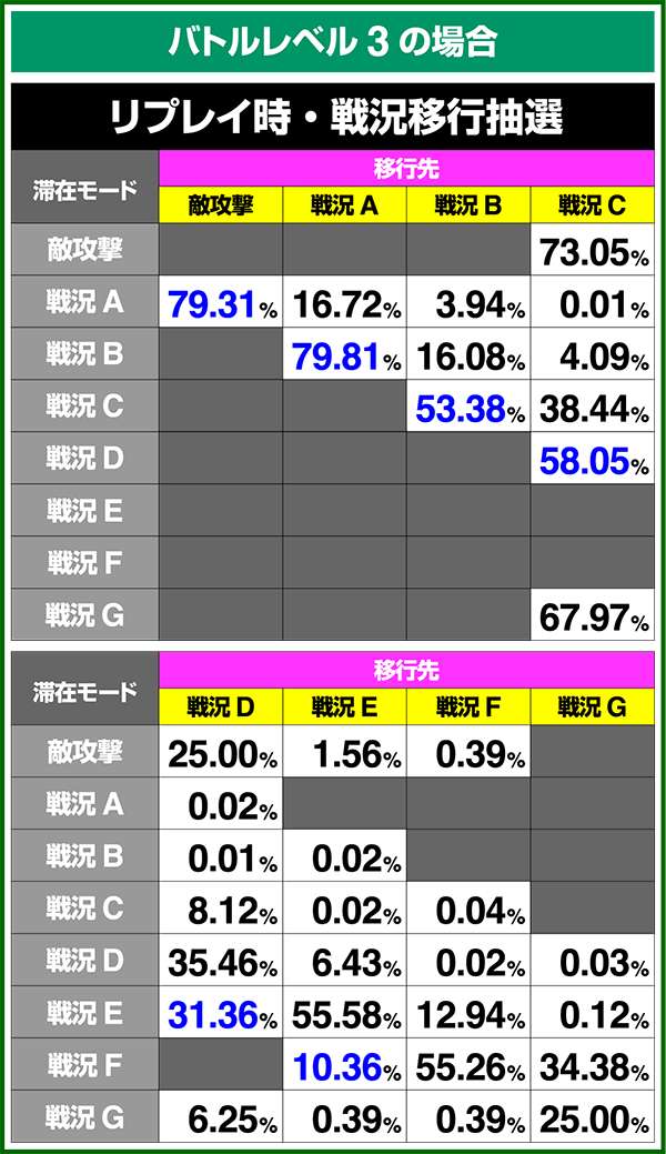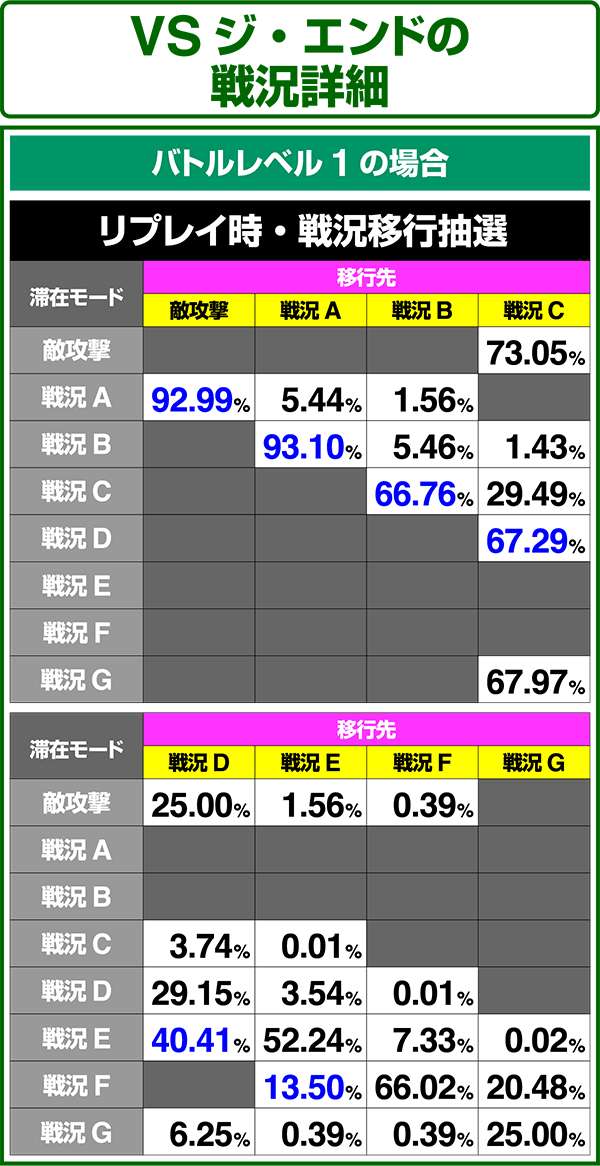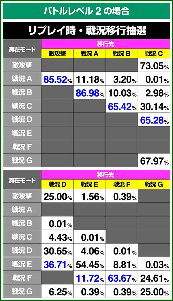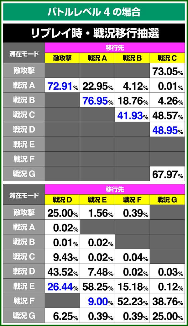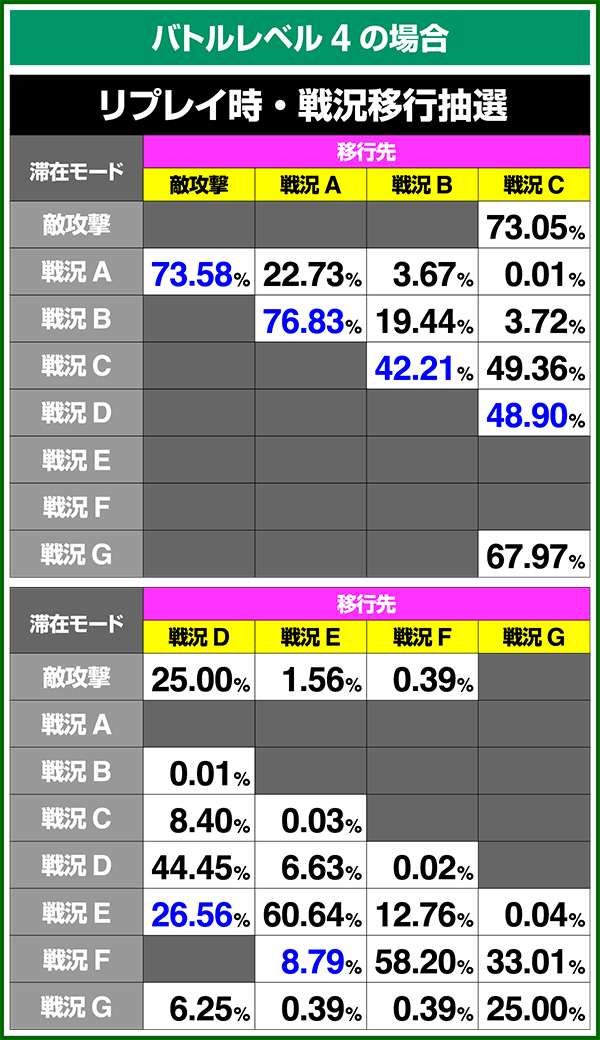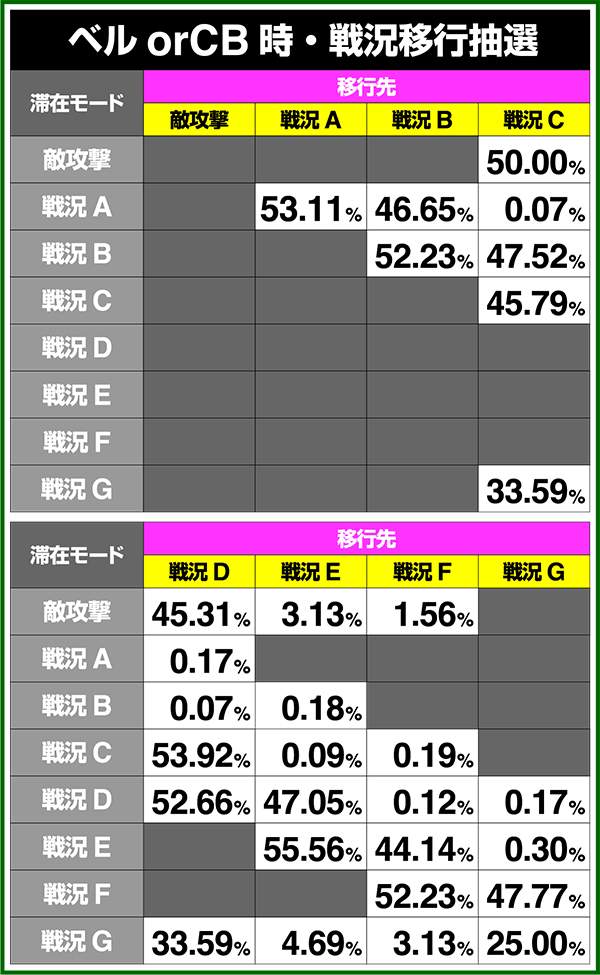 バトルモードは戦況に応じて移行するので、つねに一定の確率で抽選しているわけではないため期待度や確率の数値はあくまで平均値となる。