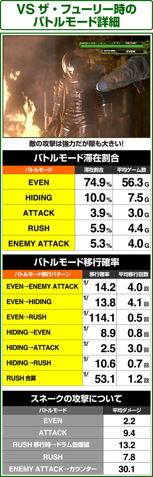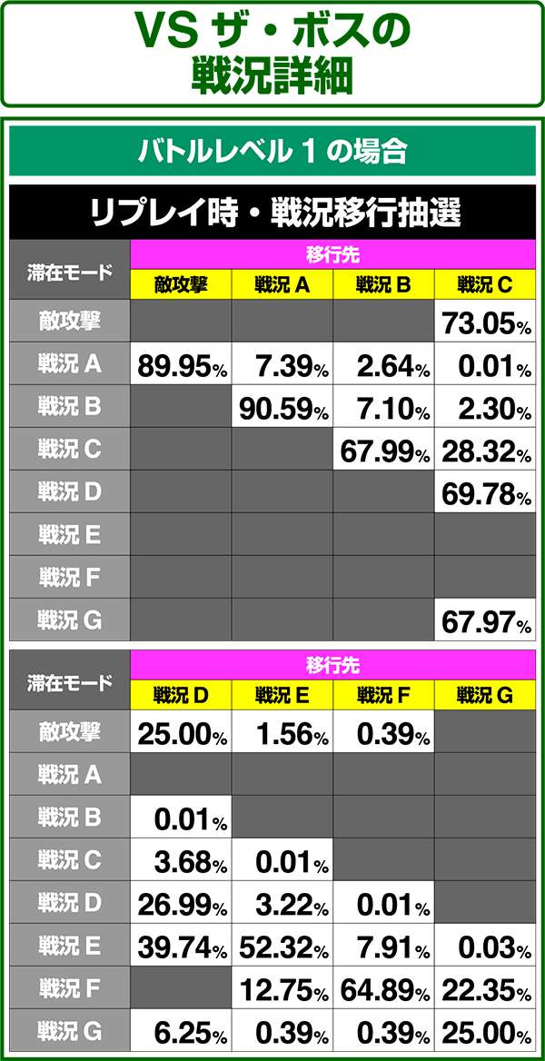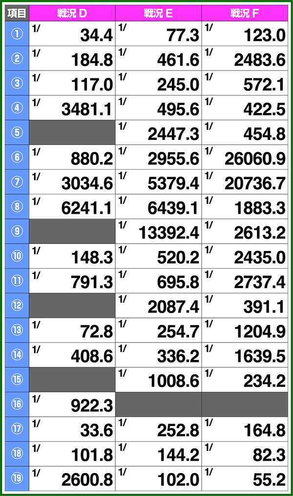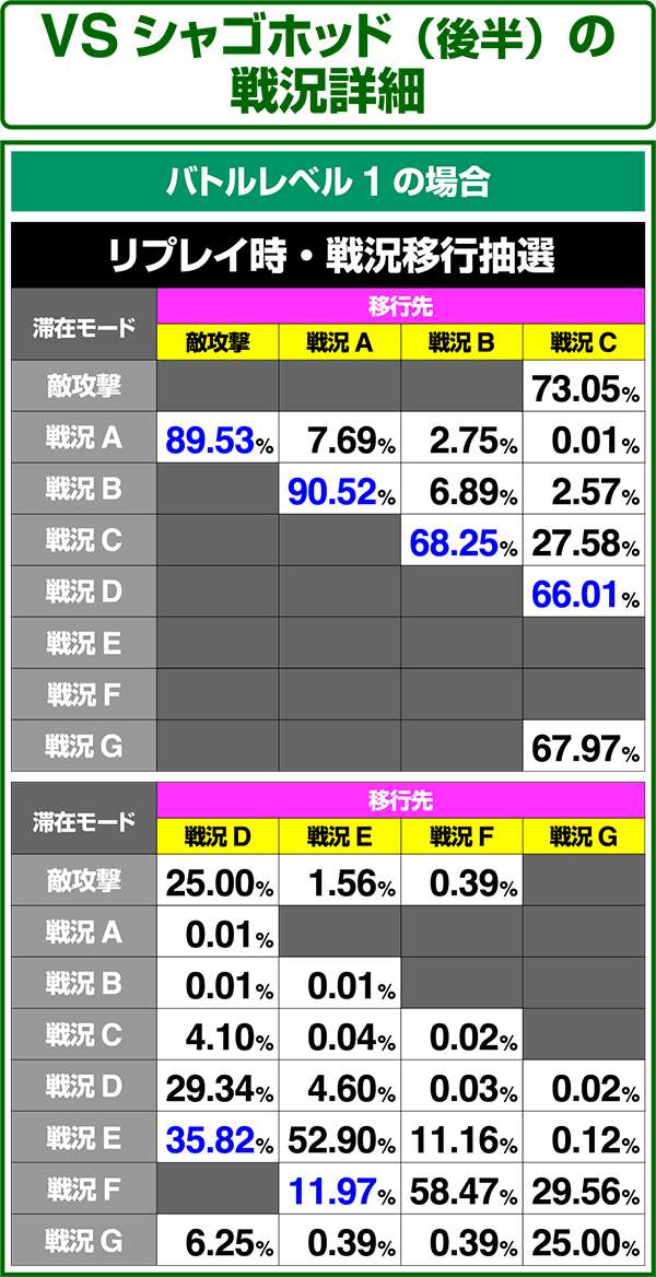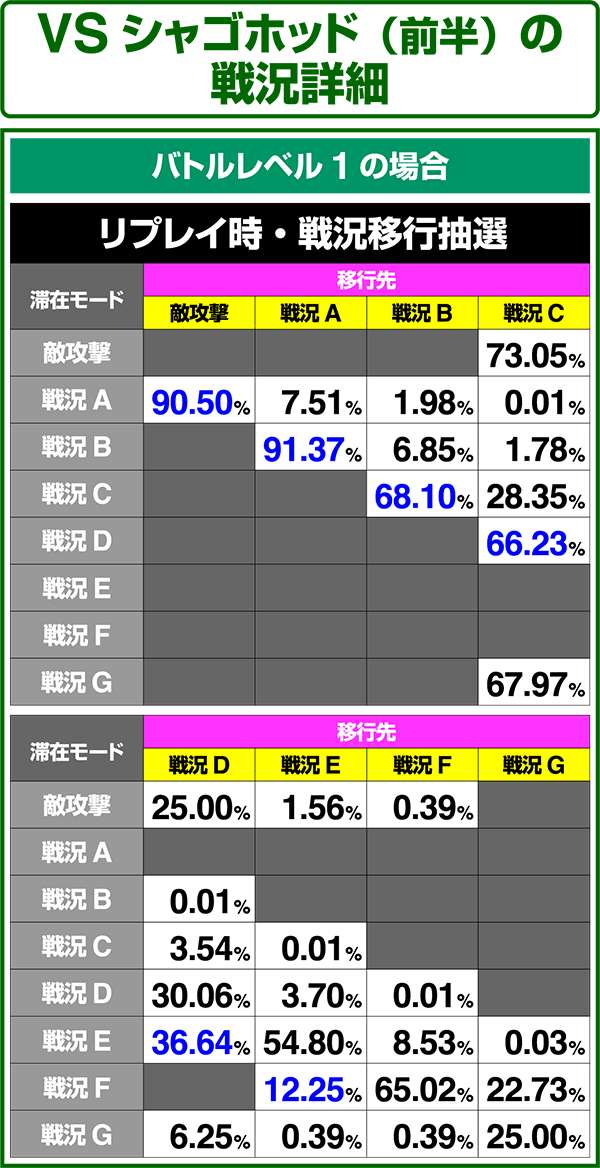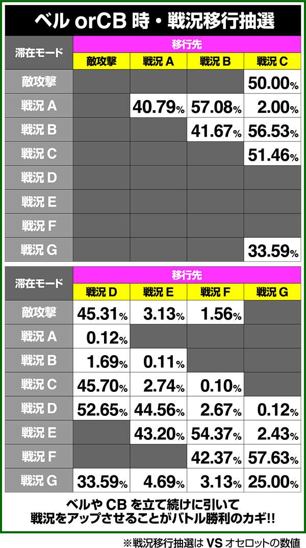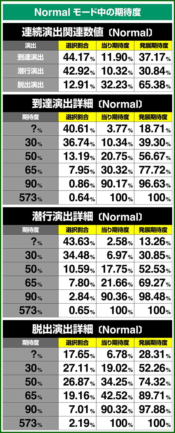 バトルモードは戦況に応じて移行するので、つねに一定の確率で抽選しているわけではないため期待度や確率の数値はあくまで平均値となる。