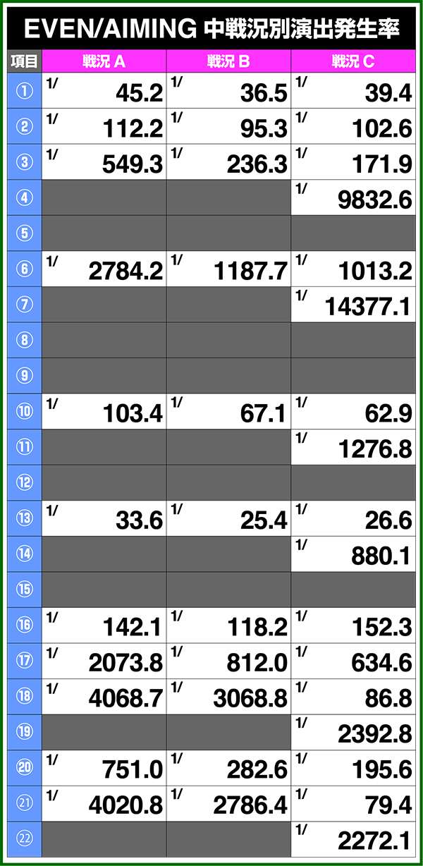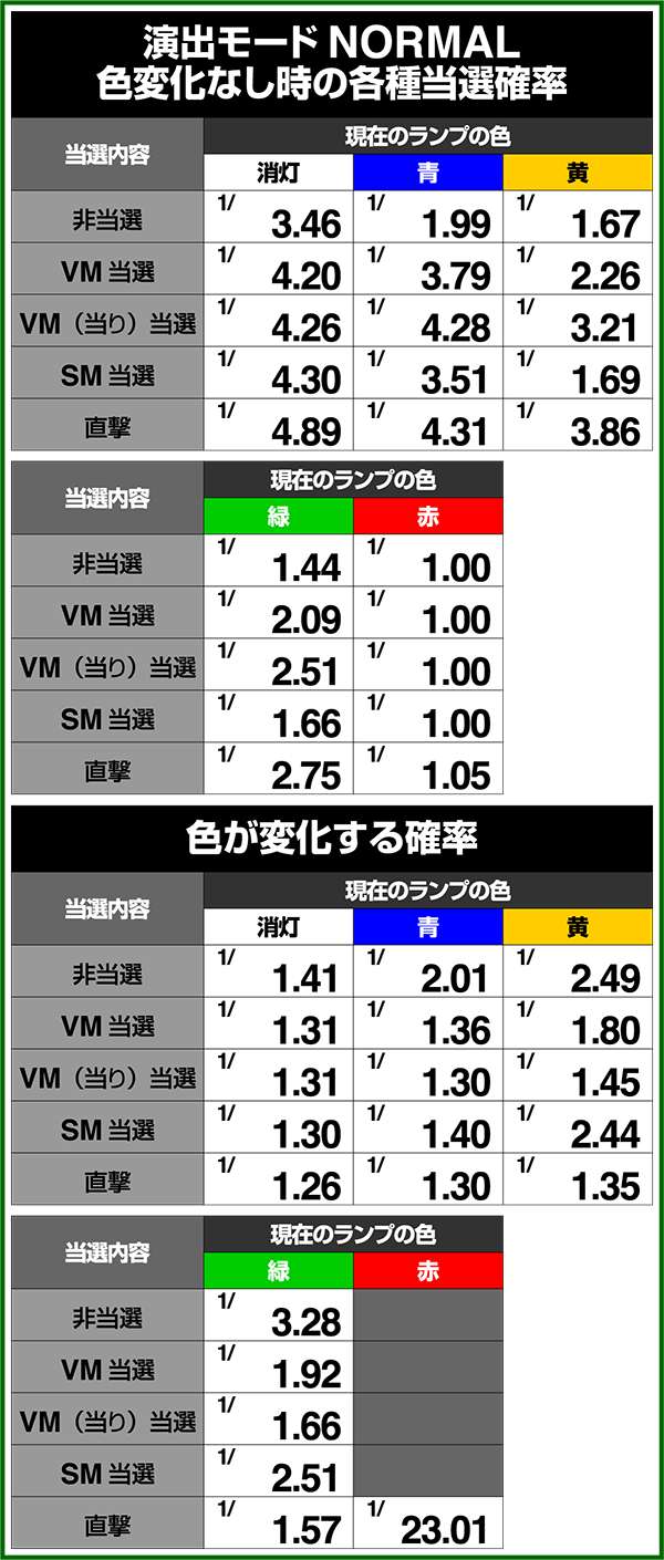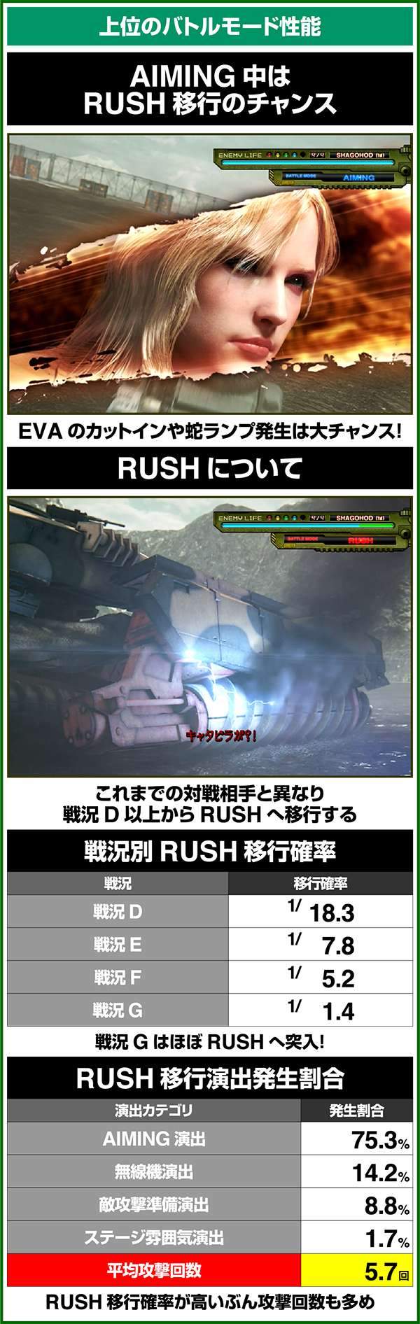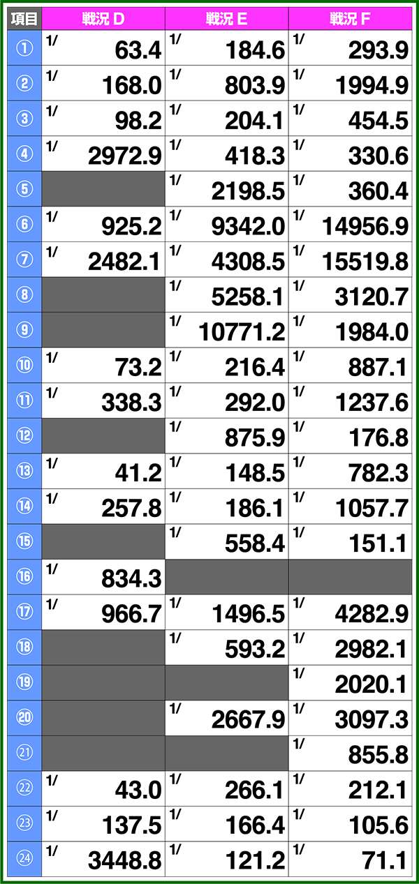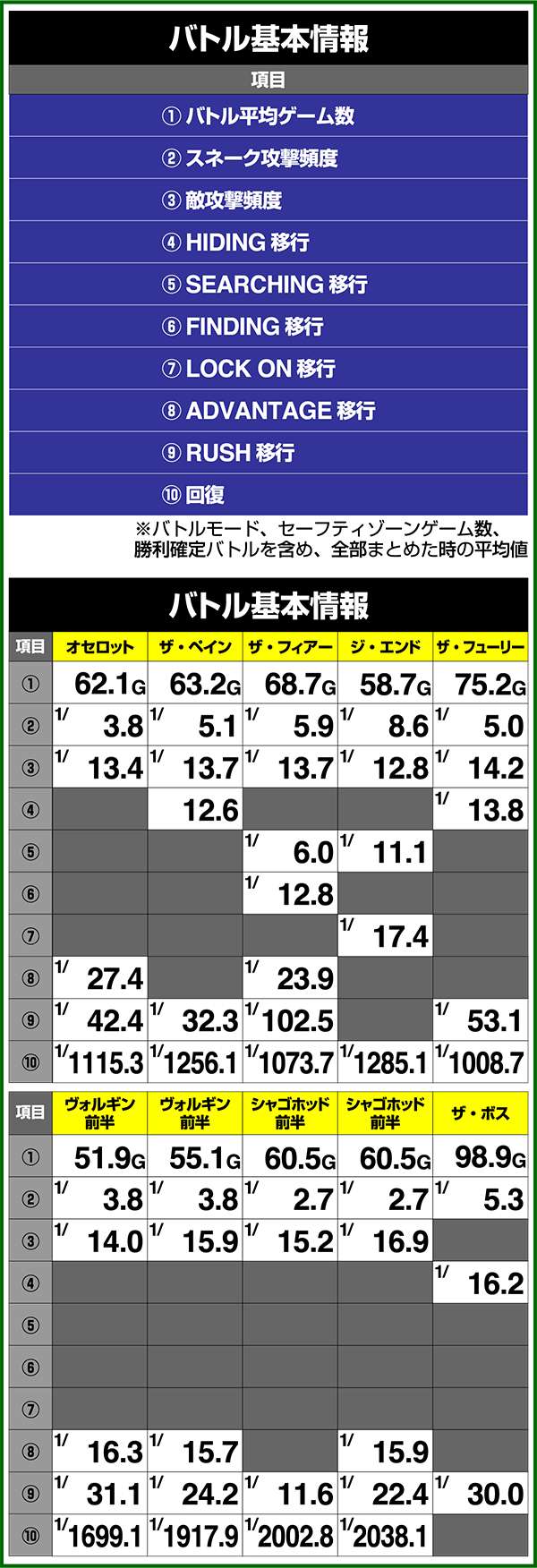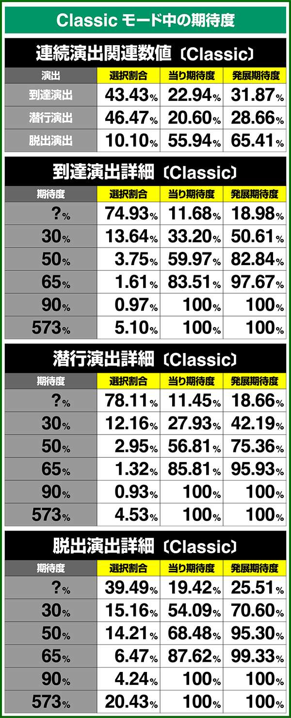 バトルモードは戦況に応じて移行するので、つねに一定の確率で抽選しているわけではないため期待度や確率の数値はあくまで平均値となる。