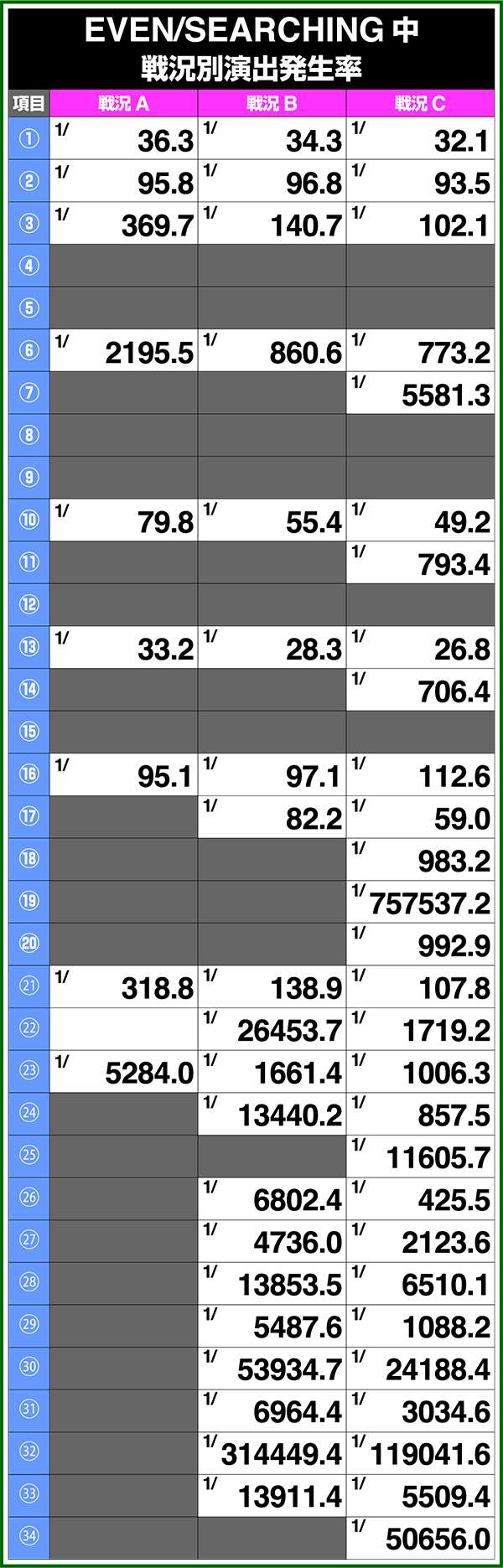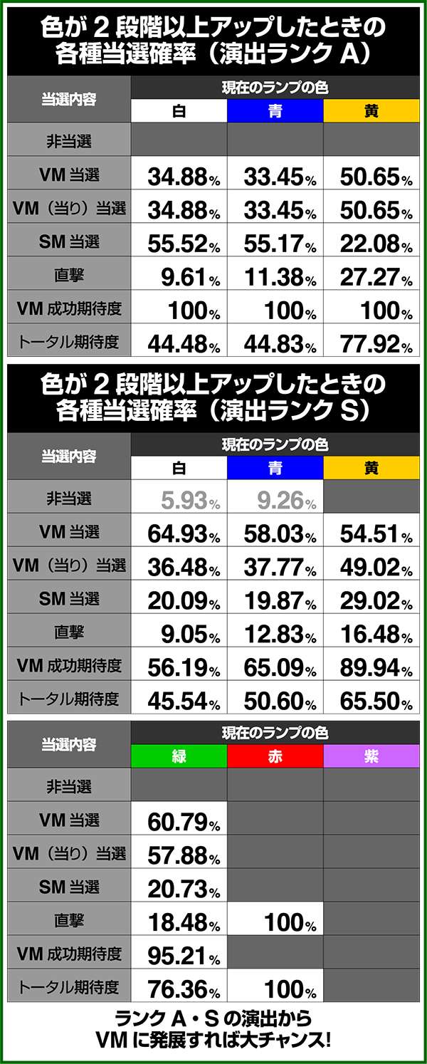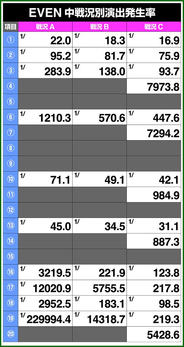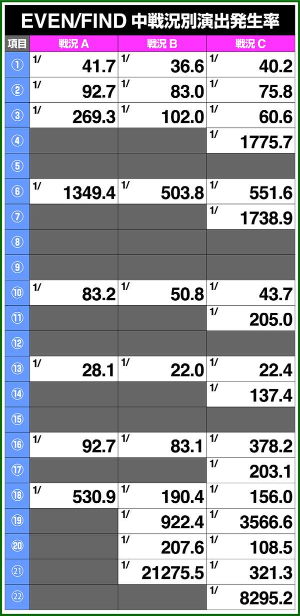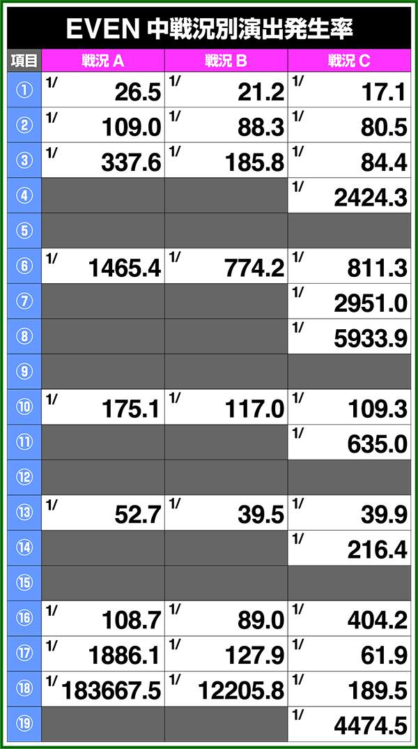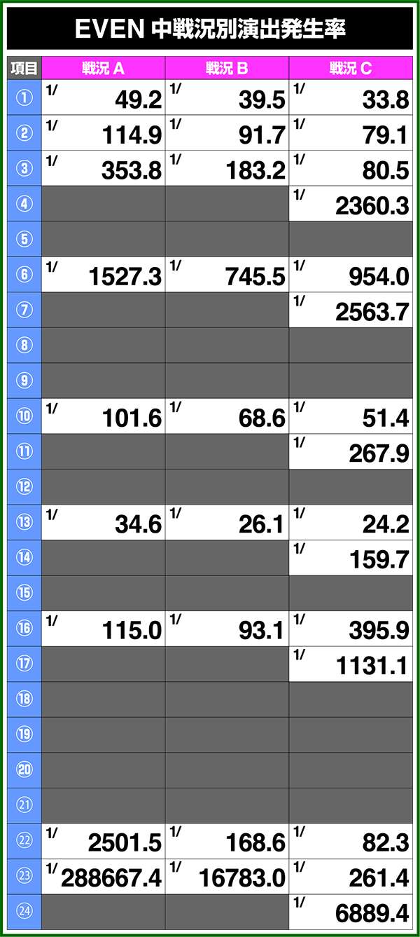 バトルモードは戦況に応じて移行するので、つねに一定の確率で抽選しているわけではないため期待度や確率の数値はあくまで平均値となる。