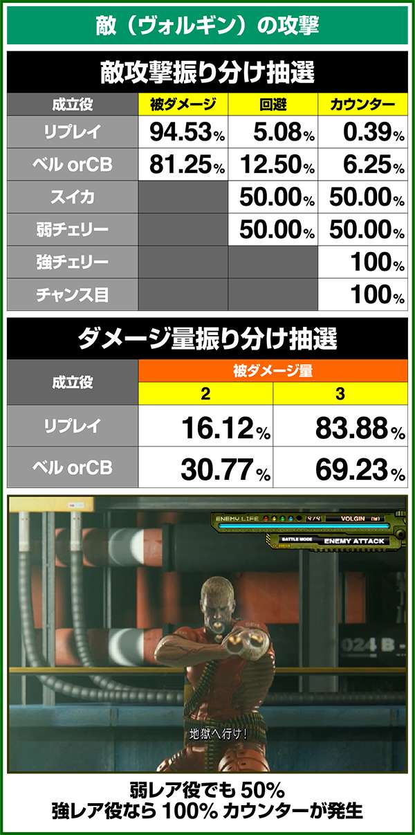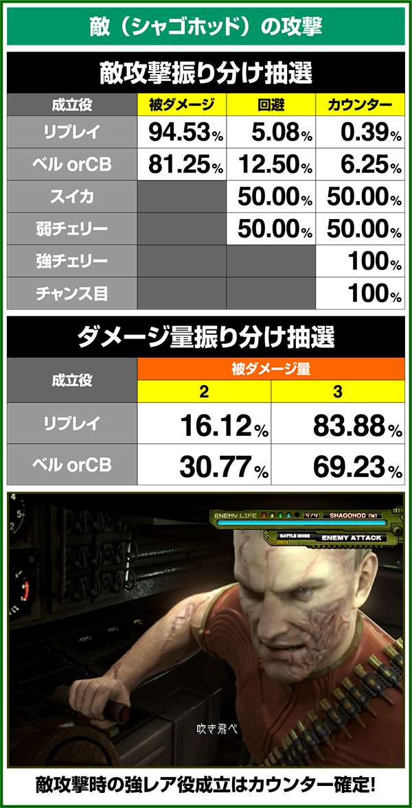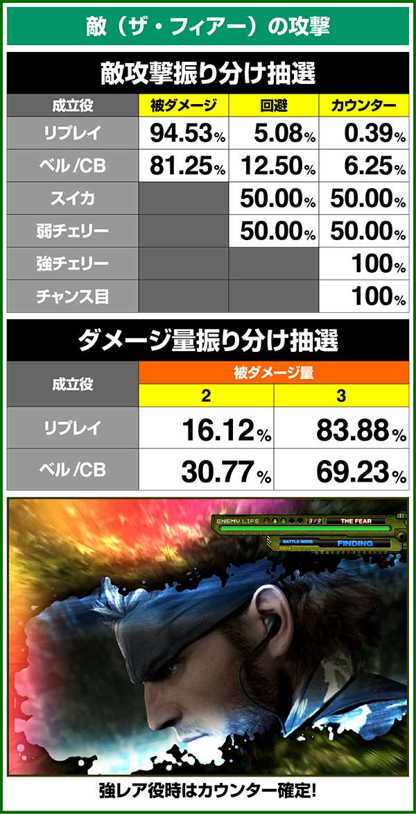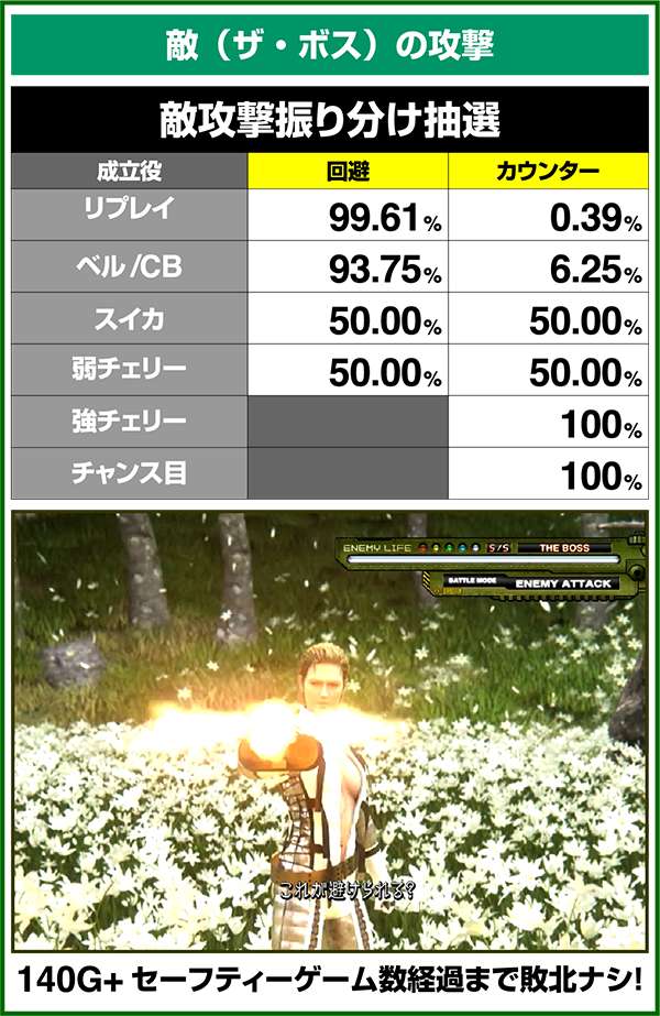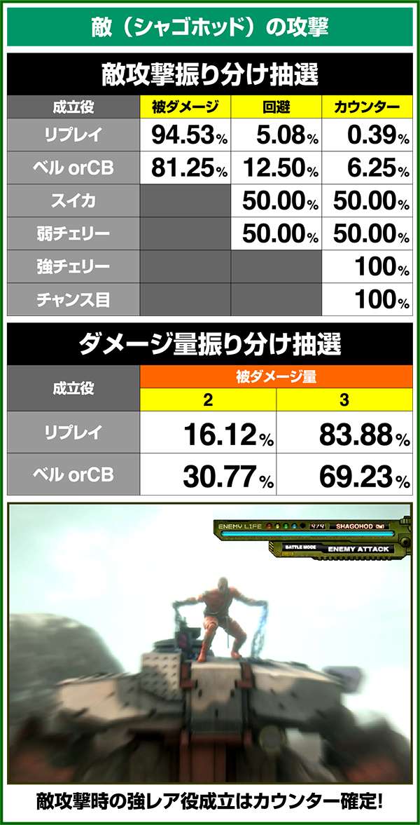 敵攻撃時に弱レア役を引けば回避or激アツのカウンター攻撃が確定。強レア役時は必ずカウンター攻撃が発生する。