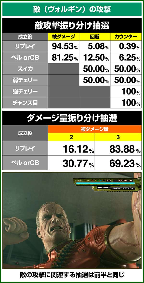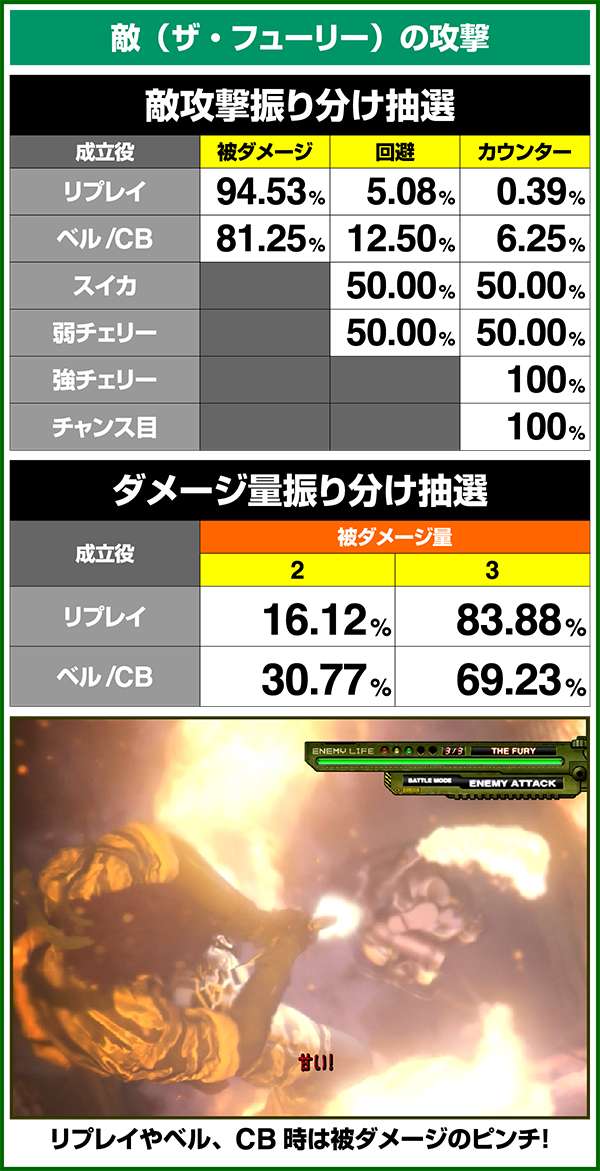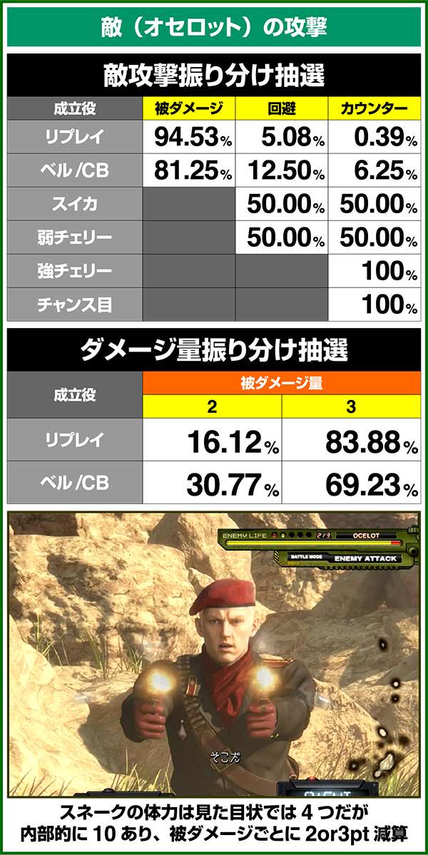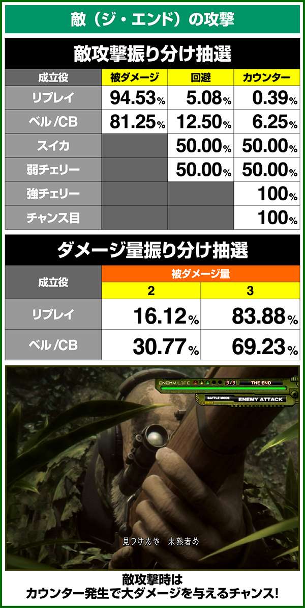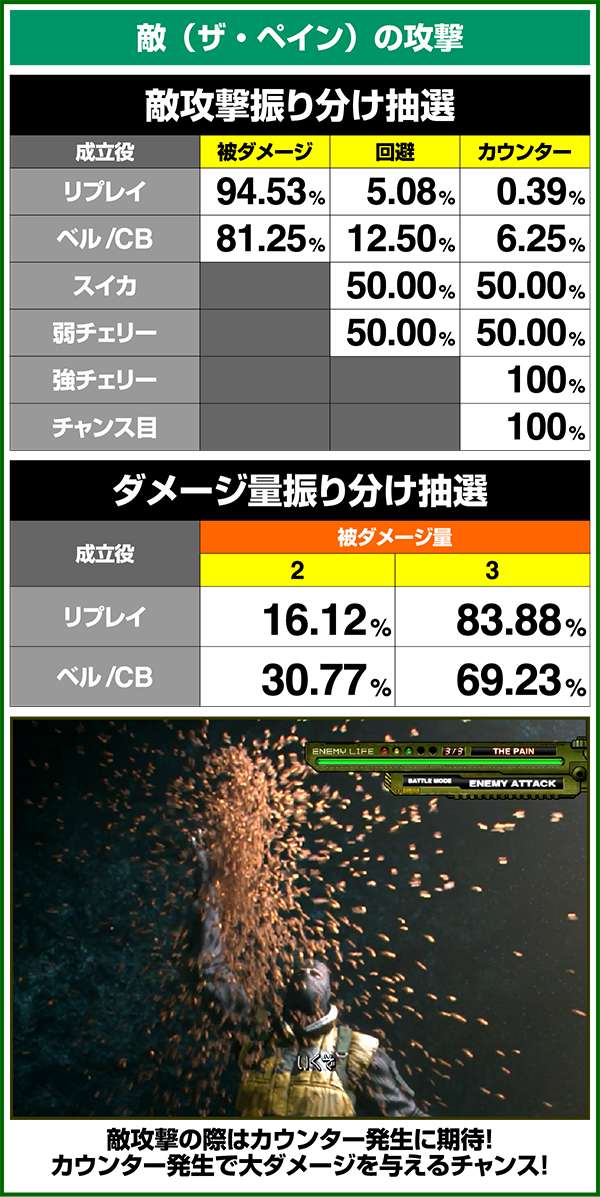 敵攻撃時に弱レア役を引けば回避or激アツのカウンター攻撃が確定。強レア役時は必ずカウンター攻撃が発生する。
