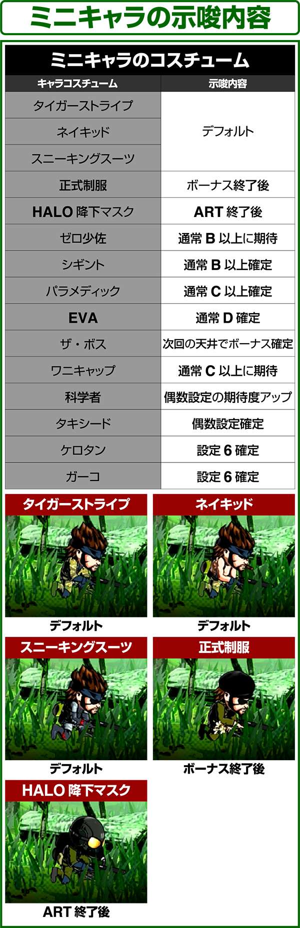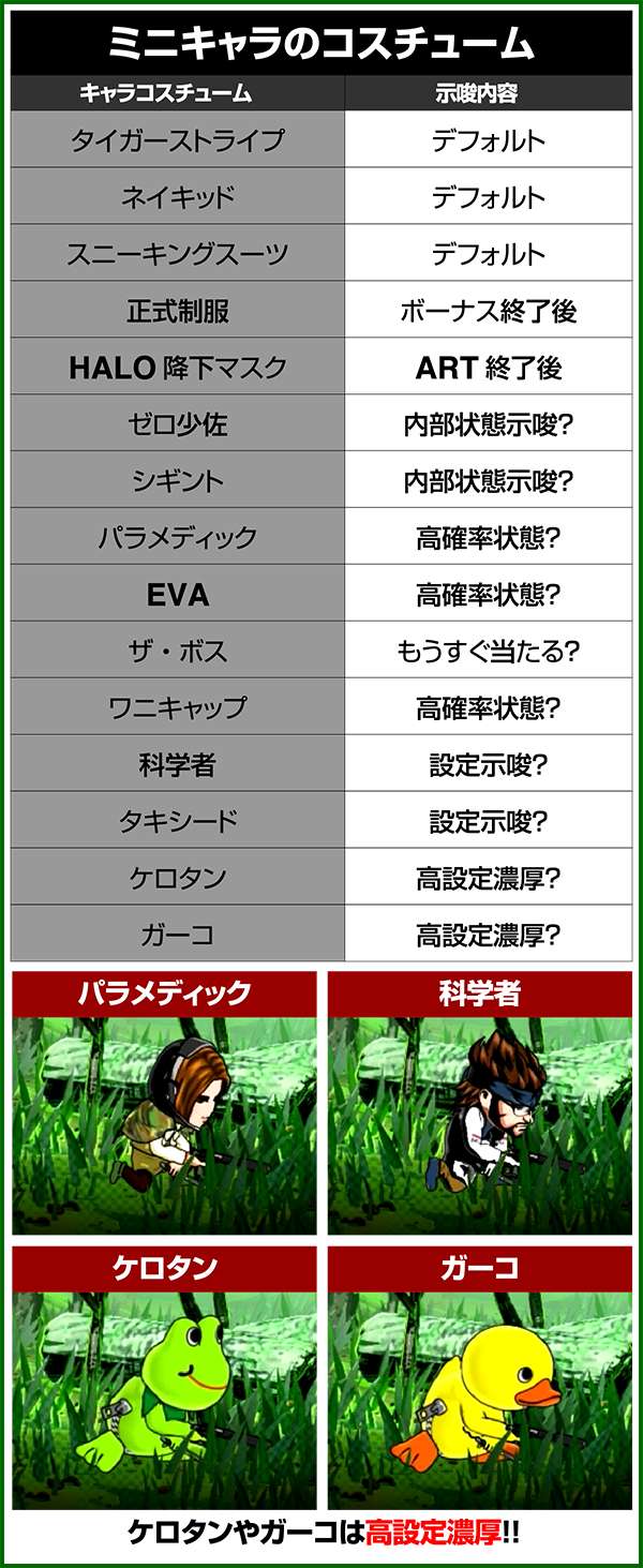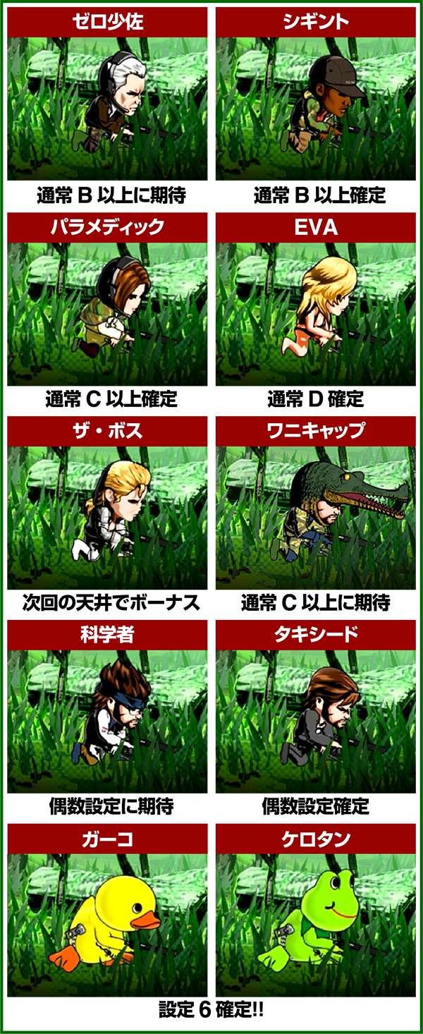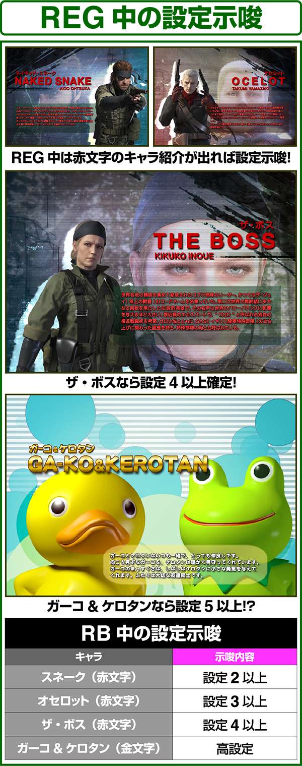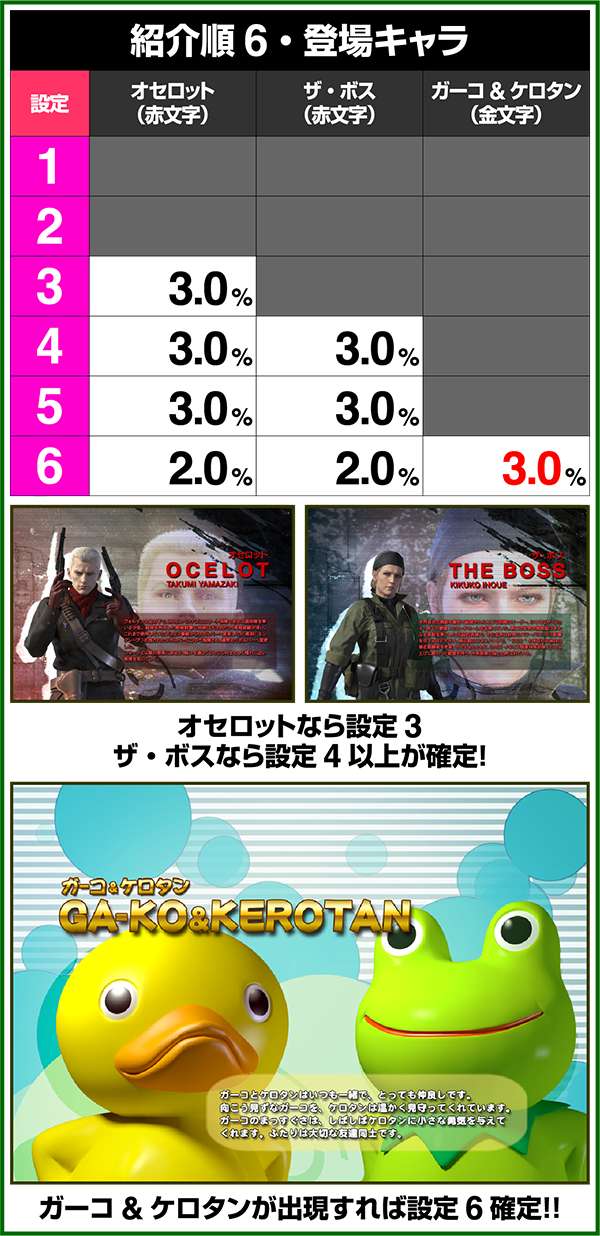 液晶下部のミニキャラでは内部状態や設定の示唆をおこなっており、ガーコとケロタンが出現した場合は設定6が確定となる。 ちなみに、ザ・ボスは199G以内で出現したら200ゲーム、201G〜499Gで出現したら500Gのゾーンでのボーナスの当選が確定する。出現時はしっかりとボーナスまで回すようにしよう。
