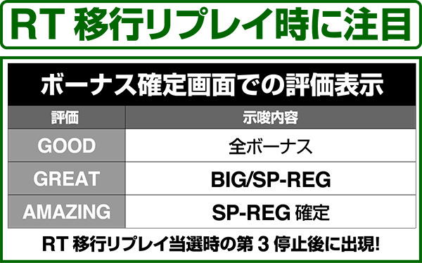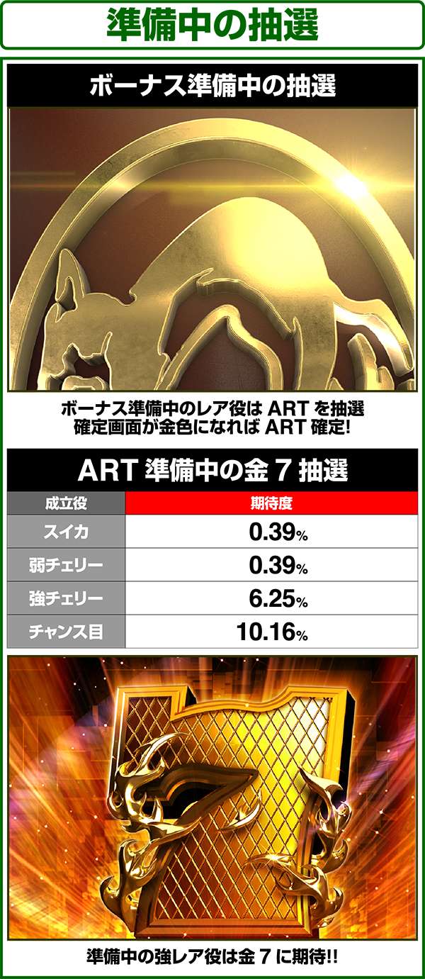 BIGはチャンス告知or完全告知タイプを任意で選択することが可能。消化中はレア役を引けばチャンス、7絵柄が揃えばART濃厚となる。