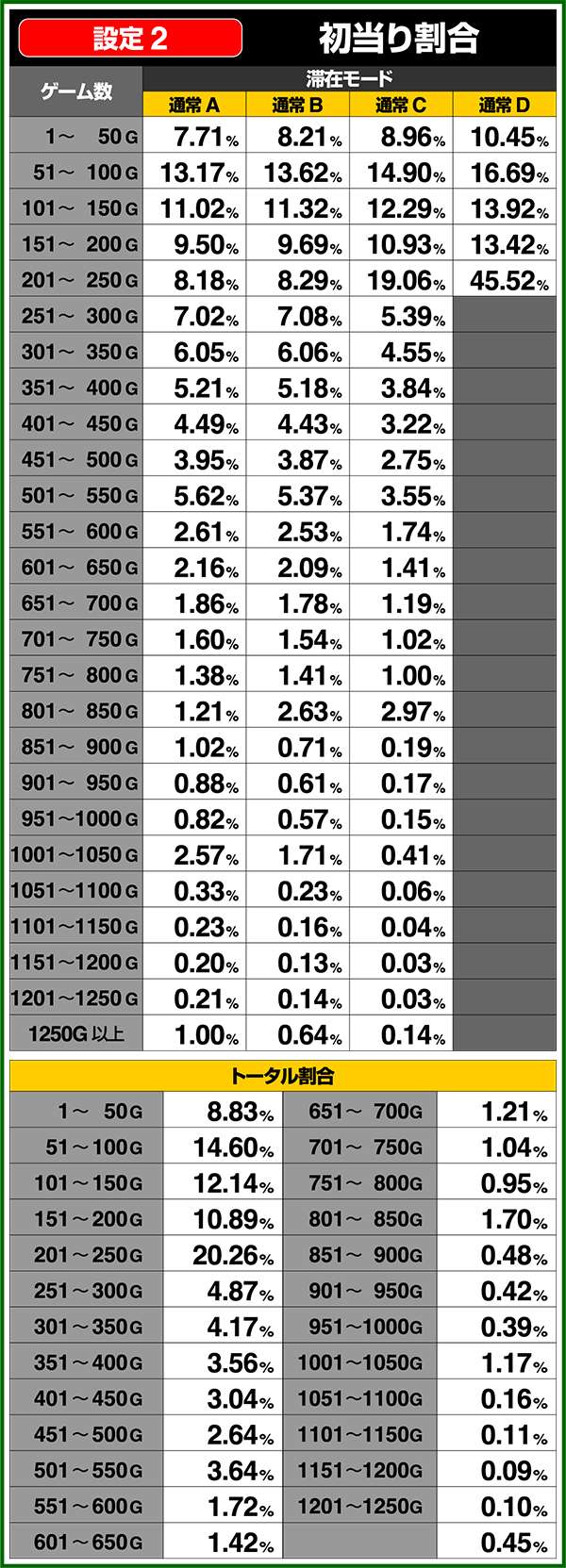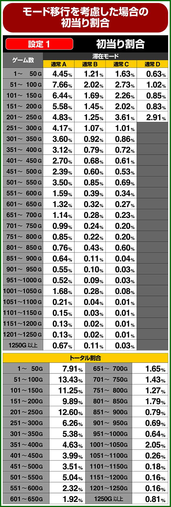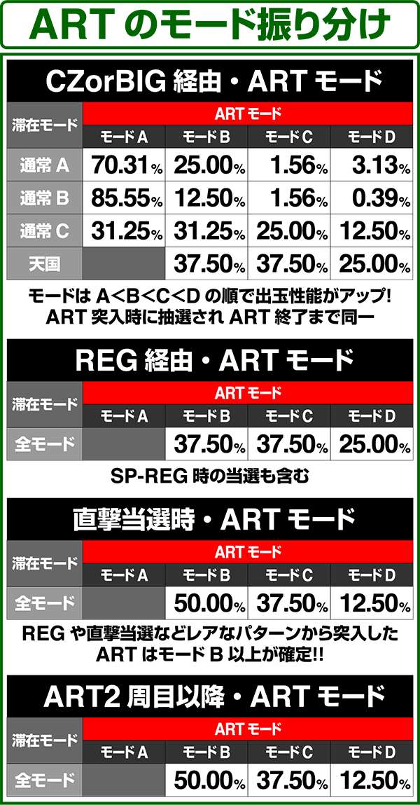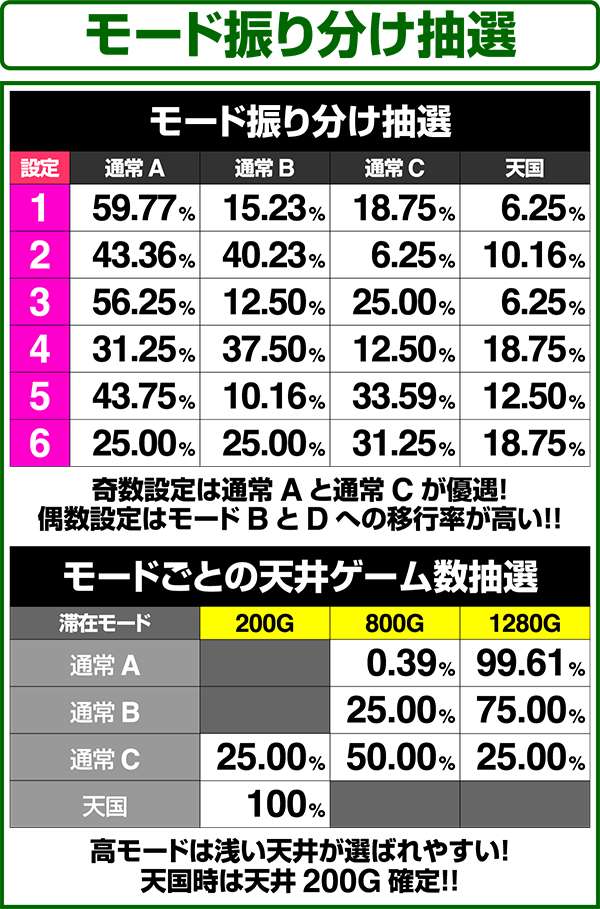 通常時はA〜Dの4種類のモードがあり、高設定ほど上位のモードが選ばれやすく、モードによって初当たり確率や天井ゲーム数の振り分けが変化する。