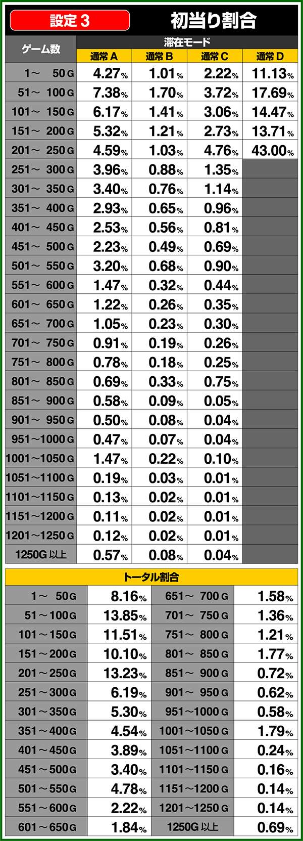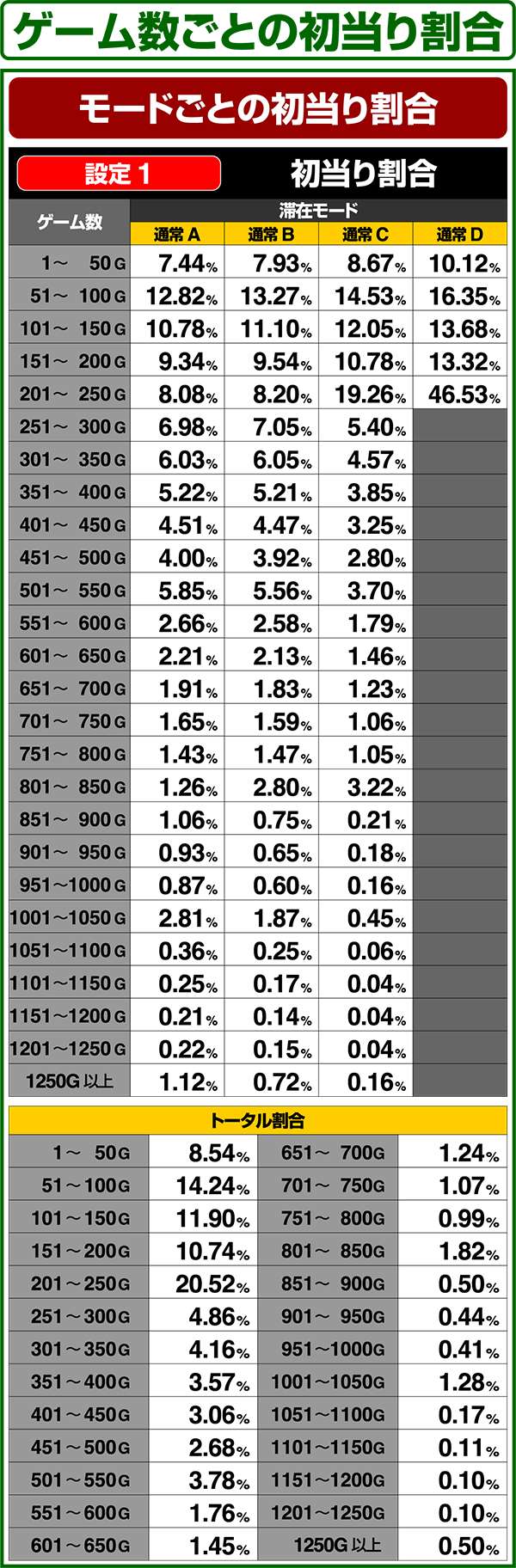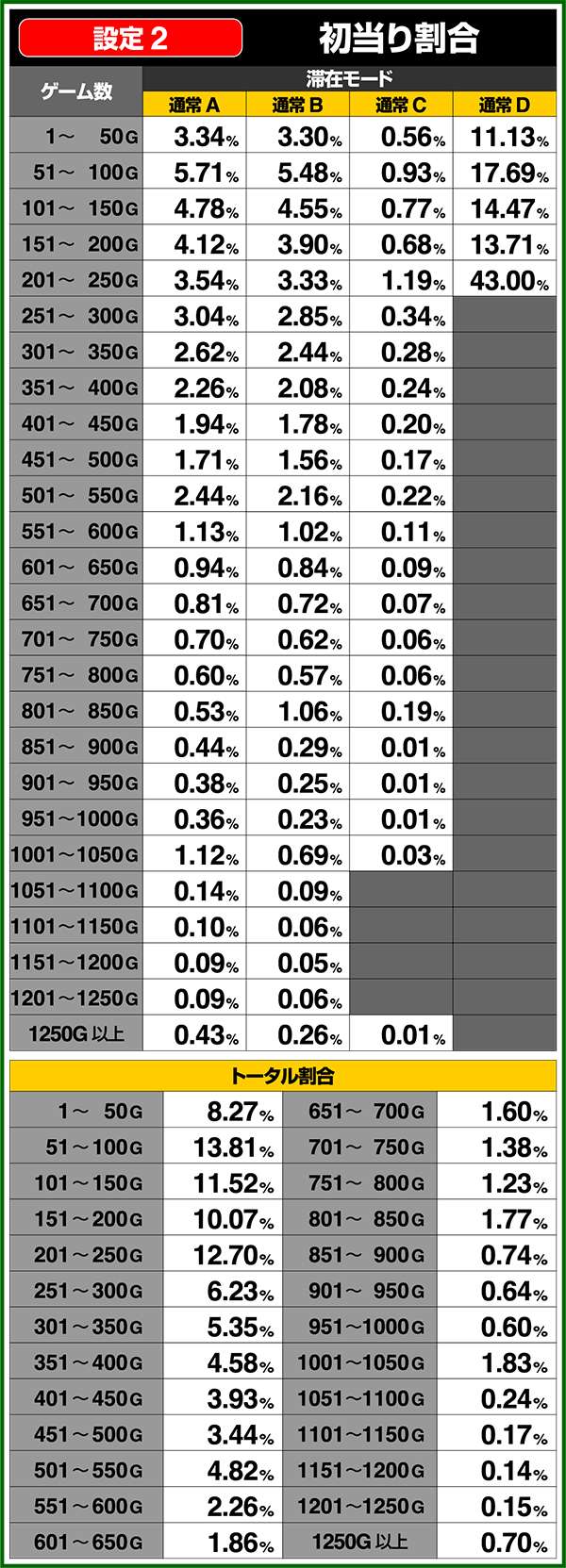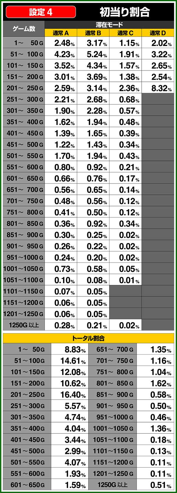 通常時はA〜Dの4種類のモードがあり、高設定ほど上位のモードが選ばれやすく、モードによって初当たり確率や天井ゲーム数の振り分けが変化する。