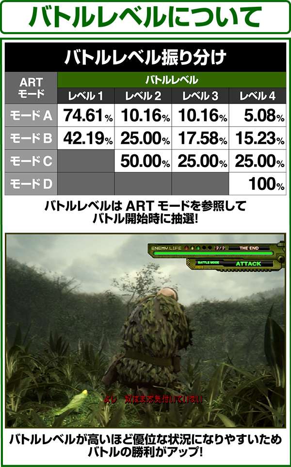 ARTモードが高いほど高いバトルレベルが選ばれやすく、バトルレベルが高いほど勝利しやすくなっている。