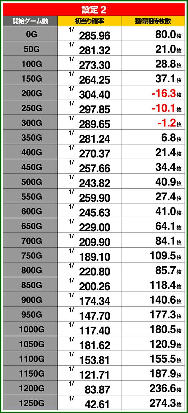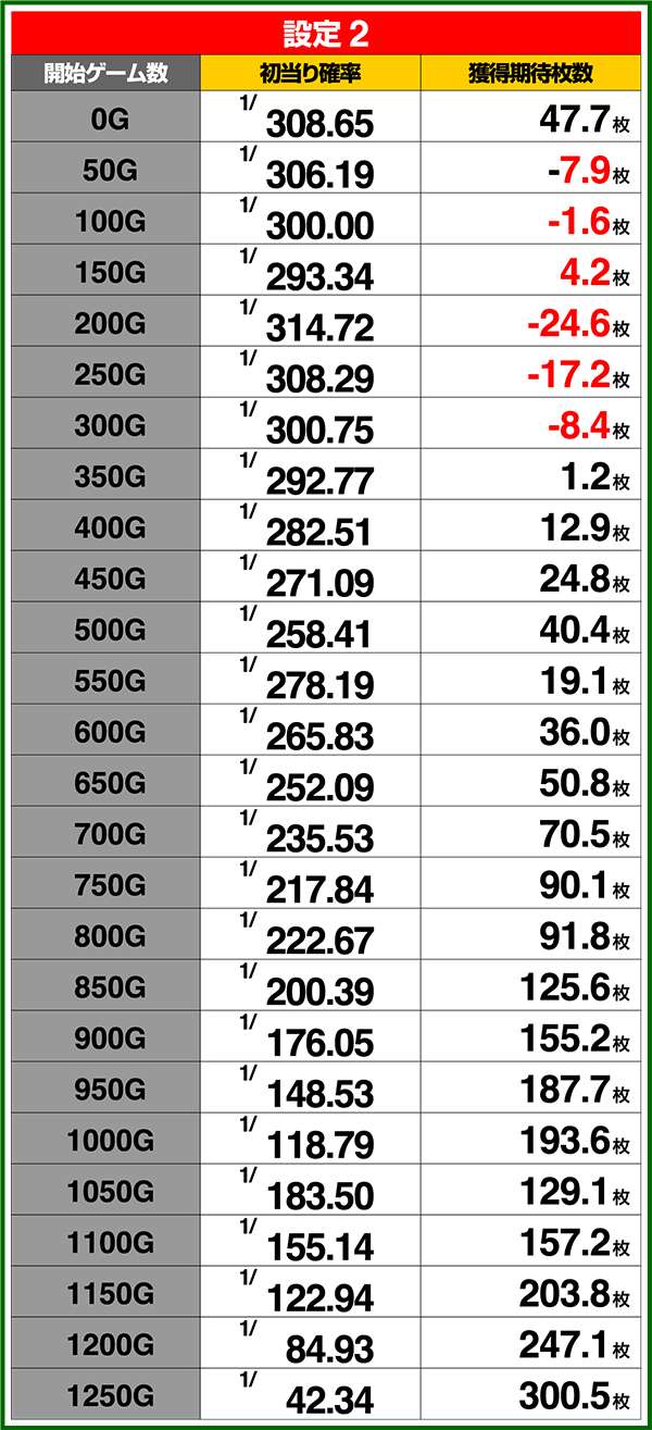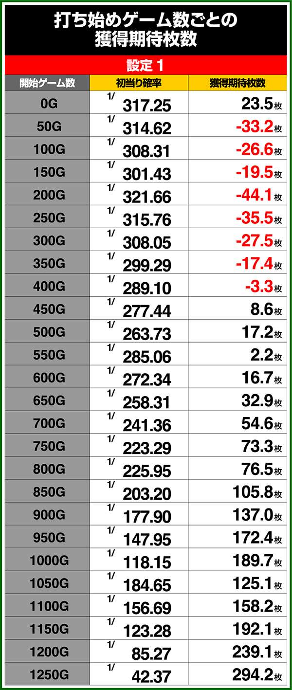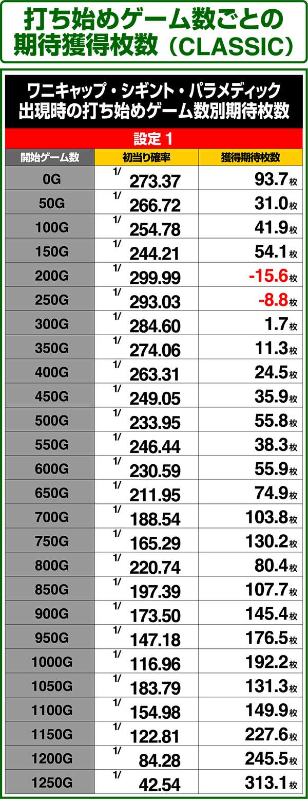 特定のミニキャラ出現時を含む打ち始めゲーム数ごとの期待獲得枚