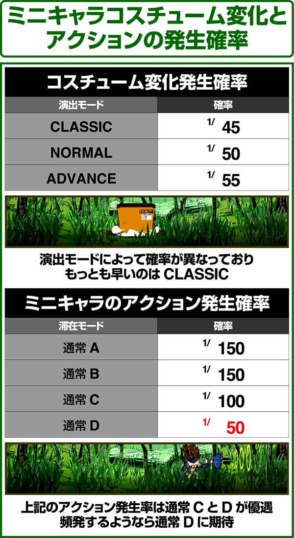 ミニキャラのコスチュームの変化とアクションの発生確率