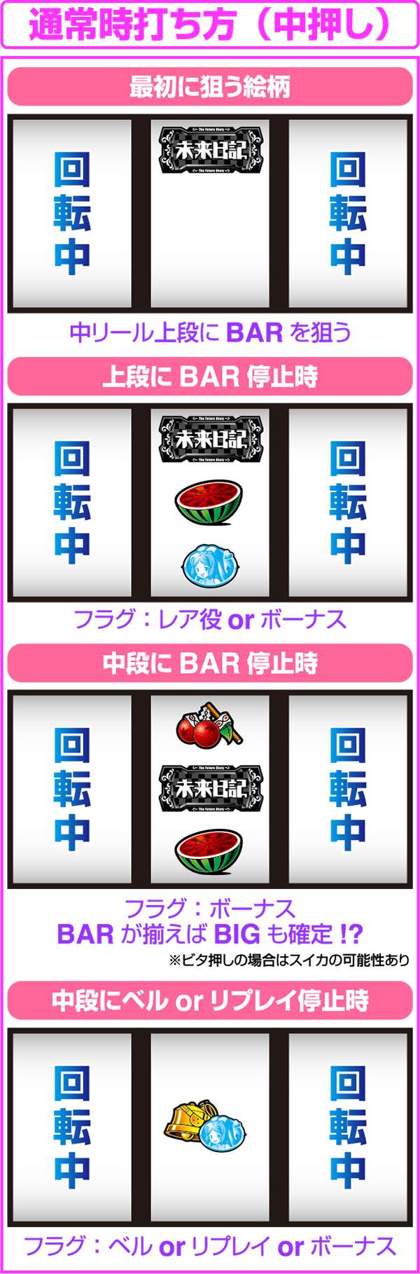 通常時に中押しをすれば、ほぼ全てのフラグを判別可能。また、中押しでBARが下段に停止した時はハズレ濃厚となるため、左・右リールはフリー打ちでOKだ。