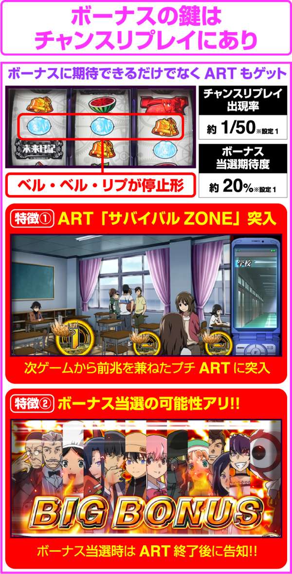 独創的なストーリーで話題を呼んだ人気作品が、斬新なボーナス+ARTタイプとして登場。 スペックはボーナスタイプに限りなく近いモノとなっており、あくまで出玉増加の軸となるのはボーナスとなる。 ARTはボーナス当選のメイン契機となるチャンスリプレイ後に突入する仕組みとなっており、平均12G継続(設定1)。 このARTが存在することにより、通常時のゲーム性がよりチャンスを体感しやすいものとなっている。 |