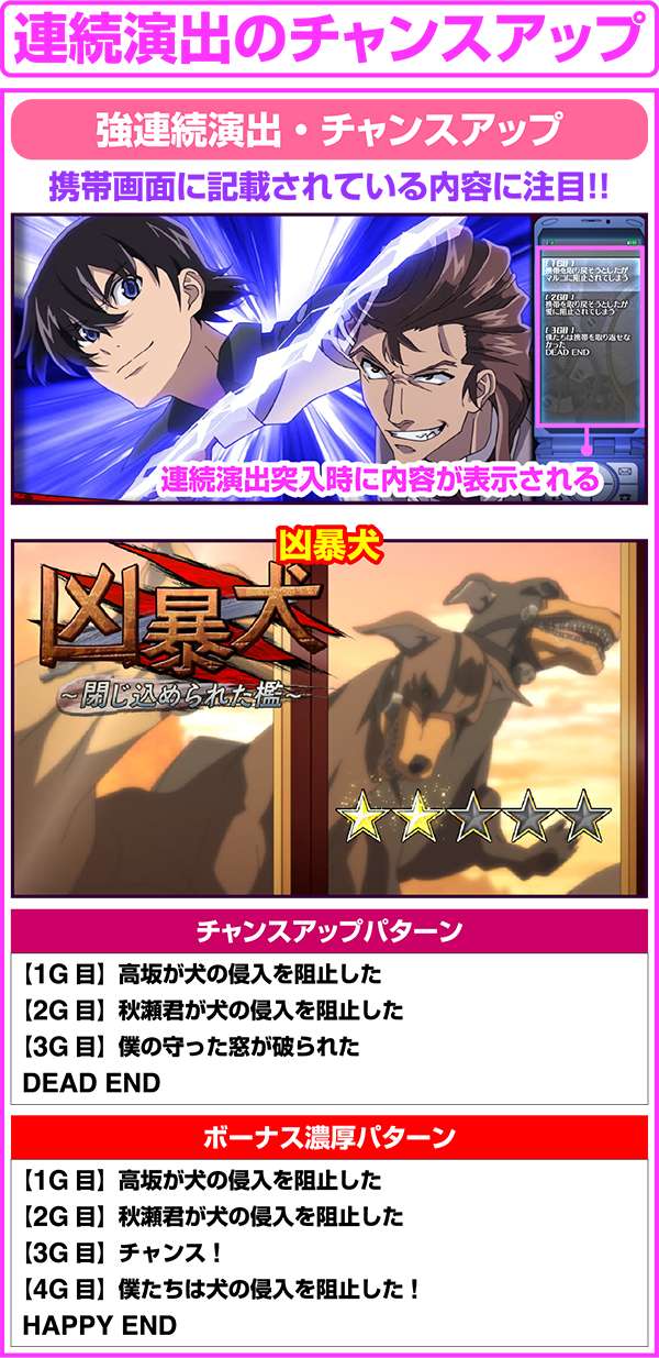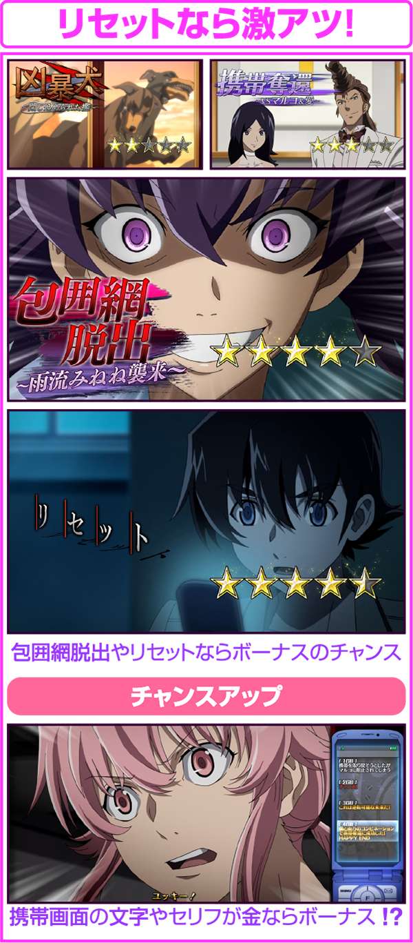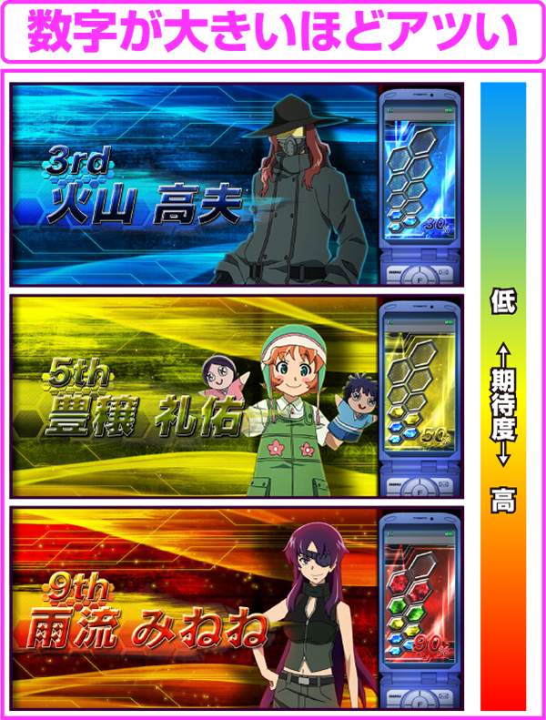 連続演出中は液晶右にある携帯電話の内容が変更されればチャンス。変更された内容や、キャラのセリフが金文字なら超激アツだ。
