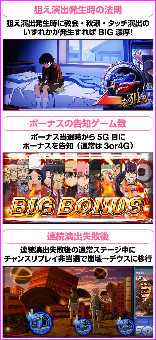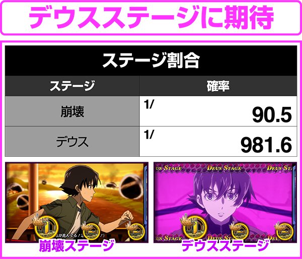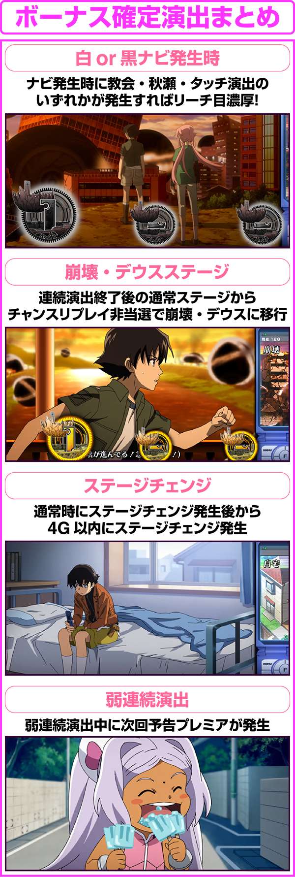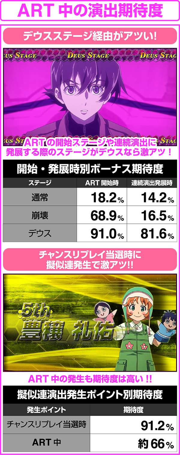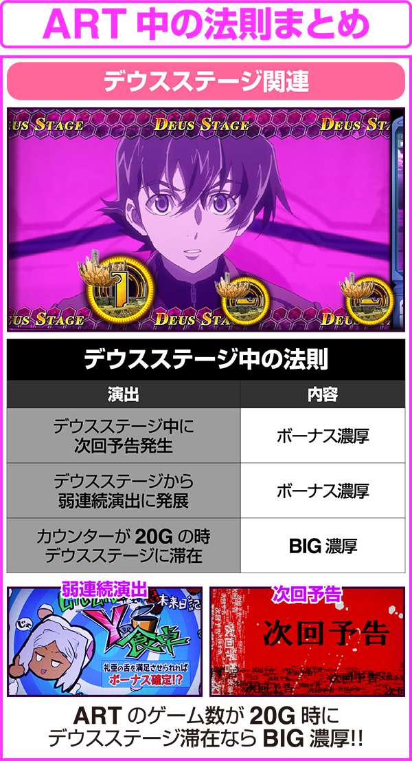 ART開始時に崩壊ステージから開始すれば、ボーナスのチャンスとなり、デウスステージなら激アツとなる。また、連続演出に発展するゲーム数も重要で、ARTの開始直後や13G以上での発展ならばアツい。チャンスアップとなる発展時の擬似連演出発生にも期待したい。