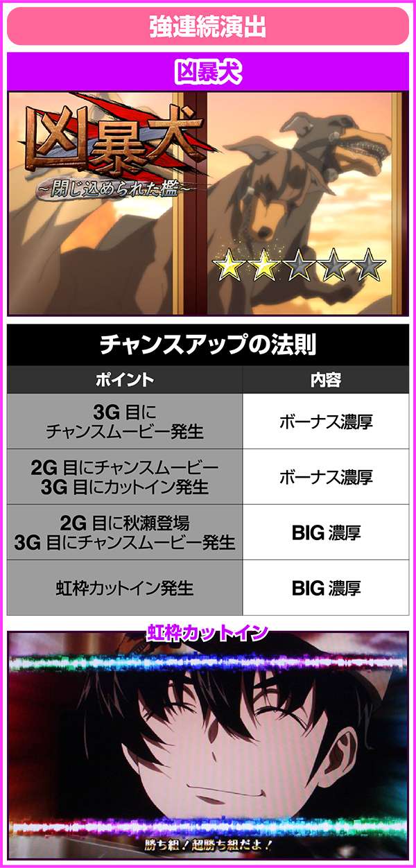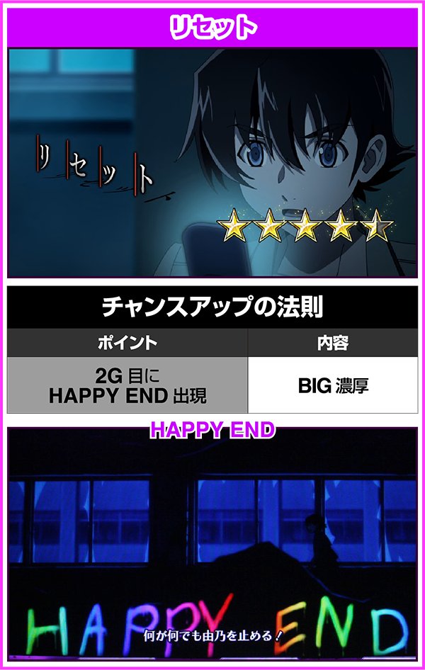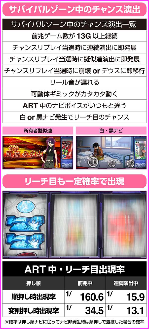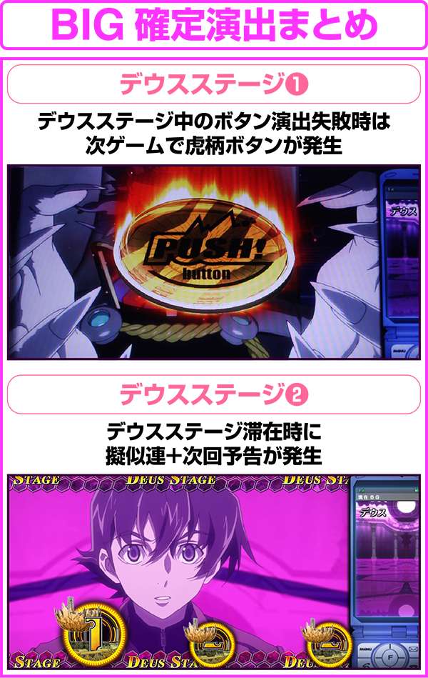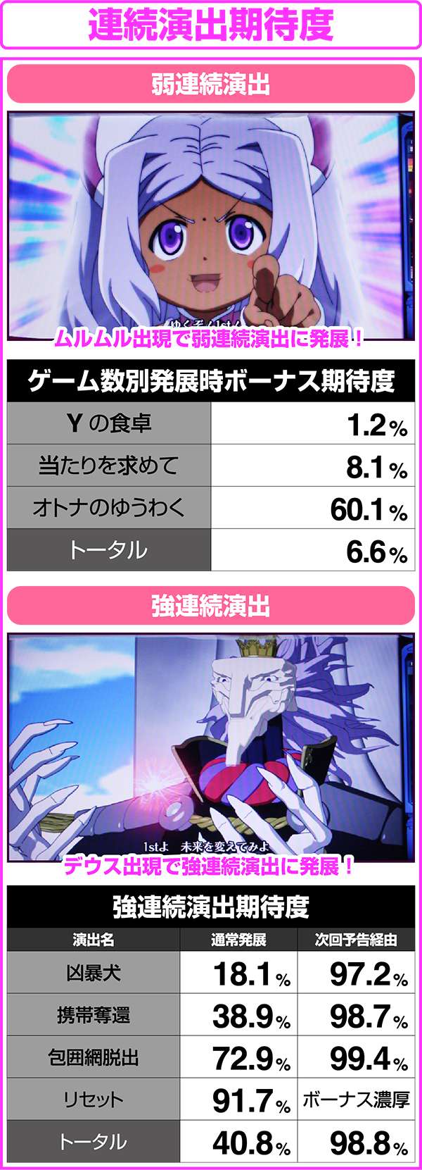 ART開始時に崩壊ステージから開始すれば、ボーナスのチャンスとなり、デウスステージなら激アツとなる。また、連続演出に発展するゲーム数も重要で、ARTの開始直後や13G以上での発展ならばアツい。チャンスアップとなる発展時の擬似連演出発生にも期待したい。