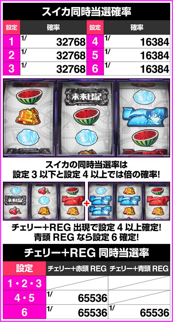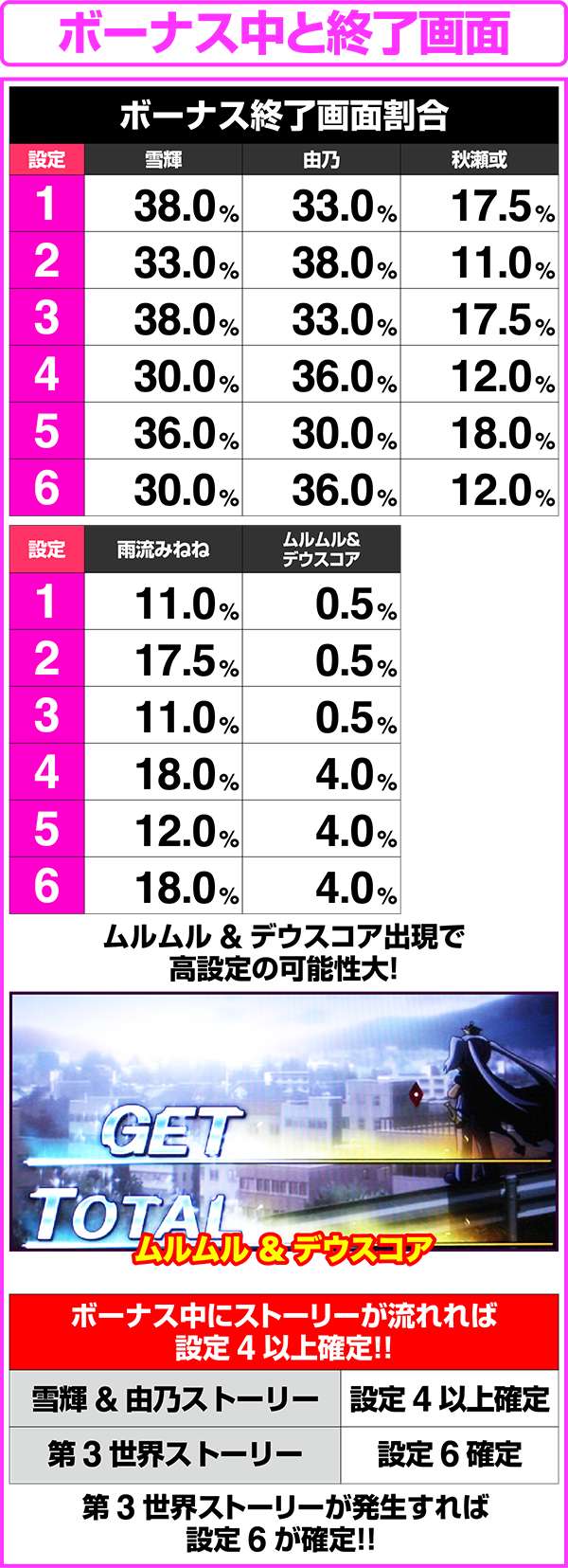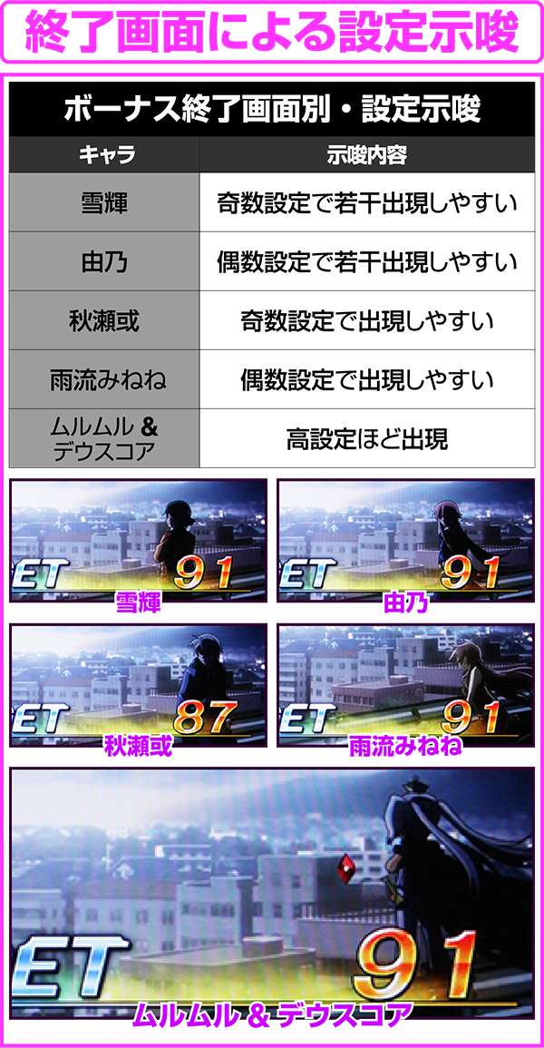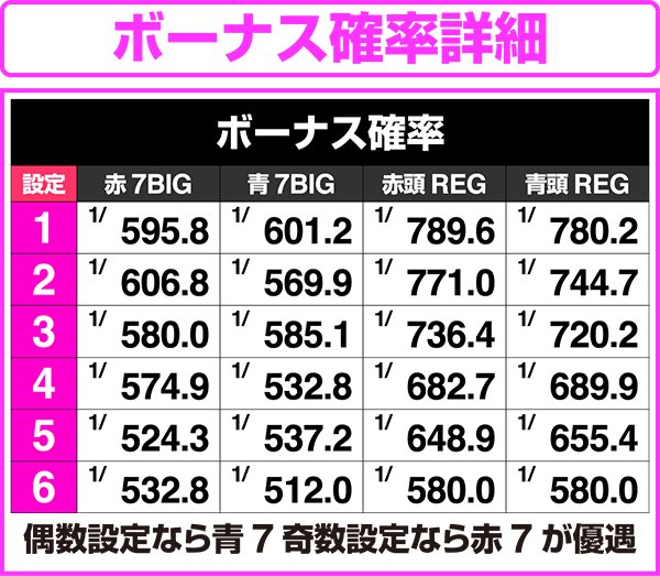 また、赤7or青7(上)のビタ押しに成功した場合のみ効果音が発生する。さらに、ボーナス終了画面は複数あり、設定判別の鍵を握っている可能性も…!?