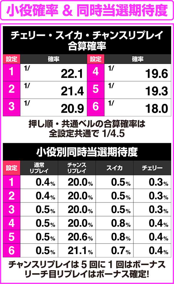 チャンスリプレイは、ボーナスにおけるメインの当選契機。また、チャンスリプレイ当選後はボーナスの当落に関わらずART状態となる。この間はリプレイとベルの押し順ナビが発生。ナビ通りに押していれば出玉が微増するが、押し順を間違えるとART状態が終了してしまう可能性があるので注意しよう。