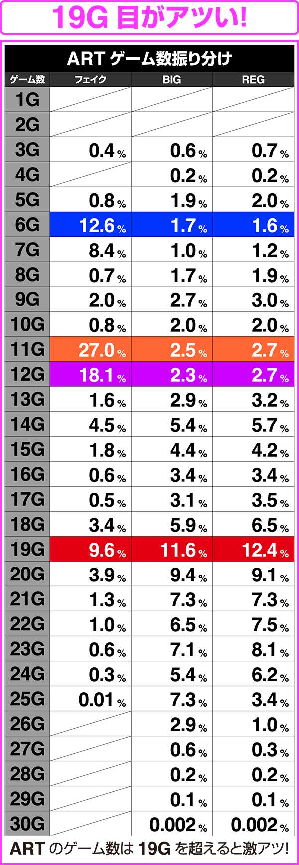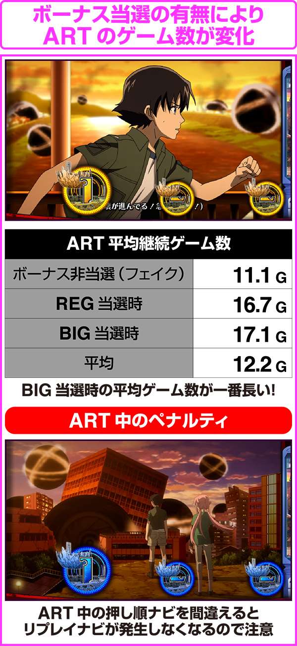 チャンスリプレイ当選時に突入するARTは内部的にゲーム数が決まっている。ボーナス当選時は平均してゲーム数が長いといった特徴があるため、13Gを超えた際はボーナスの期待が高まる。また、ART中に押し順ナビを間違えてしまうと、ベルナビしか発生しなくなるため注意しよう。
