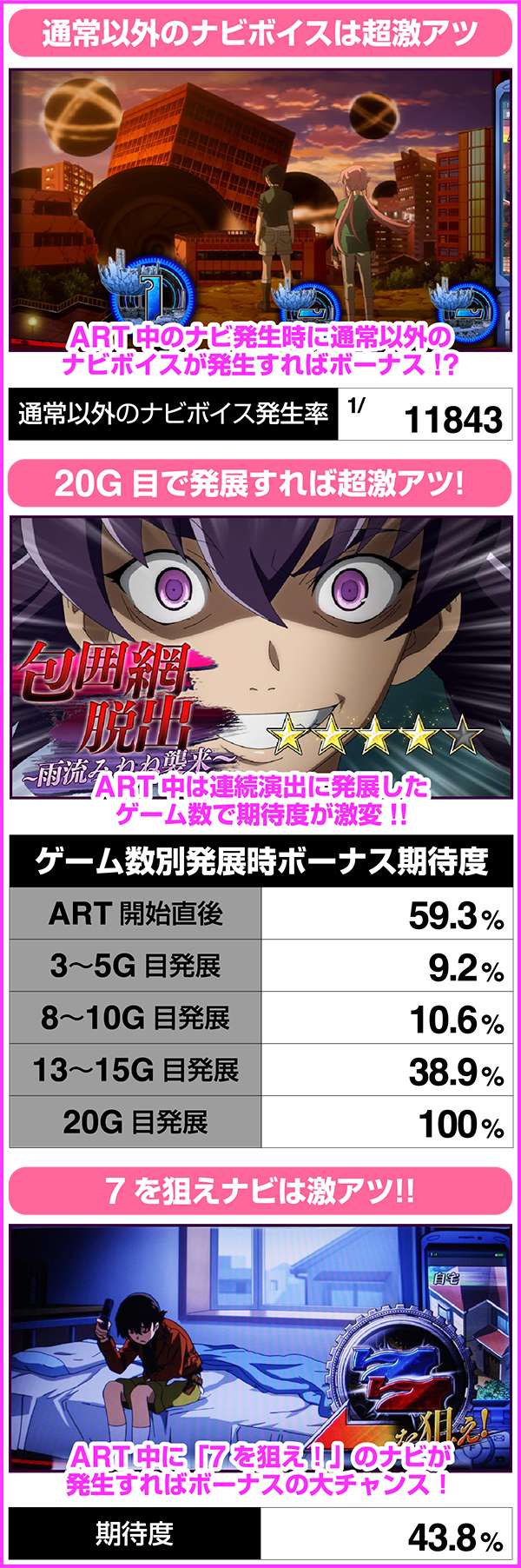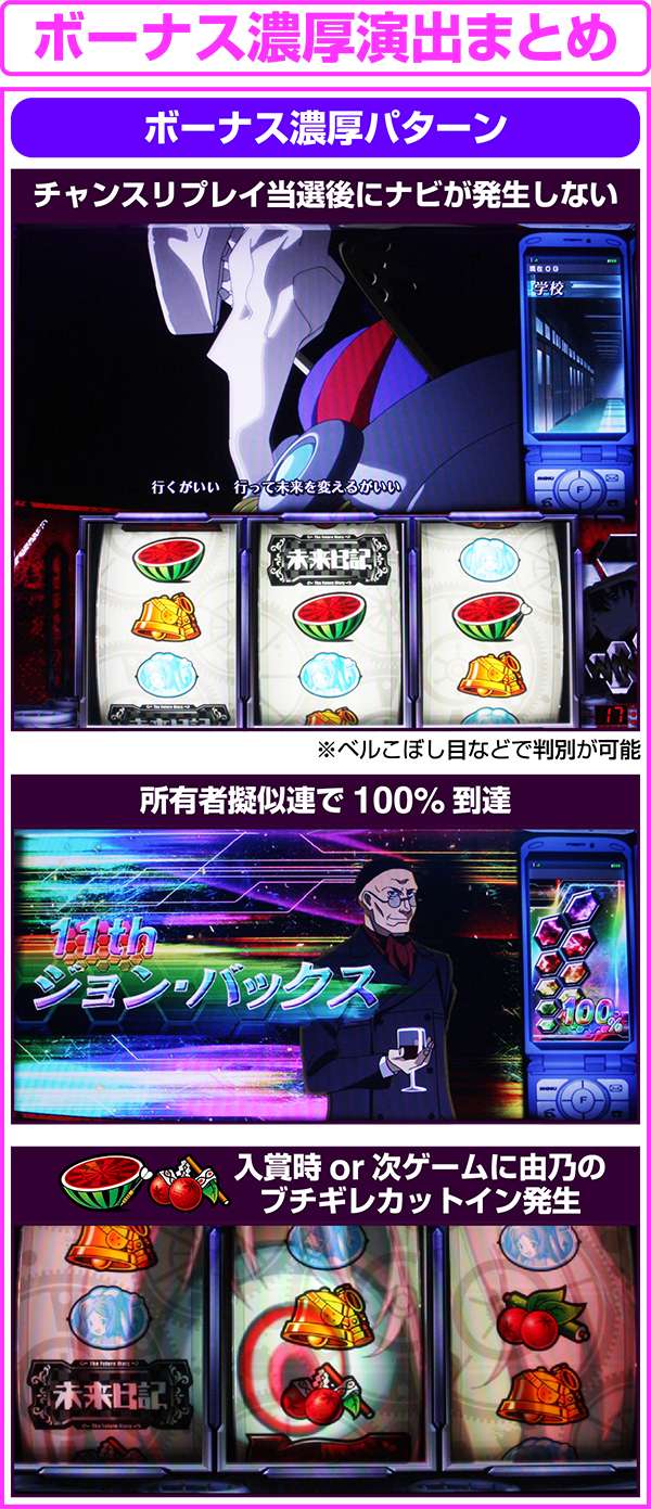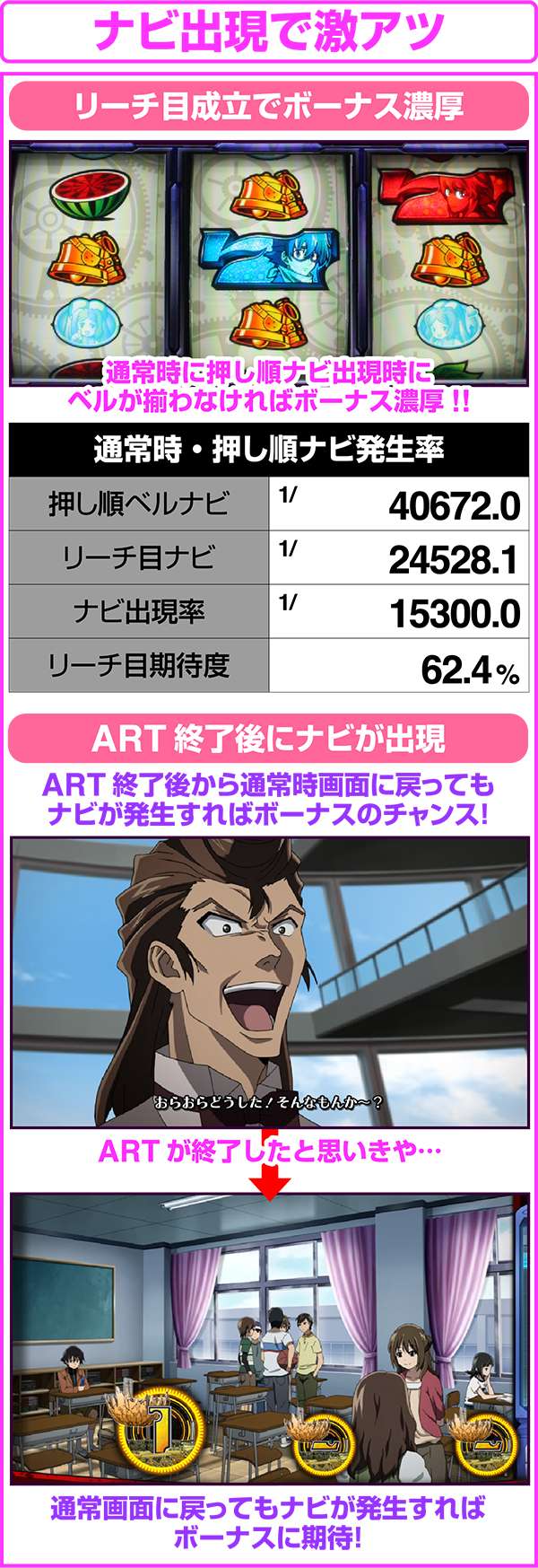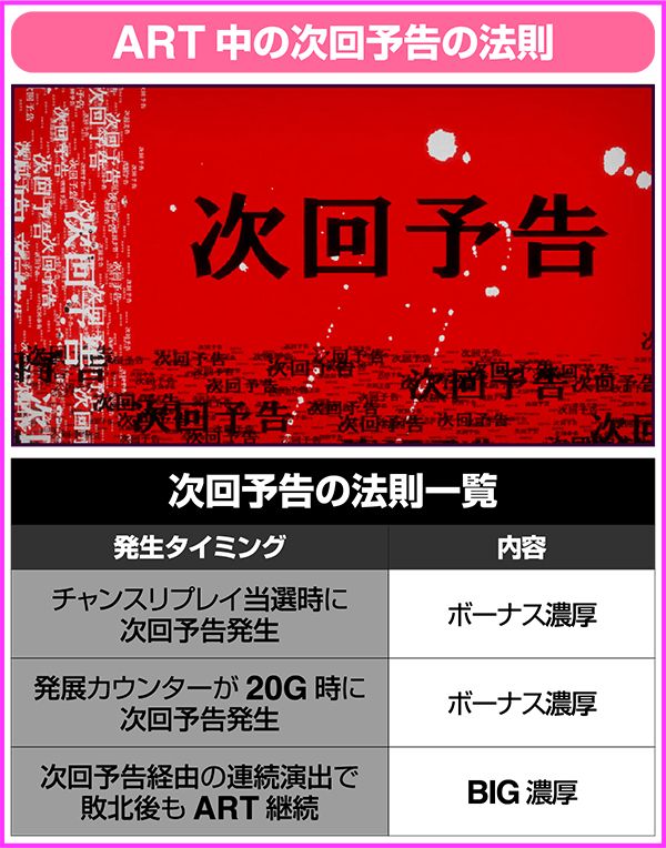 ART中の20G目に次回予告が発生すればボーナス濃厚。おなじく、ART中に次回予告経由の連続演出で敗北した際に、通常画面に戻ってもナビが出現すればBIGが濃厚となる。