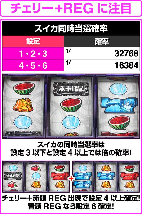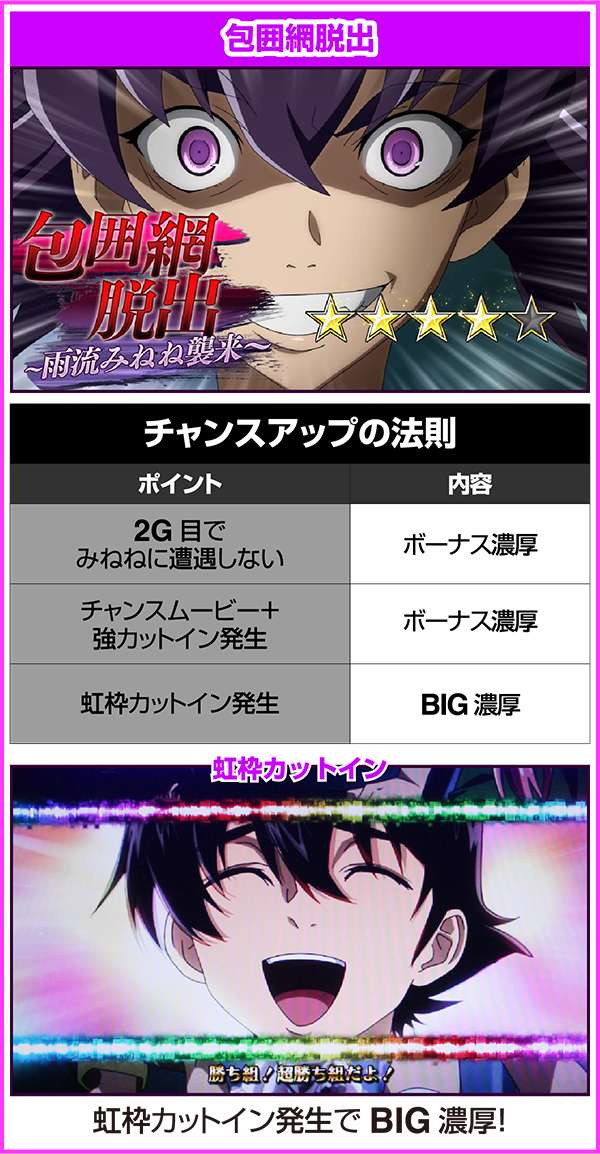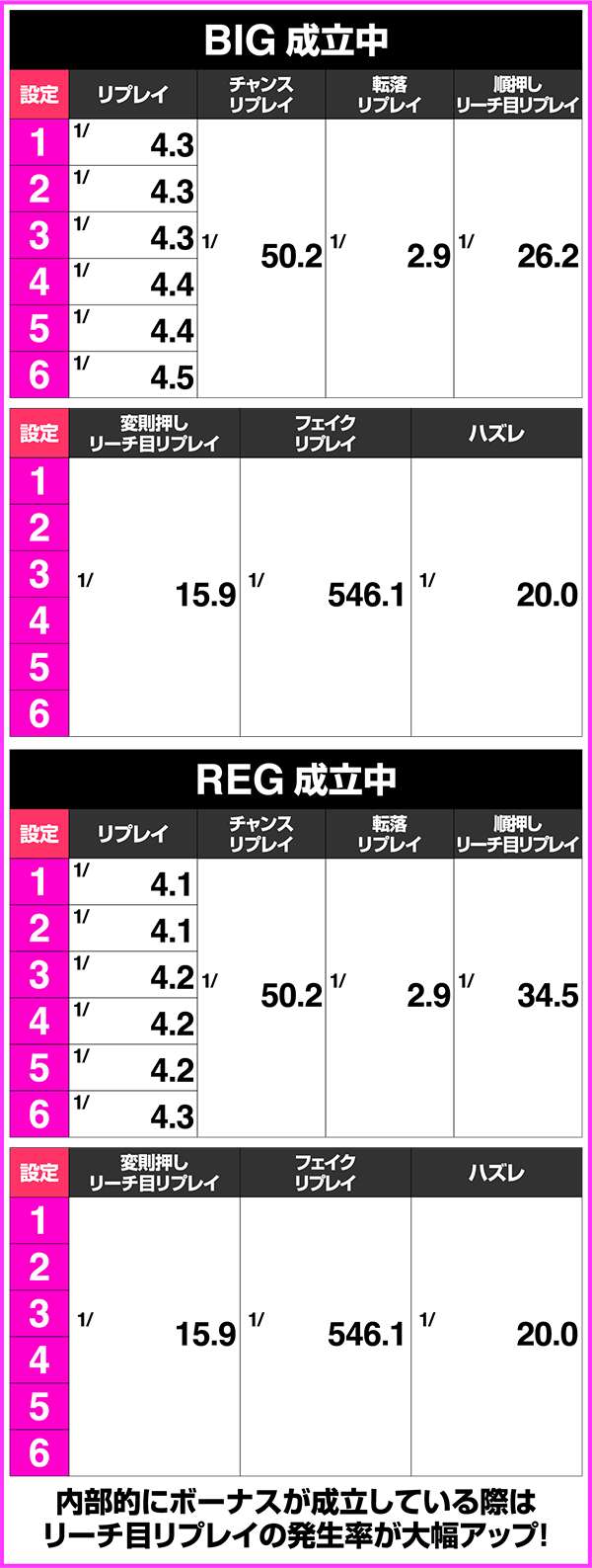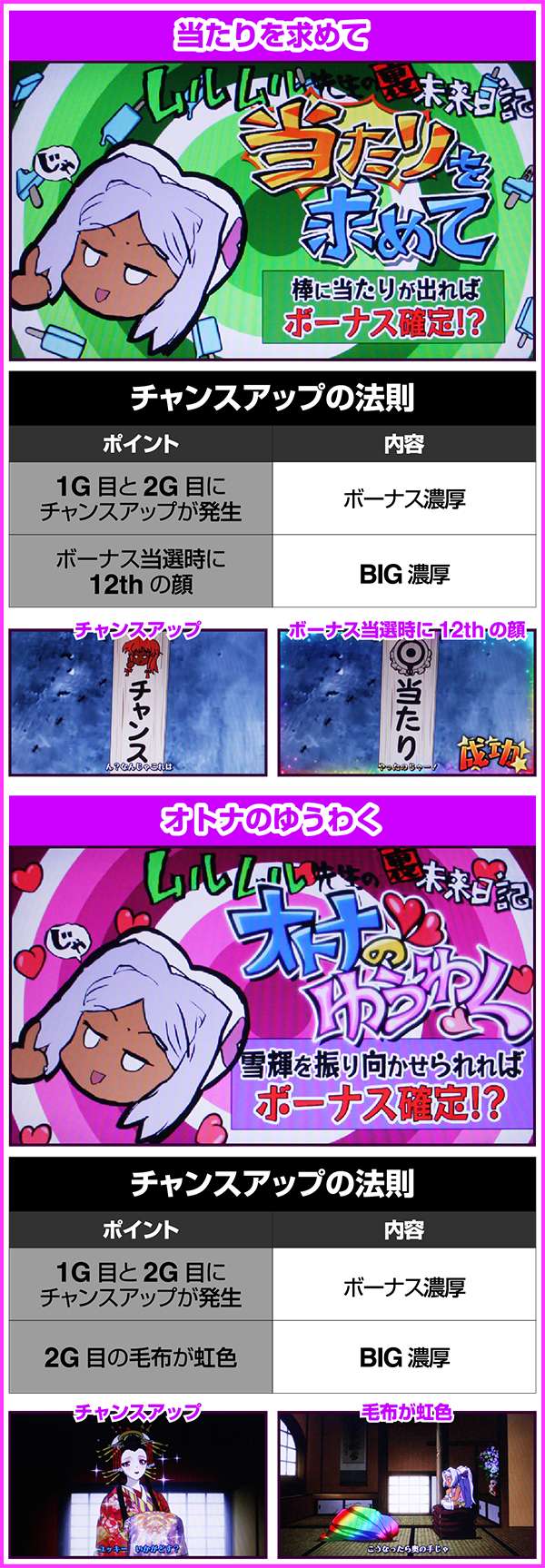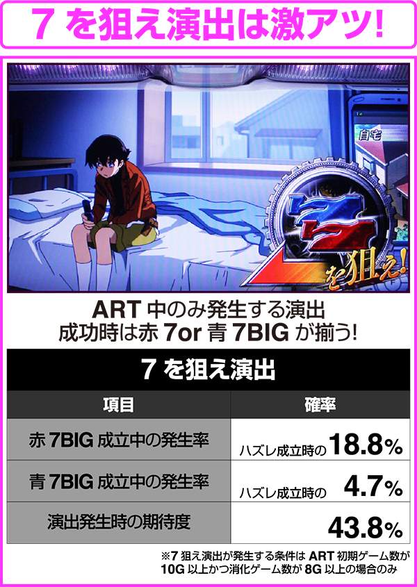 ART中の20G目に次回予告が発生すればボーナス濃厚。おなじく、ART中に次回予告経由の連続演出で敗北した際に、通常画面に戻ってもナビが出現すればBIGが濃厚となる。