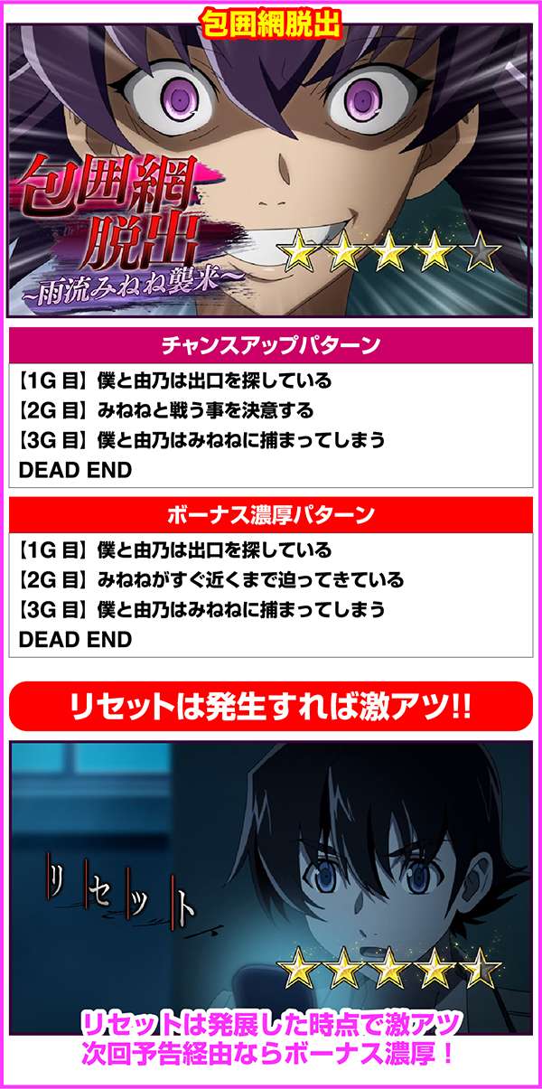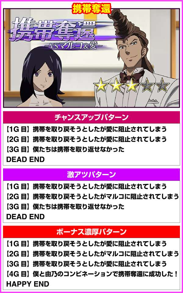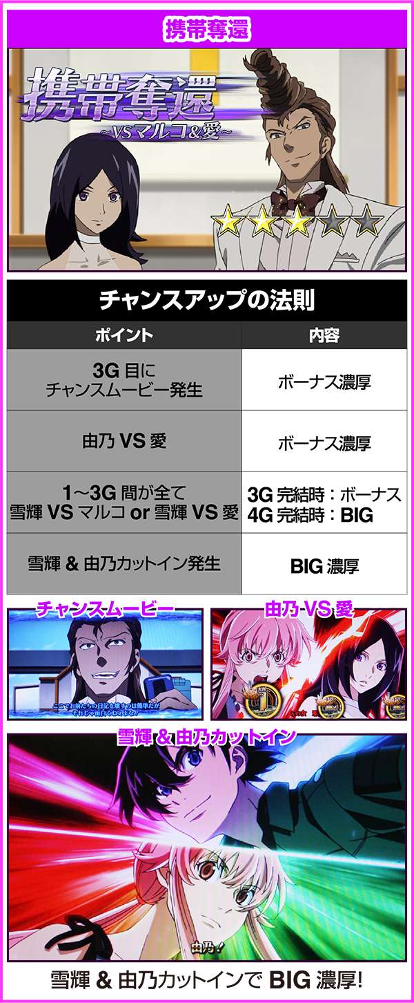 携帯奪還は1Gごとに雪輝or由乃VSマルコor愛のバトルが発生する。それが、1〜3G間すべて雪輝VSマルコか雪輝VS愛で完結すればボーナス濃厚。さらに、3G目で継続し、4G目に発展すればBIGが濃厚となる。
