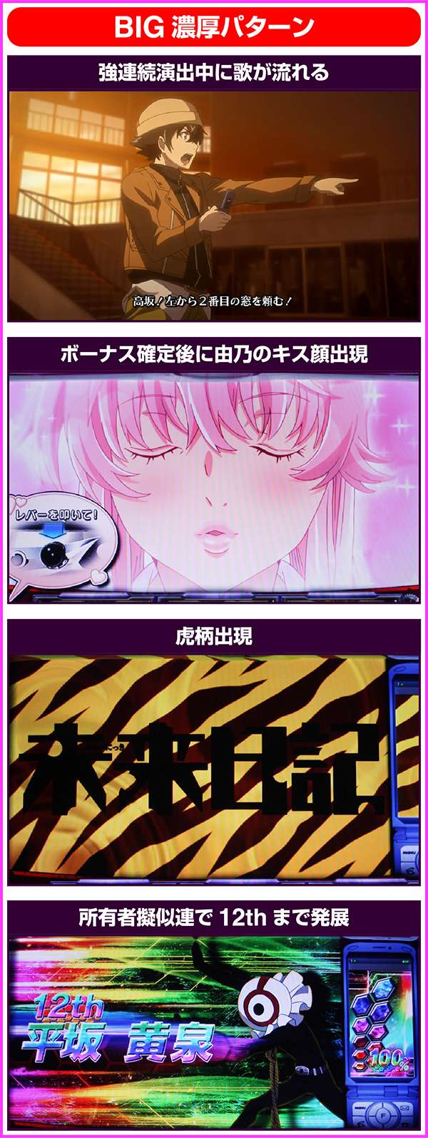演出に成功した場合は、どちらかの7絵柄が揃い、そのままBIGがスタートする。失敗時(7絵柄が揃わない)はフェイクリプレイとなる。
