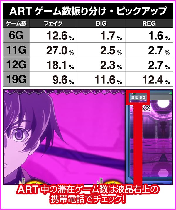 ARTのゲーム数でボーナスの期待度が激変するため、滞在ゲーム数はチェックしておこう。19Gを超えるとボーナスの可能性が高くなるので、液晶右上のゲーム数に注目!