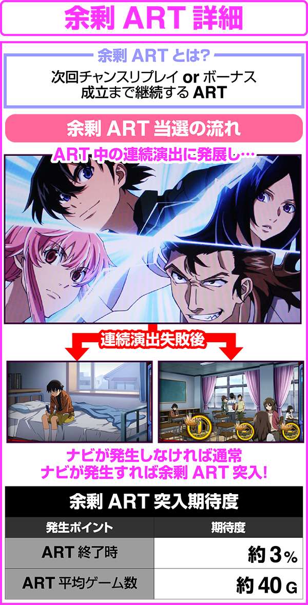余剰ARTの抽選タイミングはART終了時で、当選すればART終了後の通常画面でもナビが発生する。