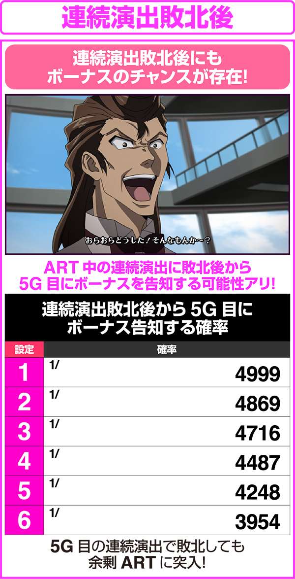 連続演出失敗から5G後にボーナスを告知するパターンも存在。失敗時もナビが継続した場合は期待したい。また、ボーナス非当選でのART終了時には、ARTの継続抽選がおこなわれており、その場合もチャンスリプレイorボーナスに当選するまでナビが継続する。