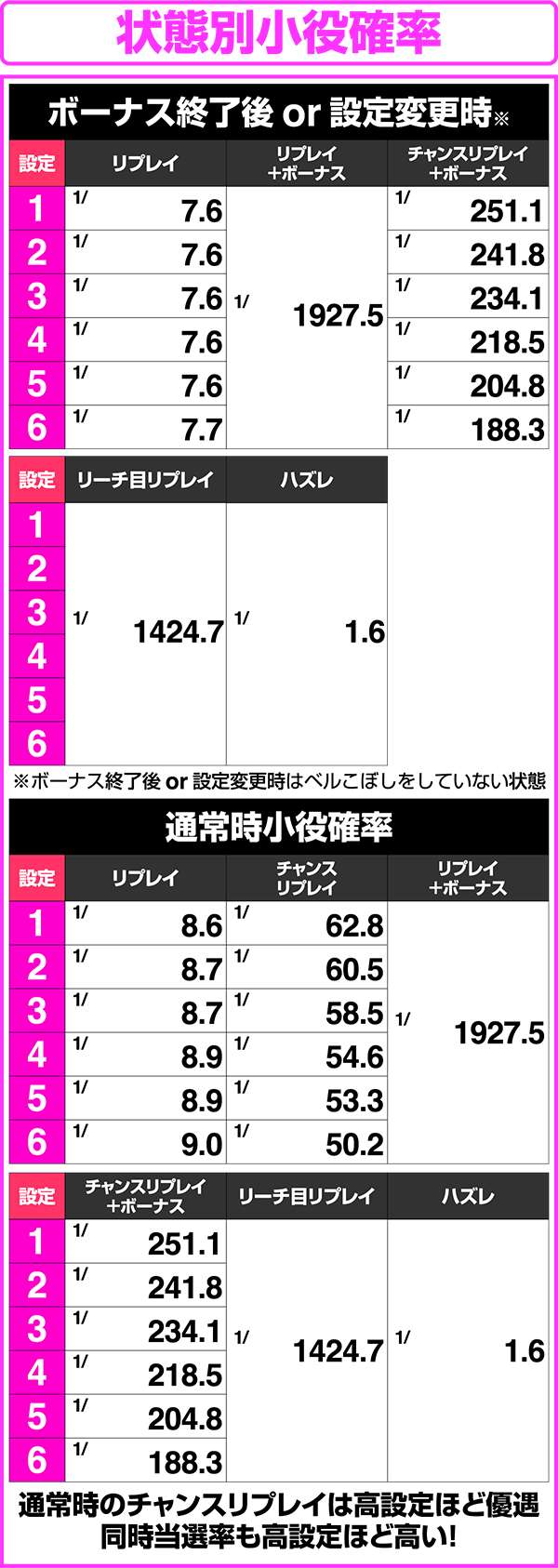 ボーナス終了後と設定変更時はベルをこぼしていない状態が条件。この間は、若干リプレイ確率が高くなるので、設定変更を見抜く要素となりえる。また、この状態でチャンスリプレイが当選すればボーナス確定となる。