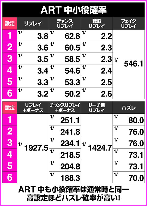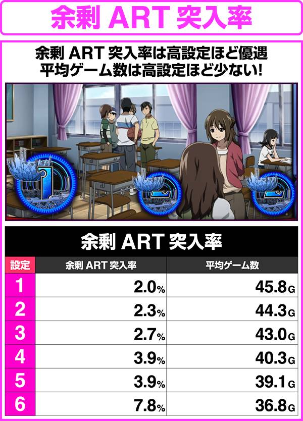余剰ARTとはART終了時に抽選され、当選すれば次回チャンスリプレイorボーナス当選まで継続するART状態を指す。余剰ARTに突入する確率は高設定ほど優遇されている。