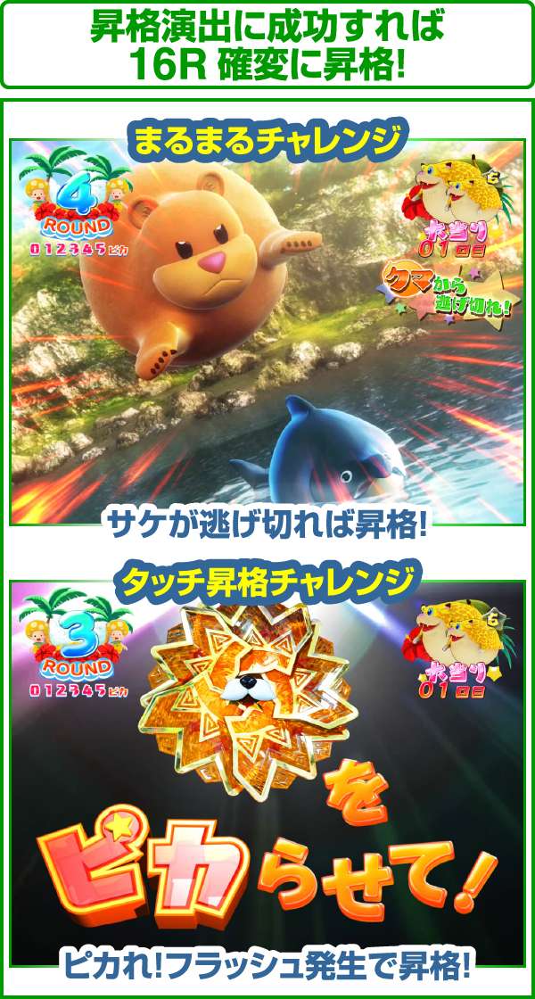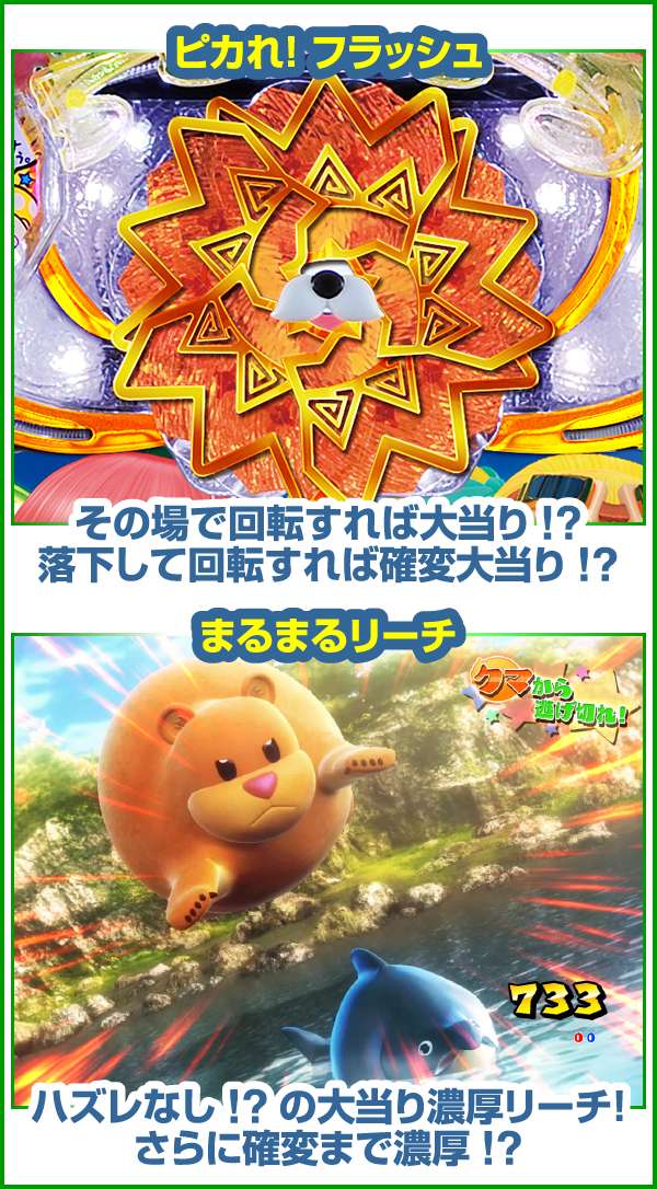 ピカれ!フラッシュは回転のみでは大当り濃厚、回転&落下なら確変も濃厚となる。まるまるリーチはクマに襲われるサケが逃げ切れると大当り。