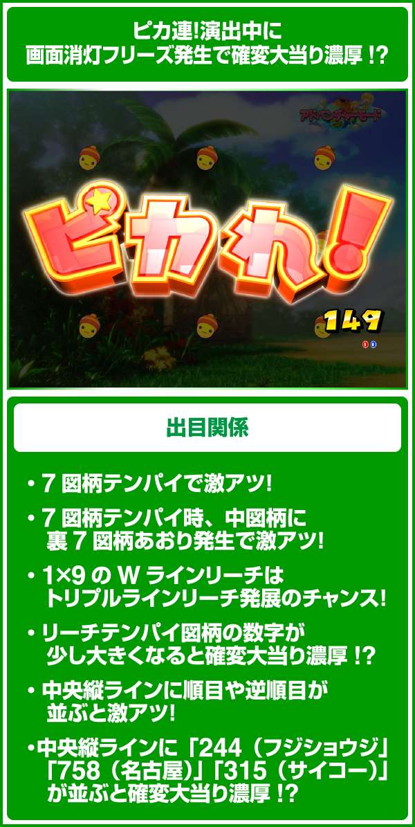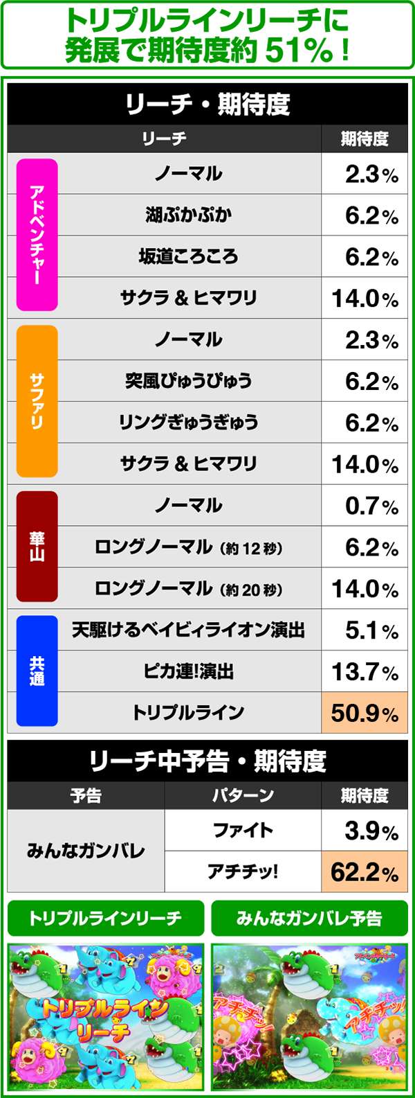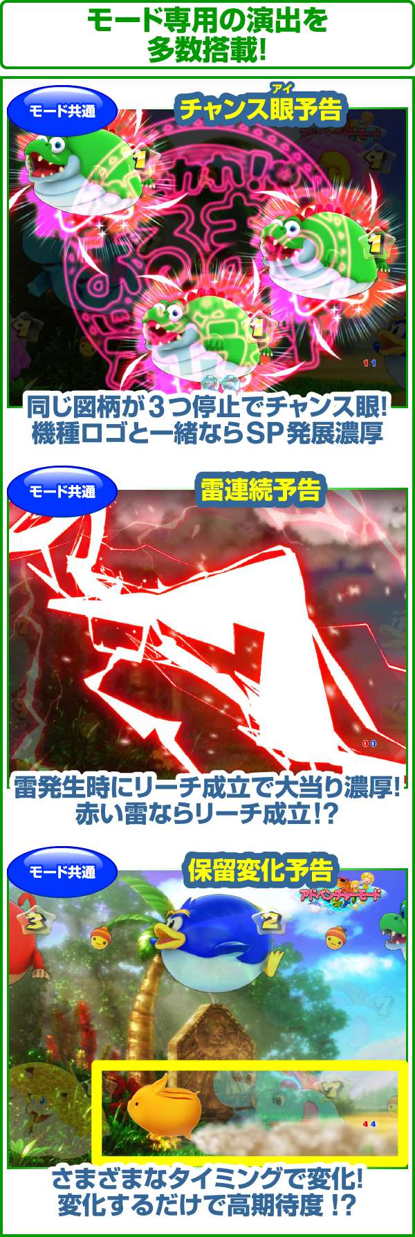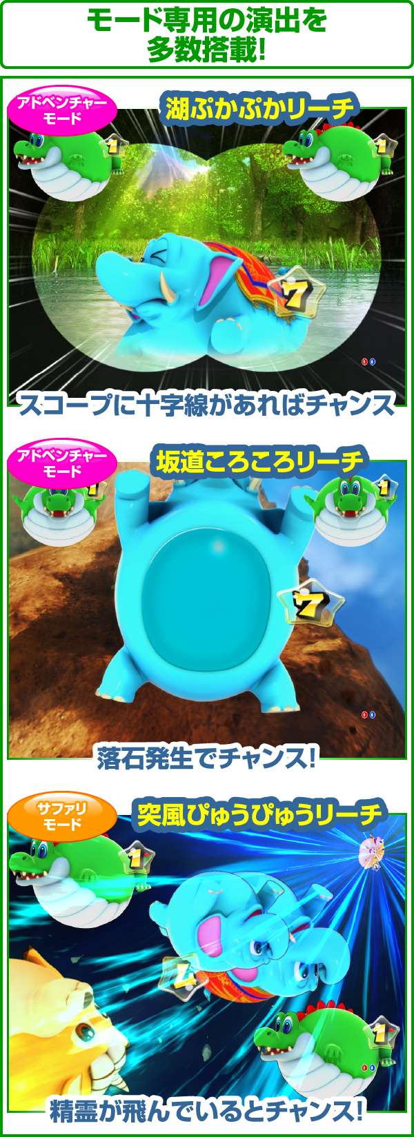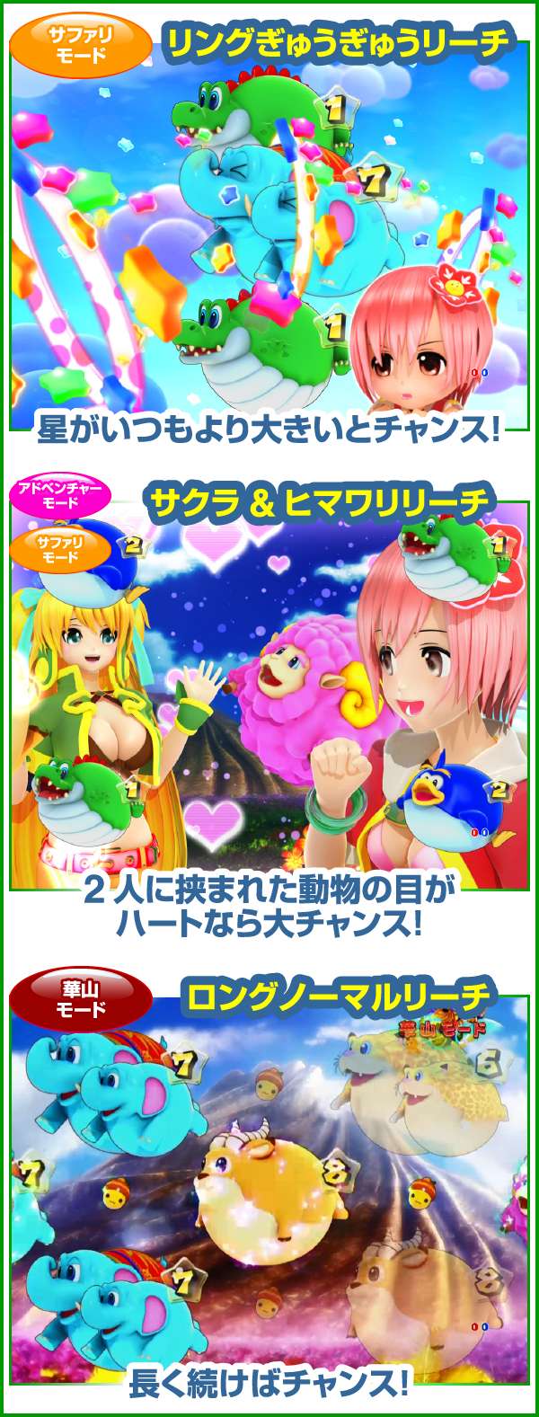 アドベンチャーモードとサファリモードのSPリーチはダブルラインならサクラ&ヒマワリリーチに発展。シングルラインならサクラ&ヒマワリリーチ以外のSPリーチへと発展する。シングルラインで発展するSPリーチは、背景がいつもと違えばチャンスになるぞ!