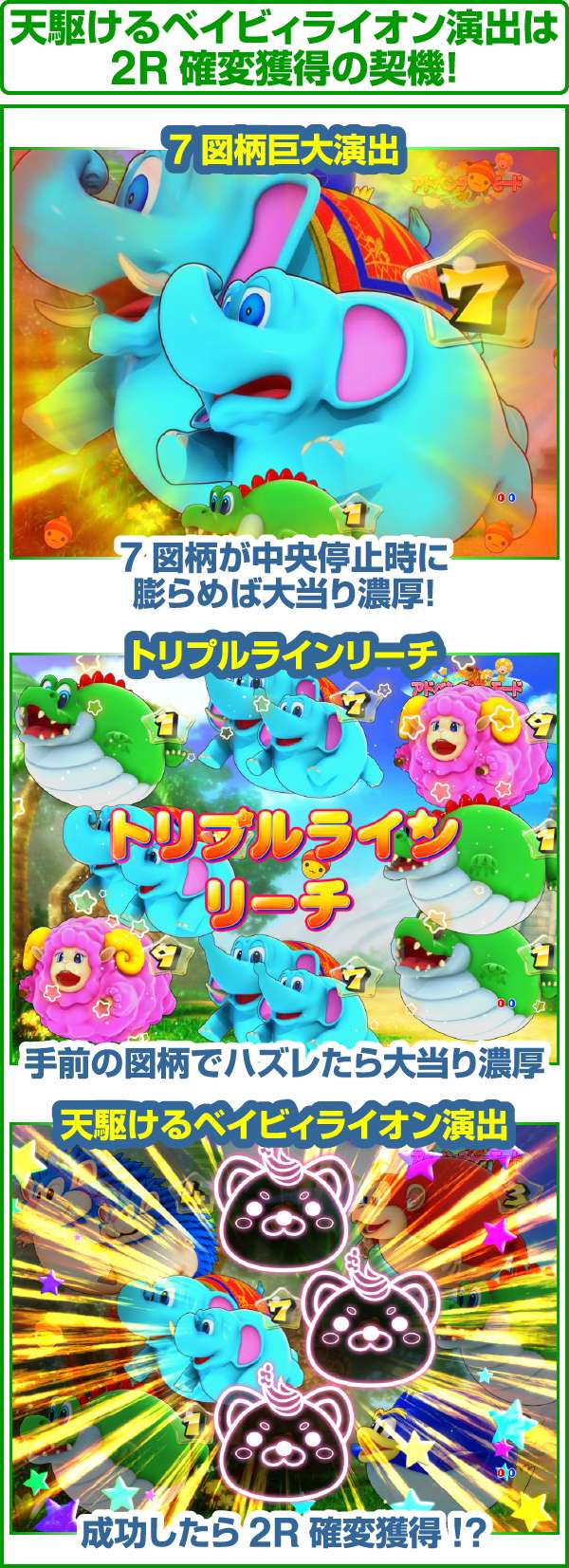 天駆けるベイビィライオン演出は、2R確変からの「まるまるチャンス」突入と思わせて、ピカれ!フラッシュが落下するパターンもあり! 落下時は16R確変を獲得!?