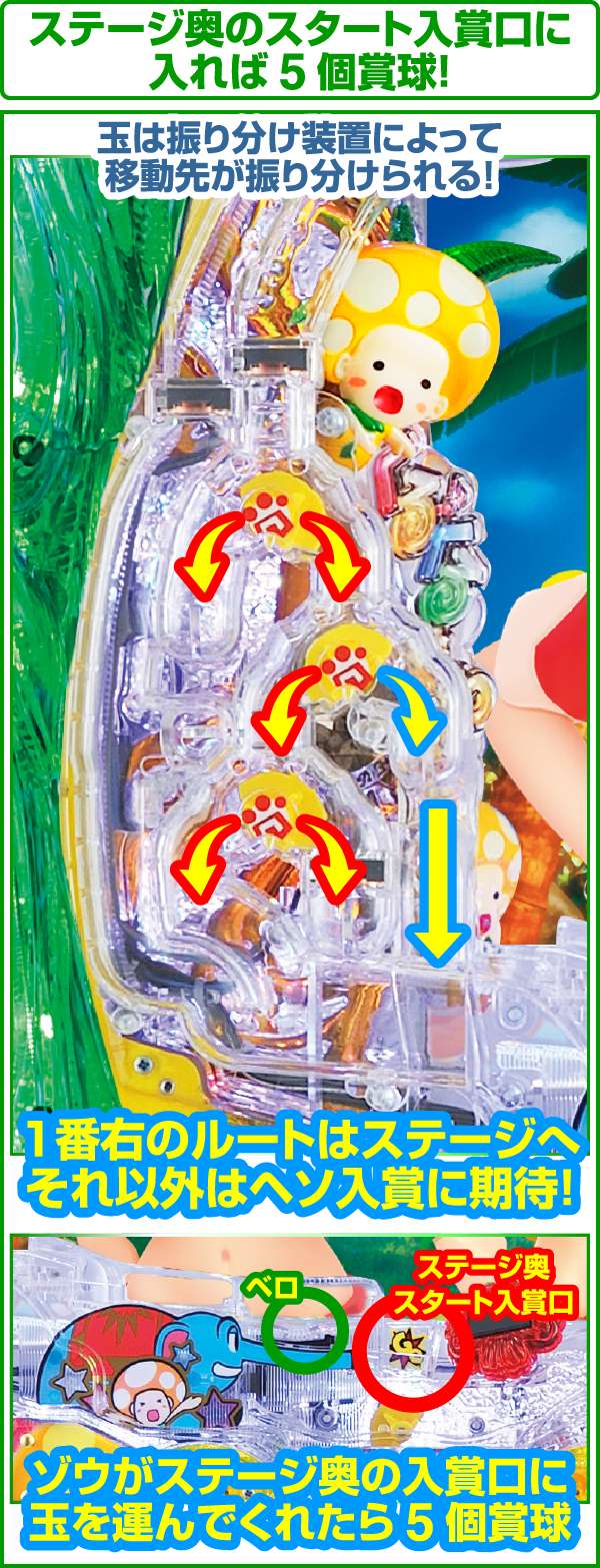 玉が通るたびにクルクル動くキノポックルートは楽しいだけでなく、ステージに玉を誘導する役割も持っているのだ! 1番右のルートに玉がいき、出し入れしているベロをうまく通過できれば、ステージ奥のスタート入賞口へ! このスタート入賞口は5個賞球なので、たくさん入れば玉持ちもアップするぞ!