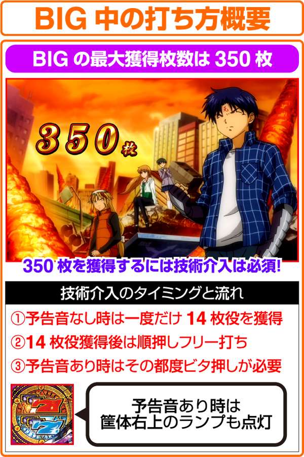 BIGの最大獲得枚数となる350枚を獲得するためには、技術加入が必須となる。まず、予告なし時に一度だけ14枚役を獲得し、以降の予告音なし時は順押しフリー打ち。予告音あり時は、ビタ押しをすることで黒BAR・黒BAR・赤7or黒BAR・黒BAR・青7(どちらも15枚)を同時にフォローできる。