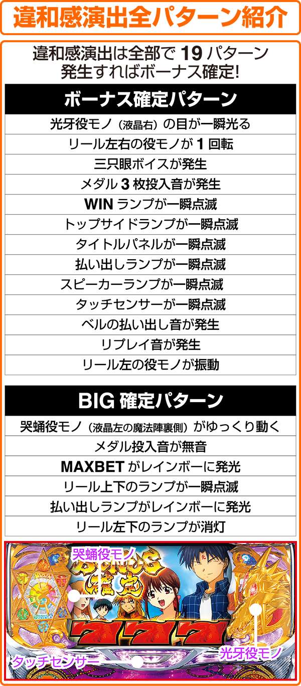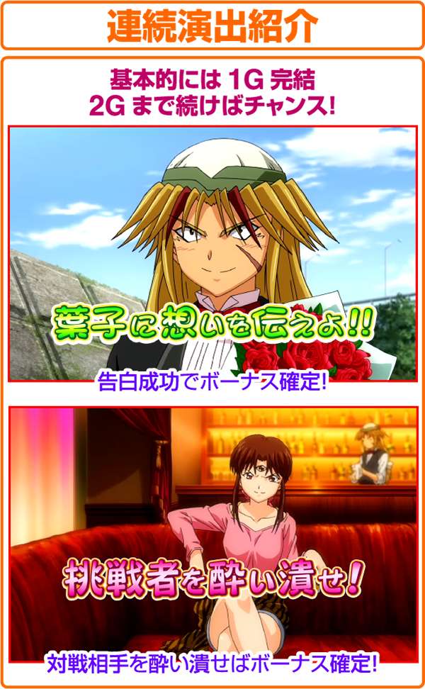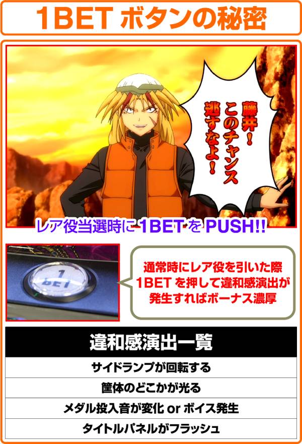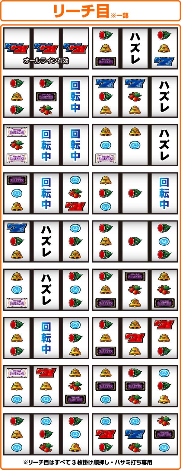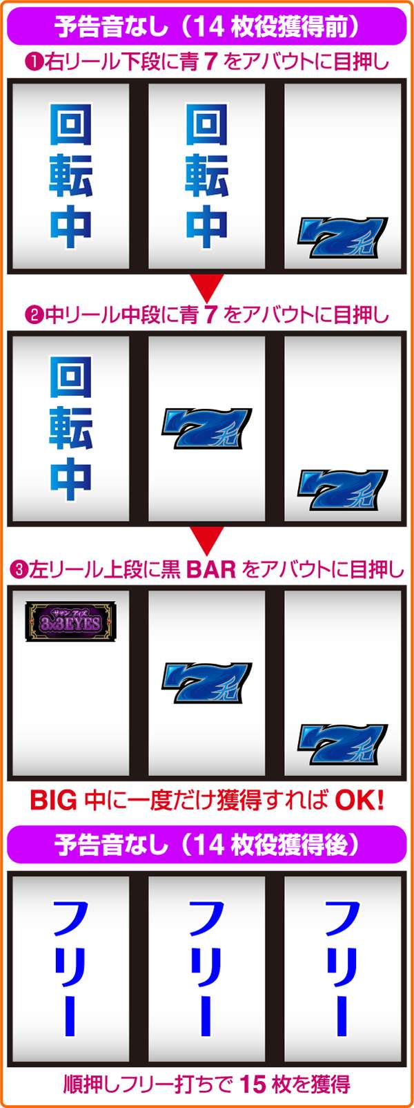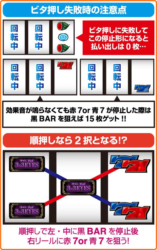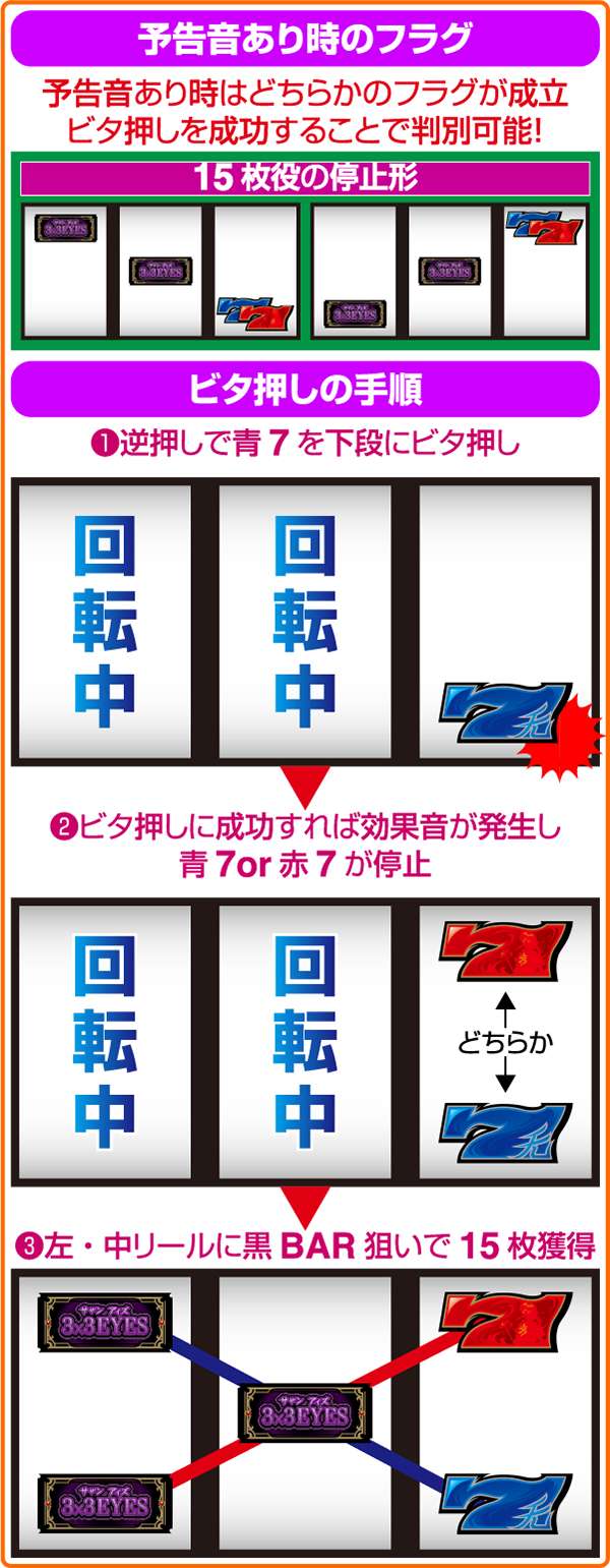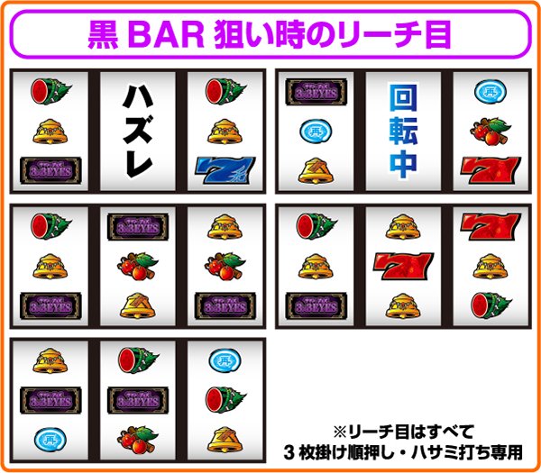 また、予告音あり時のビタ押しに成功すると効果音が発生する。ただし、効果音が発生しなくても青7or赤7が枠内に停止すれば黒BARを狙い15枚役を獲得できる。
