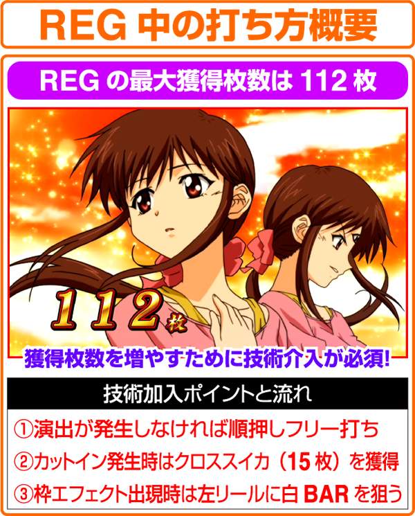 REGは12回の遊技または8回の小役入賞で終了。 演出がない場合は、ベル(13枚)確定となるため順押しフリー打ちで消化でOKだ。 基本的にベル・クロススイカ・チェリーという3種類の小役で最大獲得枚数に近づける…というのがREG中のゲーム性となる。