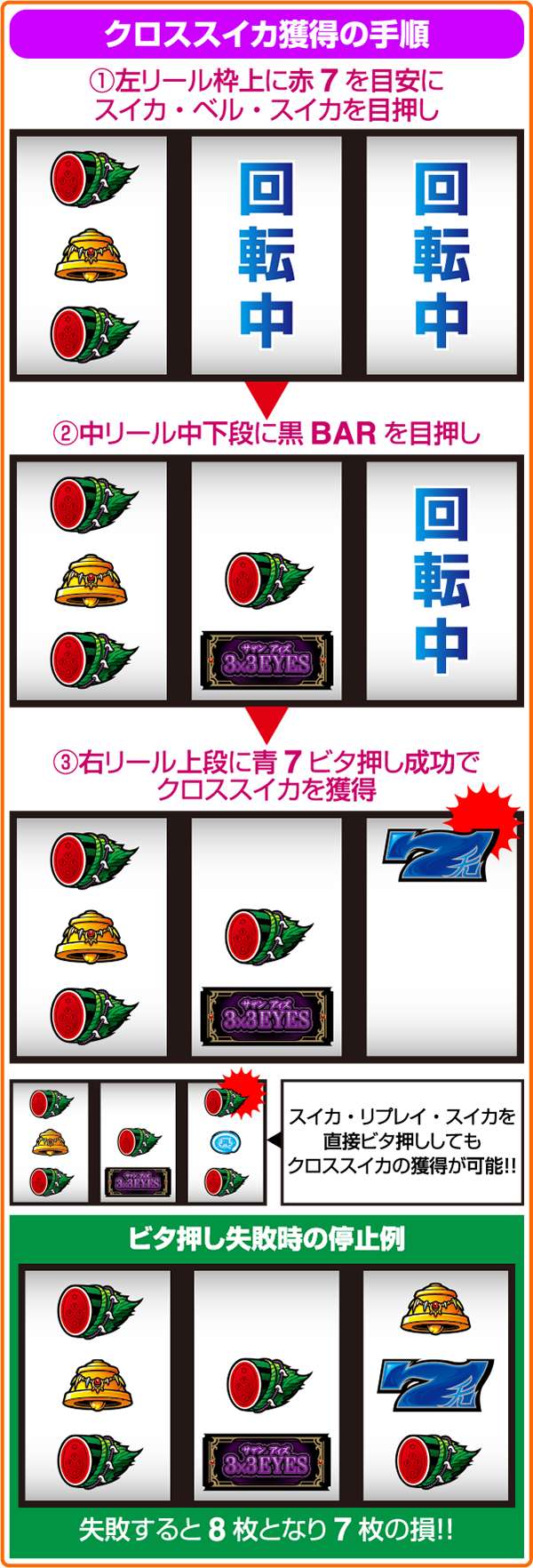 基本的にこの3つの小役で枚数を増やしていくのだが、クロススイカはビタ押しに失敗すると獲得枚数が8枚となってしまうため7枚の損。