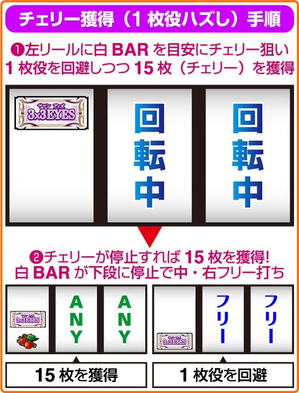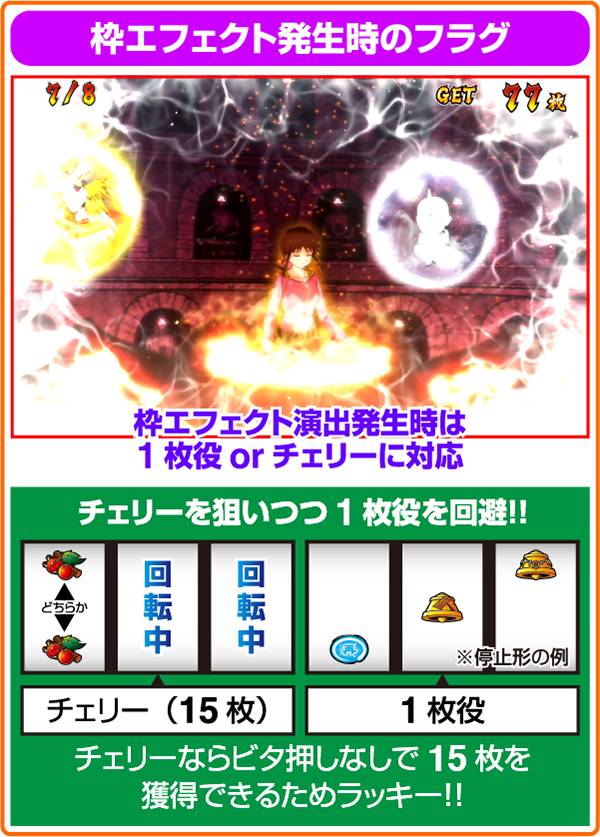 予告非発生時の注意点として、変則押しで左リールにチェリーを枠内に押してしまうと、8枚役が入賞してしまうことがある。14枚を1度獲得したら、すべて順押しで消化しよう。
