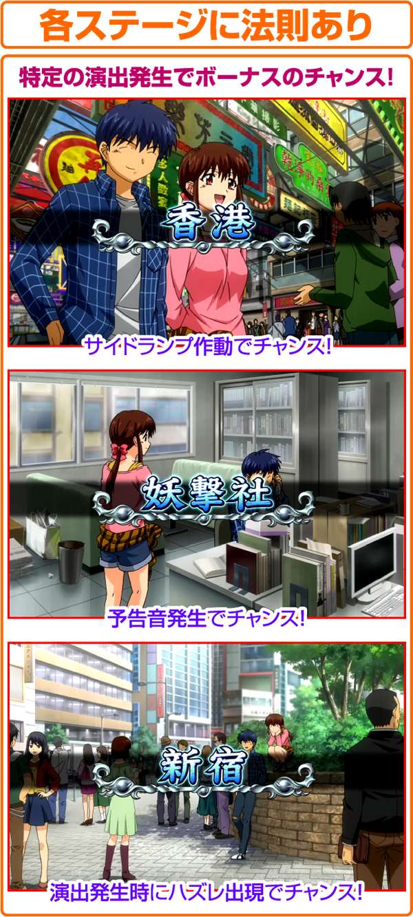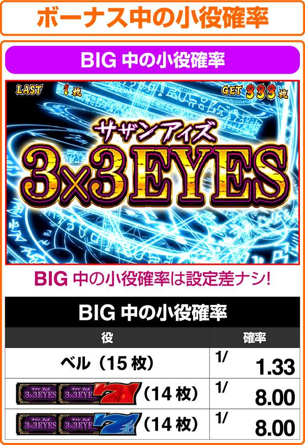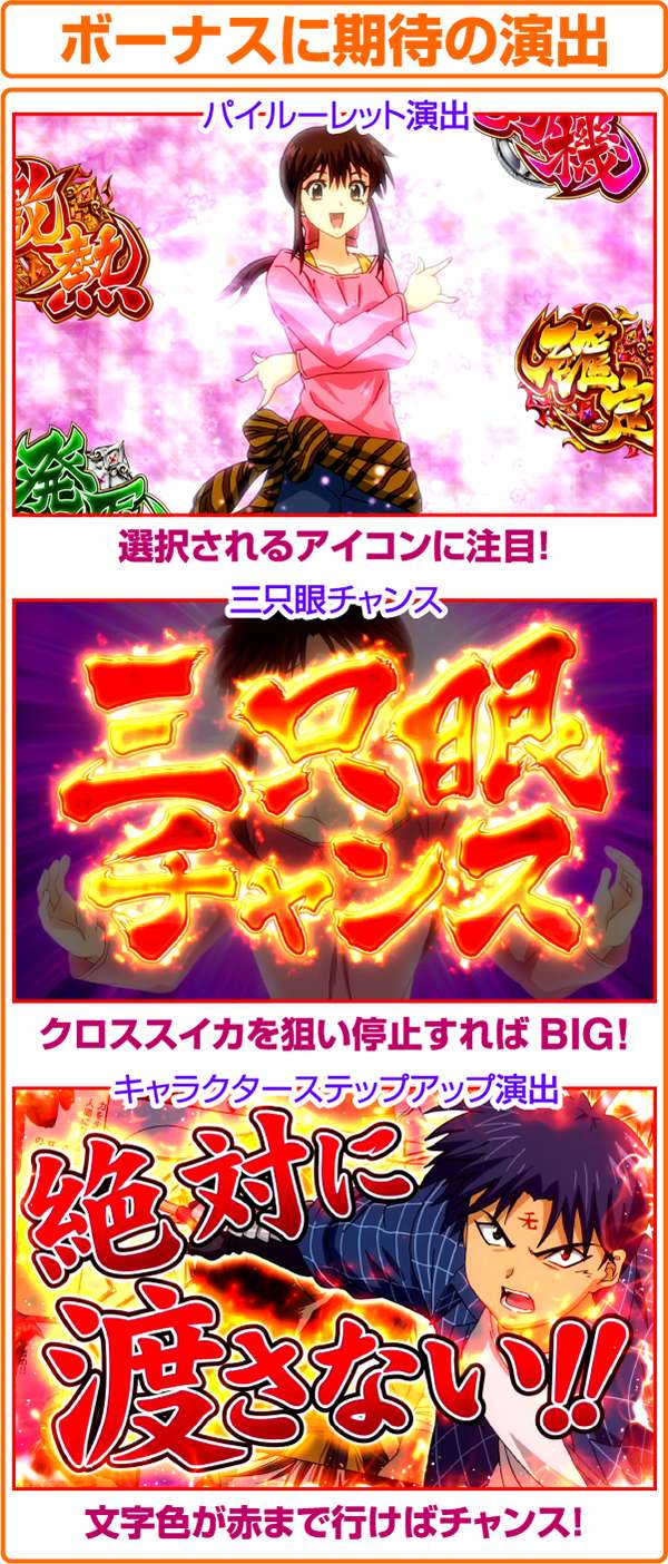 冒険ファンタジー漫画の金字塔「3×3EYES」がボーナスタイプとして登場。 ド迫力のアニメーションや林原めぐみの新曲が搭載されているなど、注目点は多数あるのだが、なかでもとくに注目したいのが技術介入度の高さだ。 RTなどの要素は一切なく、純粋に目押し力だけで獲得枚数が左右される上級者向けのスペック。 技術介入をおこなうポイントで絵柄のナビなどは発生しないので知識も非常に重要となる。 |