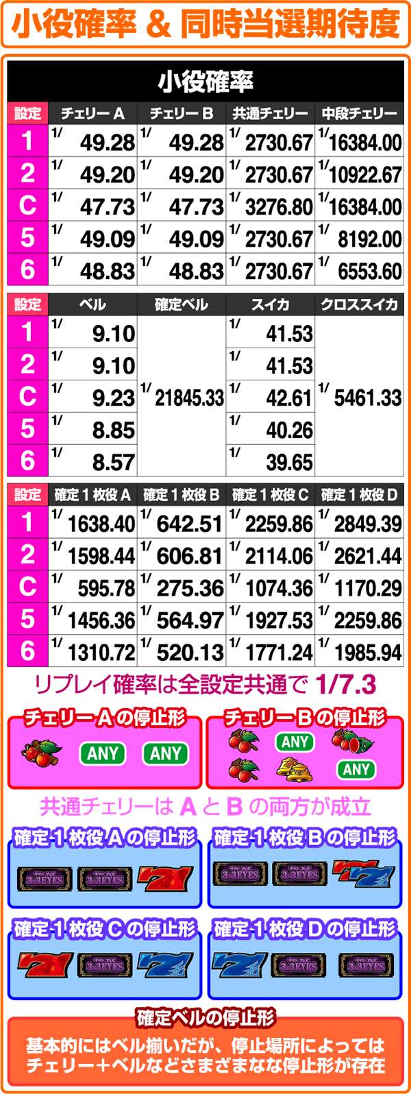 目押しが必須となるクロススイカの確率は設定Cのみ高いといった特徴を持つ。REG確率だけでなく、クロススイカ発生の頻度も設定C看破の材料として活用したい。1枚役は設定5・6・Cで出現率が高いことにも注目。