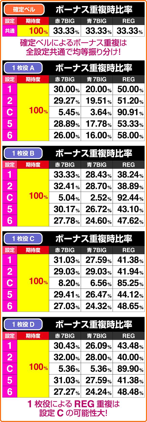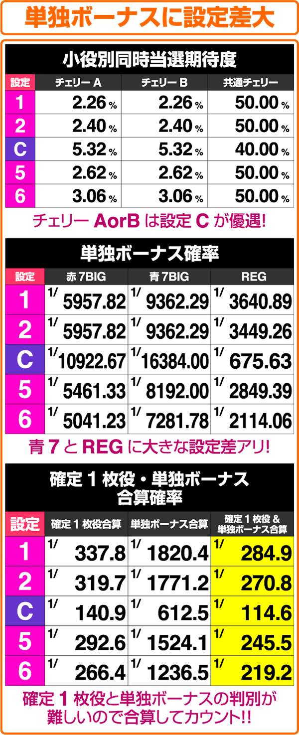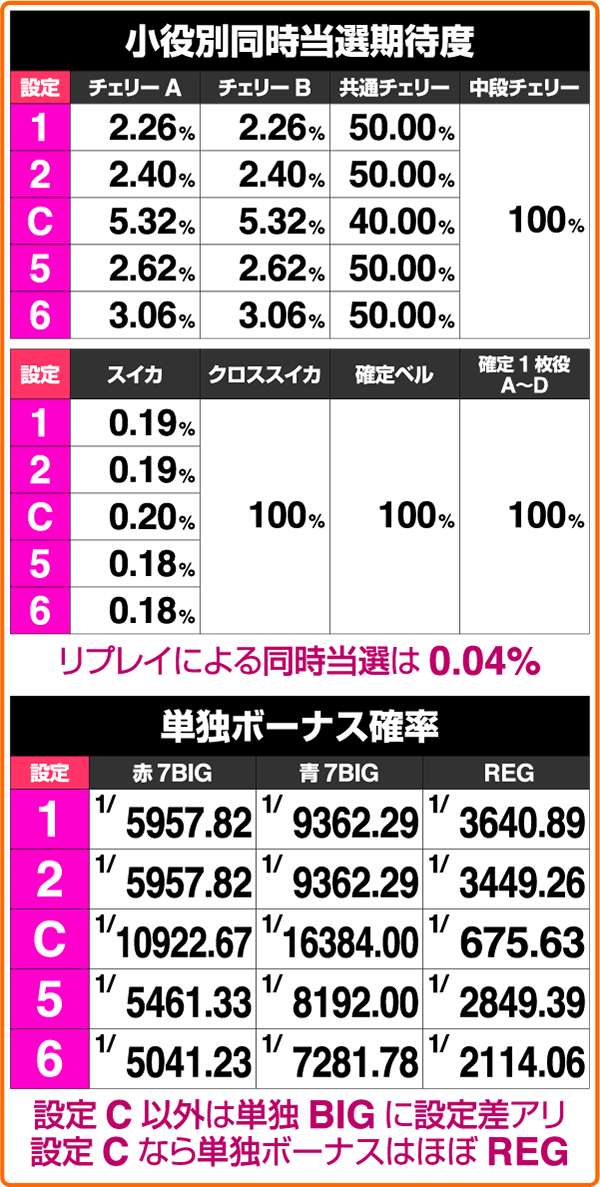 小役別の同時当選期待度は設定Cを除き、大きな差はない。注目したいのは単独ボーナスの確率となっており、設定Cは当選時の大半がREG、その他は高設定ほど確率は高い。